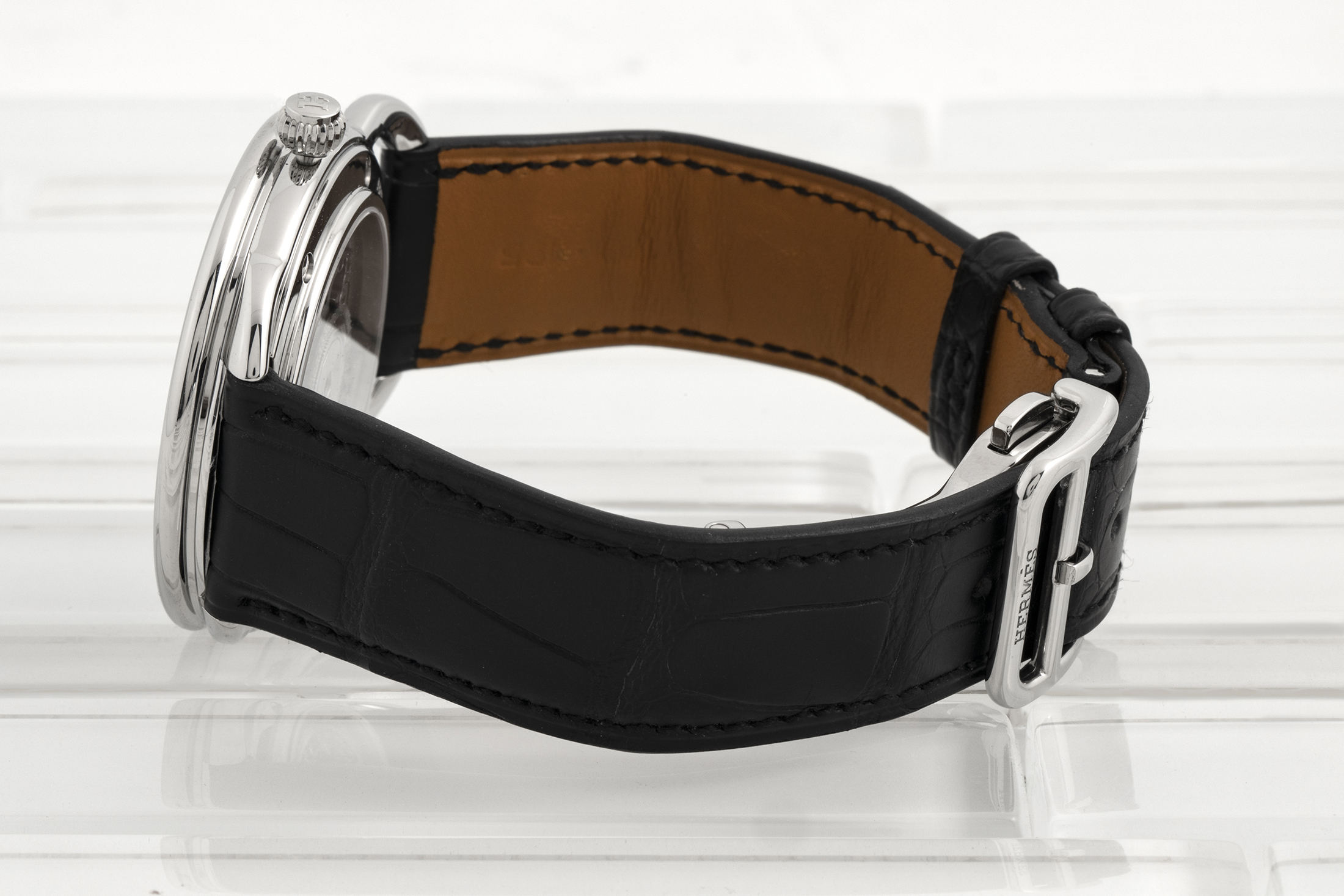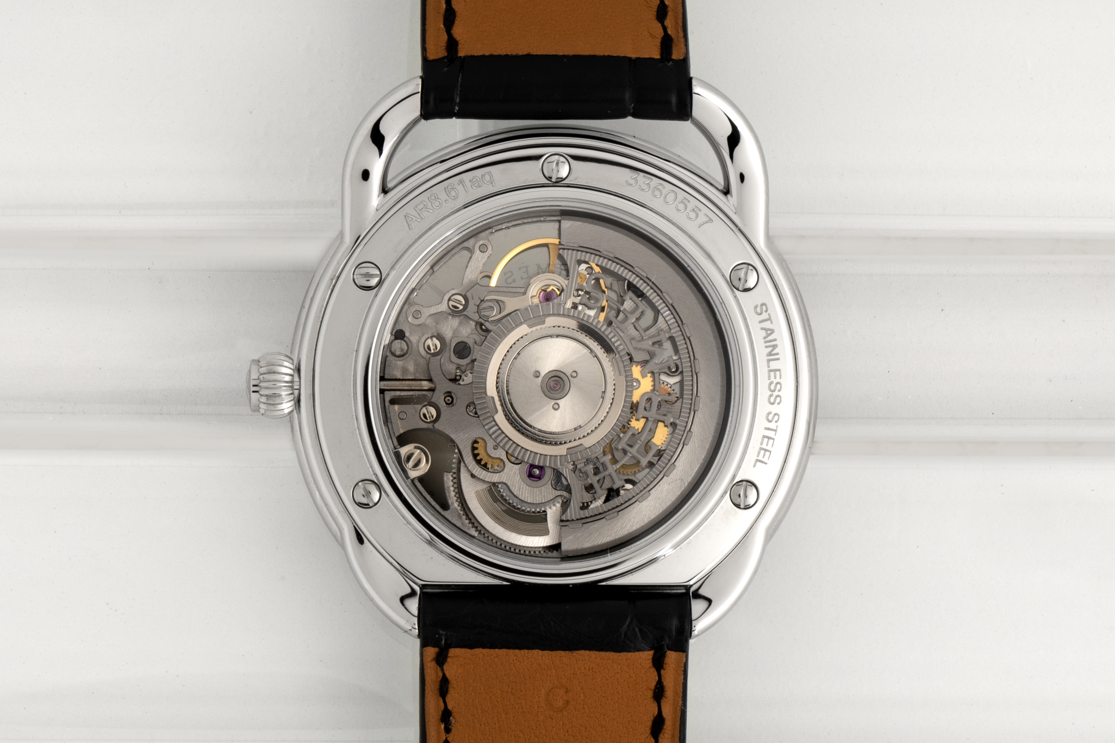 本機は、わずなデザイン変更があっただけですが、結果大きな違いとなっています。僕にとってアルソーは、軽やかな針、数字の細やかなライン、ケースのすっきりとした形など、常にある種の鮮明さをもった時計です。しかし、風防、グラデーションでスモークがかったサファイア文字盤、そしてその下にあるオープンムーブメントの多層効果が、少しの曇りと一層の深みを加えています。この時計は全く新しい次元に到達したのです。現在、エルメスのブティックで販売されており、限定モデルではありませんが、生産数は限られています。