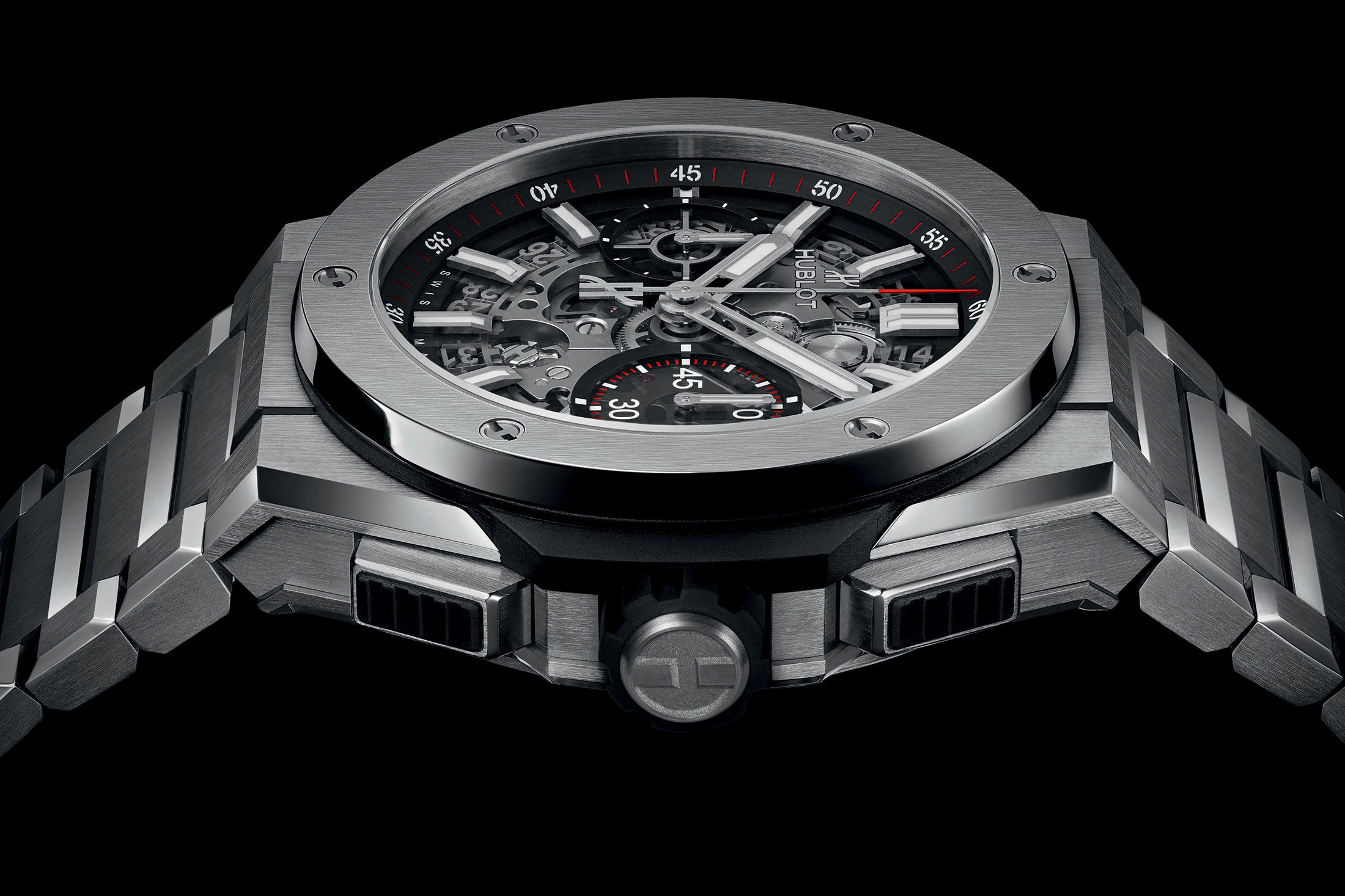ビッグ・バンのアイコニックなケースとブレスレットをシームレスにつなげるためには、少し手間がかかったようだが、全く新しい3つのモデルが登場した。唯一無いのは、SSモデルだ。チタン、ブラックセラミック、そしてキングゴールドの3種類で展開される。ビッグ・バンの角ばったシャープなデザインの美学は、3リンクの一体型ブレスレットにも反映されている。ケースは、面取りが適切な量が施されていることが見た目から分かるが、ブレスレットも例外ではない。