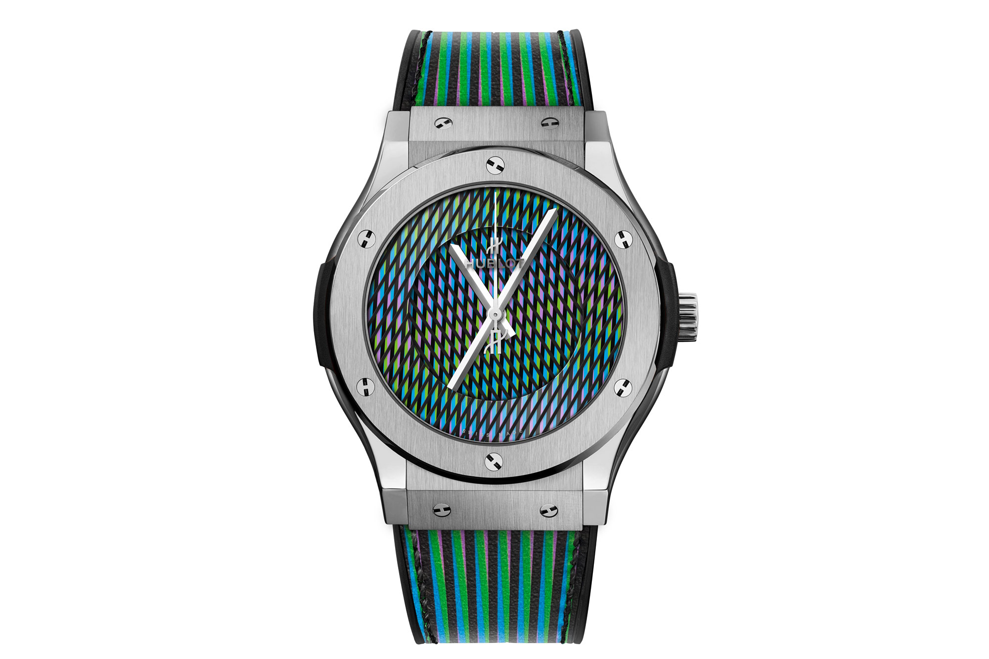クラシック・フュージョンの新作はこうした色彩の非恒久性や流動性という概念をモチーフにしている。クラシック・フュージョンの文字盤はクルズ=ディエズ1964年の作品「クロノインターフェレンス」をウブロ式に解釈したもの。それぞれがCal.MHUB1100.Hで動く独立した2枚の円盤から成っており、このカラフルな円盤が時間の経過に沿って動くようになっている。模様は時間の流れと共に変化して文字盤の見え方は全く違うものになる。正にクルスディエスが常に扱っていたコンセプトだが、ウブロはこの概念を従来の媒体から同社の代表モデルの文字盤に持ち込むことに成功した。このモデルには3タイプの素材(セラミック、チタン、キングゴールド)があり、いずれも2サイズ(ケースサイズ38mmと45mm)で展開される。