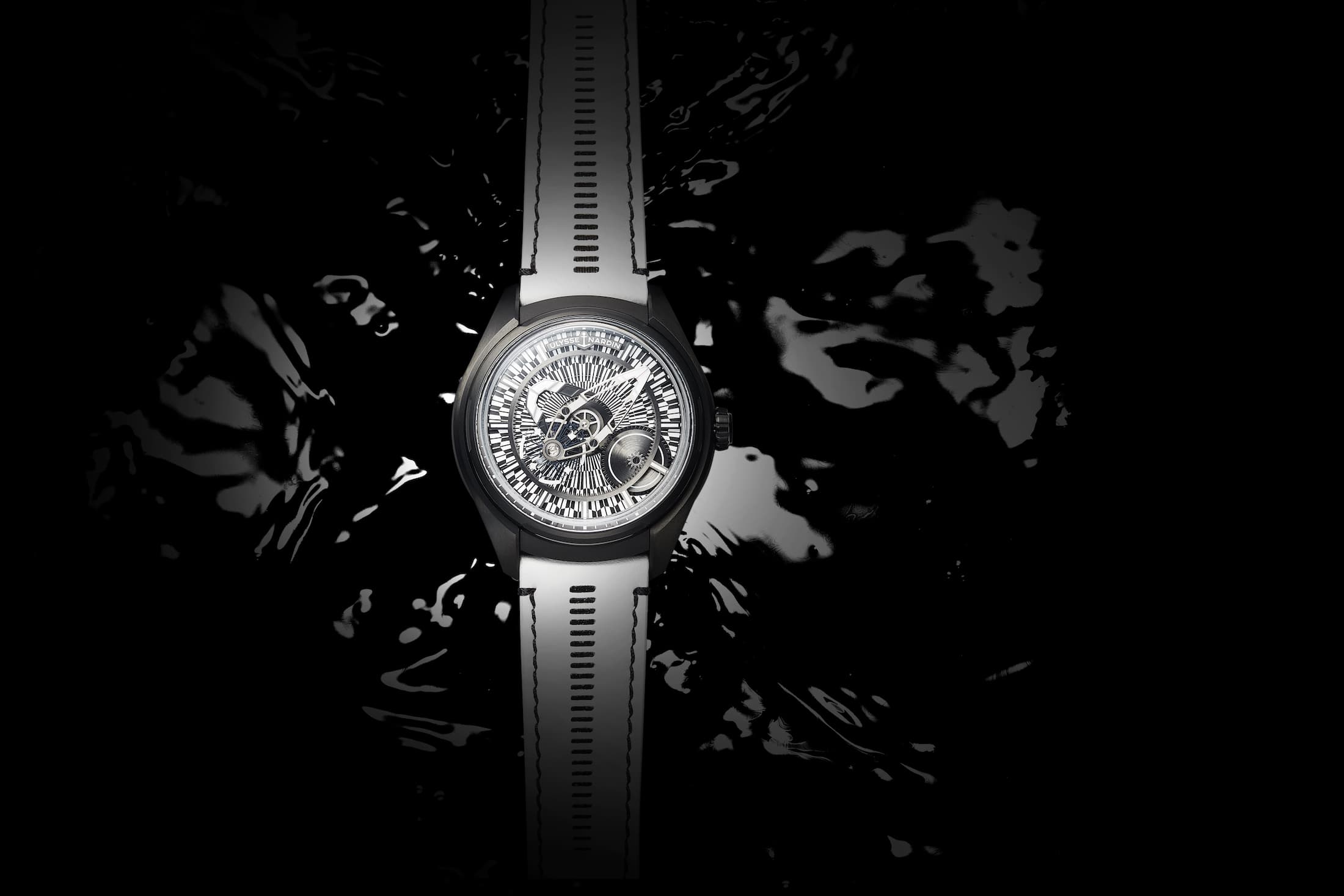 ブラックDLCのチタンケース、直径 43mm。自動巻きCal.UN-230、シリシウムヒゲゼンマイ。72時間パワーリザーブ。フライングカルーセル。限定30本。