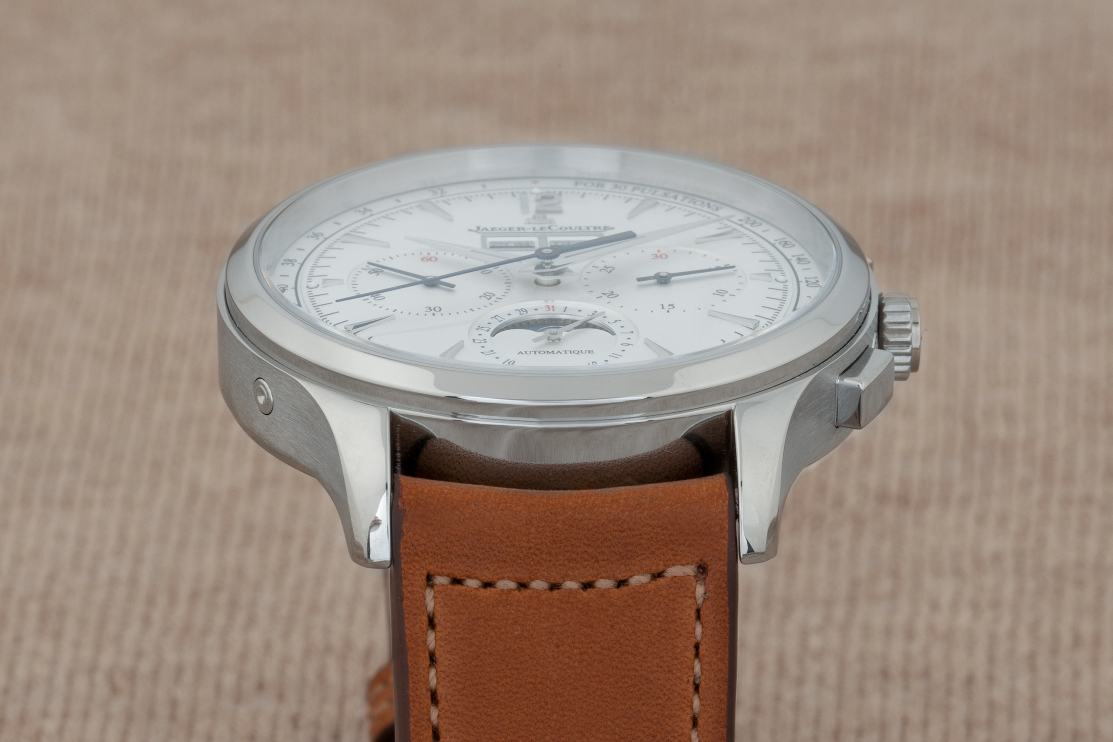 マスター・コントロール・クロノグラフ・カレンダーの文字盤は、非常に美しく、よくまとまっていると思う。特に奇をてらったものは一切なく、ただただ、しっかりとした、明快なデザインが施されている。本機は、1950年代の紳士用複雑時計と間違えられるかもしれないが、現代性を感じさせるのは、ダイヤル上の文字のプリントとインデックス等のはっきりした作り、そしてムーンフェイズ表示のディスクの背景に配された星の鮮明さである。文字盤は、JLCがやらないと決めたことと同様に、やると決めたことが徹底されていると思う。私がダイヤル全体について抱いた唯一の小言は、白いダイヤルに対して、高度に研磨された時針と分針が時々わずかに識別しにくいことだが、手首の上における実用性や判読性の面で致命的な問題だと考えることはついになかった。