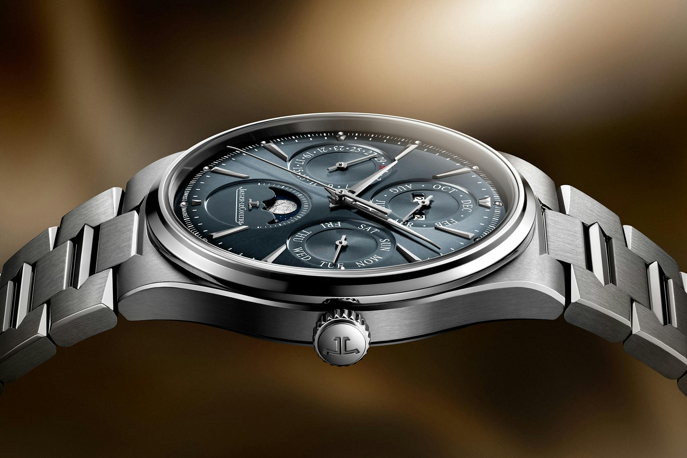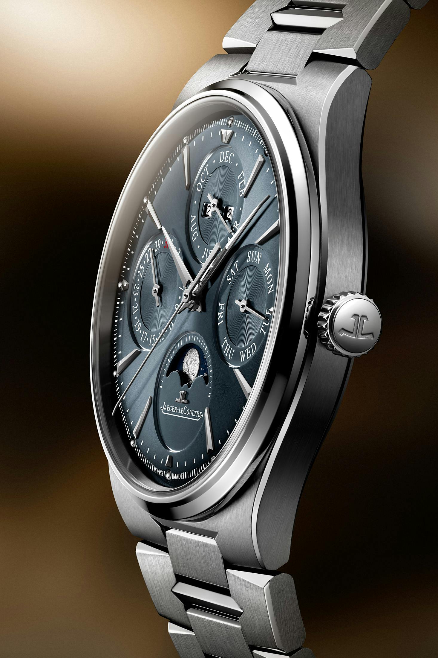 SS製モデルでは、サンレイ仕上げのダイヤルはクールトーンのブルーグレーのグラデーションで、同色のアジュール仕上げの4つのインダイヤルが配される。オパーリン仕上げの文字や目盛りがそれらを縁取る。12時位置のインダイヤルには月と年、3時位置には曜日、9時位置には日付、6時位置上のインダイヤルには槌目加工により刻まれたムーンフェイズとジャガー・ルクルトのロゴが配置される。針とインデックスはSS製のドーフィン型で統一されている。