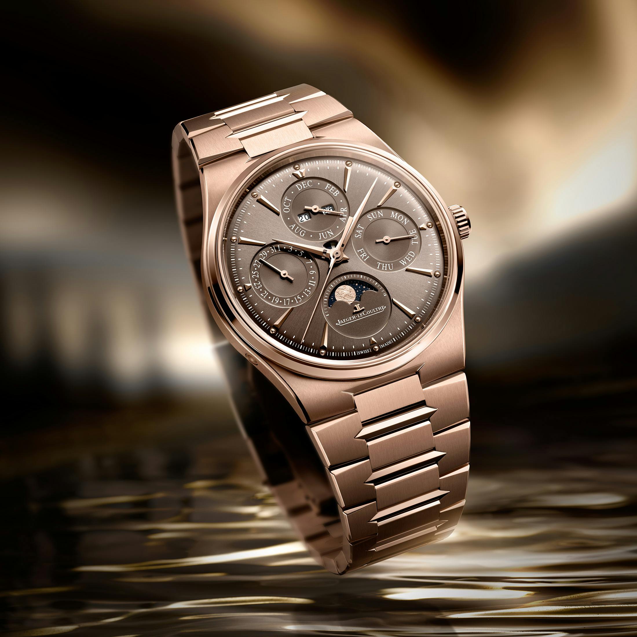 新作の主役となるのは、ステンレススティール(SS)とピンクゴールド(PG)で展開されるマスター・コントロール・クロノメーター・パーペチュアルカレンダーだ。直径39mm×厚さ9.2mmのケースは、シャープな角ではなく緩やかなカーブを描く点が特徴だ。ポリッシュ仕上げのベゼルとエッジが、サテン仕上げのケースと対比をなす。