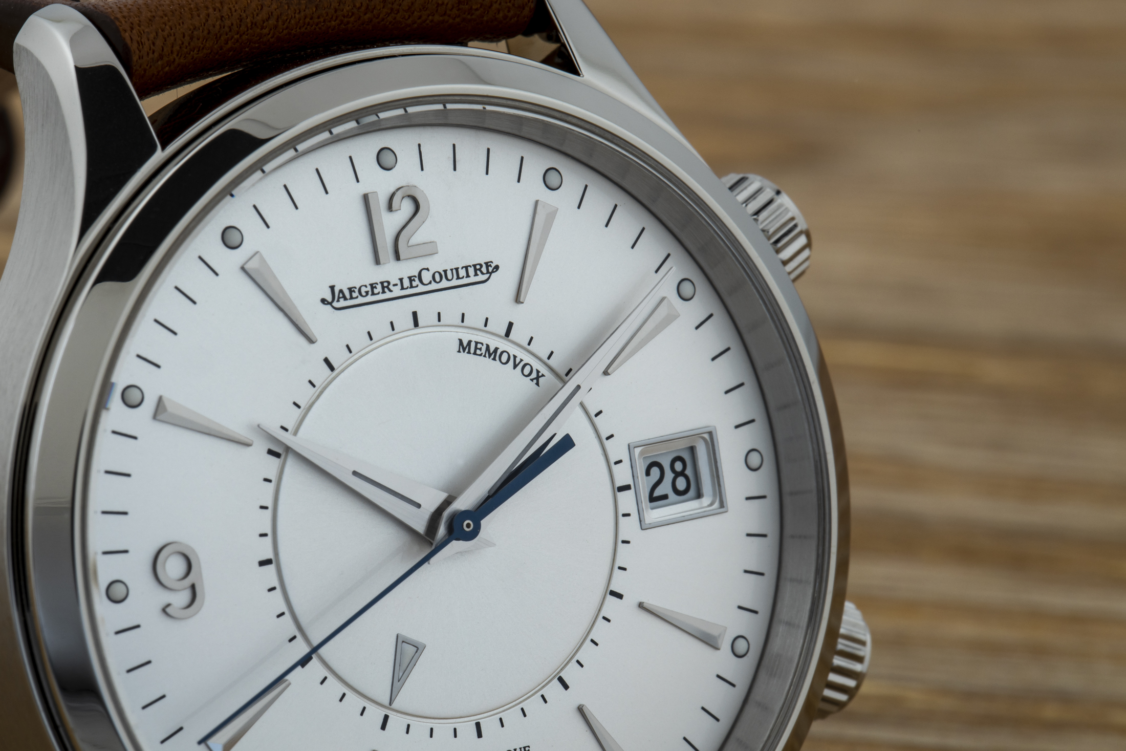 今回ご紹介するマスター・コントロール・メモボックス(タイマーなし)のスタンダードモデルは、比較的渋いシルバーの文字盤に、アプライドされた数字と夜光塗料を塗布したインデックス、3時位置に枠付きの日付窓を備えている。ドーフィン型の時分針には、スーパールミノバが施された細い溝がある。これは、スポーツウォッチほど明るいわけではないが、その輝きは高く評価されている。メモボックスの最大の特徴は何といってもアラーム。ナイトテーブルに置き、眠りから覚ましてくれる時計に必要な要素だ。