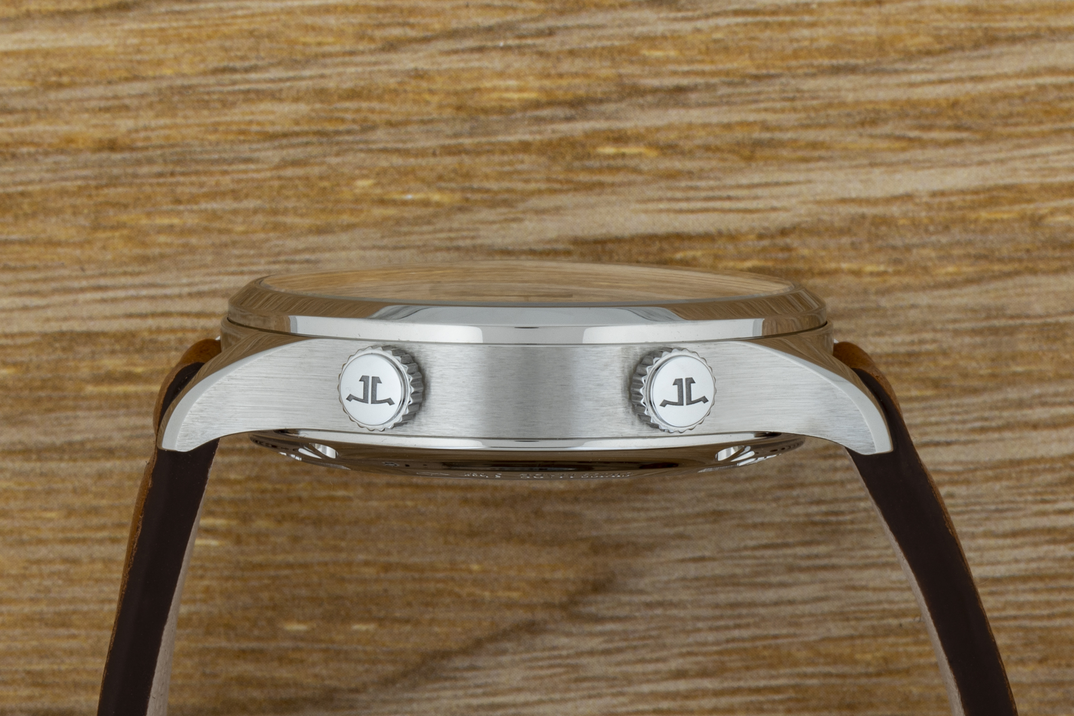 全体的に新しくなったマスター・コントロールシリーズは、エレガントな曲線と面取りされたラグを備えた直径40mmのケースが魅力的なフォームファクタとなっている。それから、厚さの面では若干の違いはあるものの、少し分厚くなったと感じる人はいないだろう。マスター・コントロール・メモボックスのケースは、自動巻き、日付窓、アラーム機能を、50m防水の厚さ12.39mmのSS製ケースに搭載。そのケースデザインはミッドセンチュリー・ヴィンテージの雰囲気をもっている。しかし、実際のプロポーションは、現代の時計サイズの中では控えめな、ちょうど良いサイズと呼ばれる範疇に収まっているだろう。