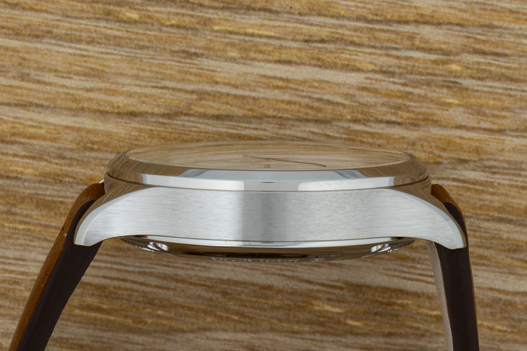 この時計で唯一ある色のタッチは、ブルースティールの秒針だけ。ダイヤルはバランスのとれたプロポーション、すっきりとしたデザインで、視認性の高さは私の中では満点だ。本機のデザインのいくつかには、例えば日付窓のように非常に反対的な意見を煽るものもある。この時計はもちろん、非常に目立つものを持っている。この時計にはもちろん日付窓があるが、枠が付いておりとても目立つデザインになっている。これには、通常日付擁護派である私としては拍手喝采を送りたい。日付表示があるなら、隠す必要はないと気付かされたのだ。