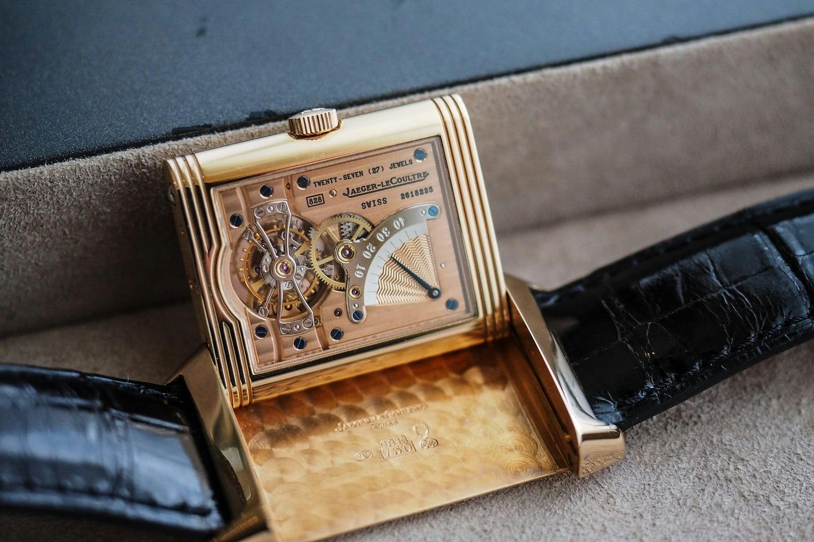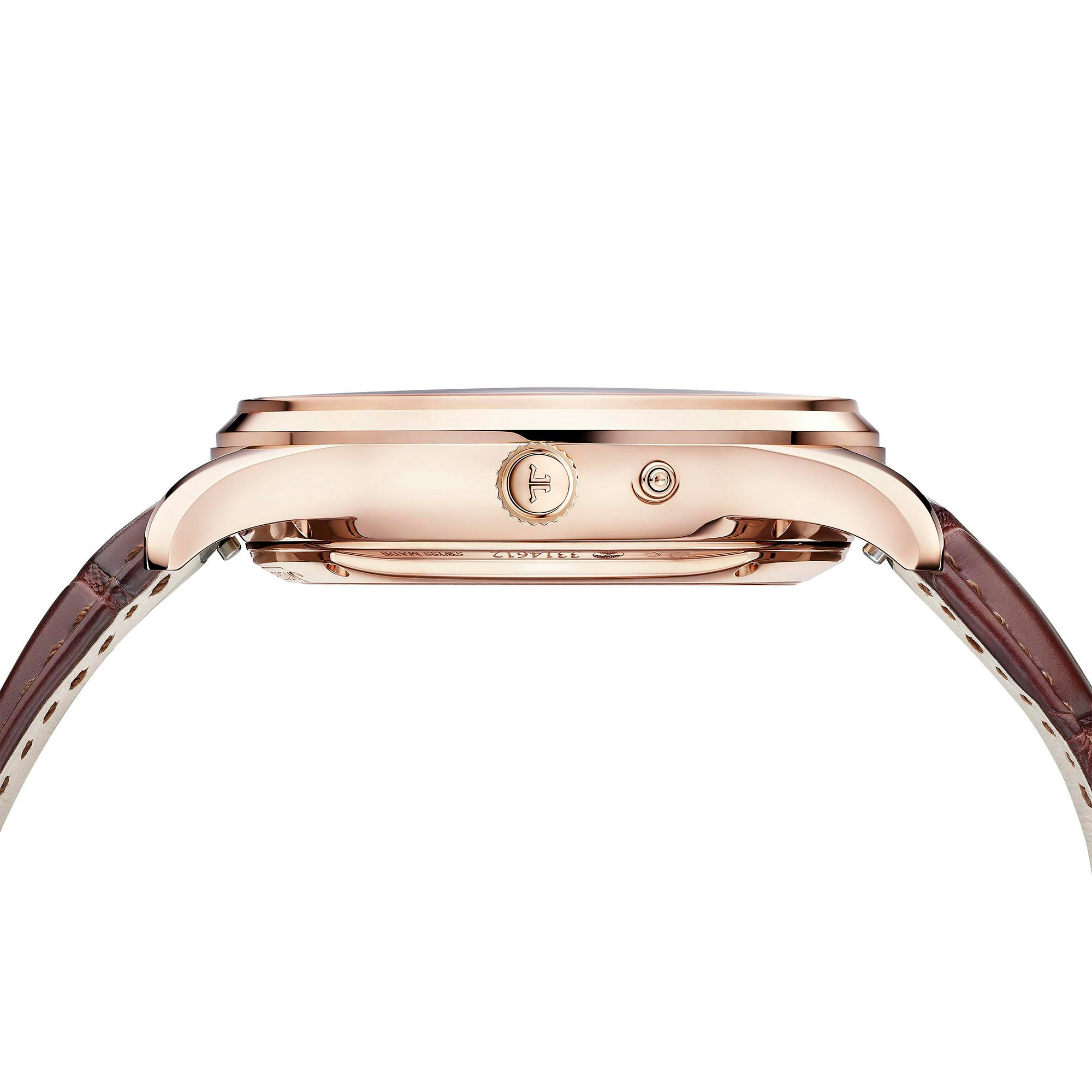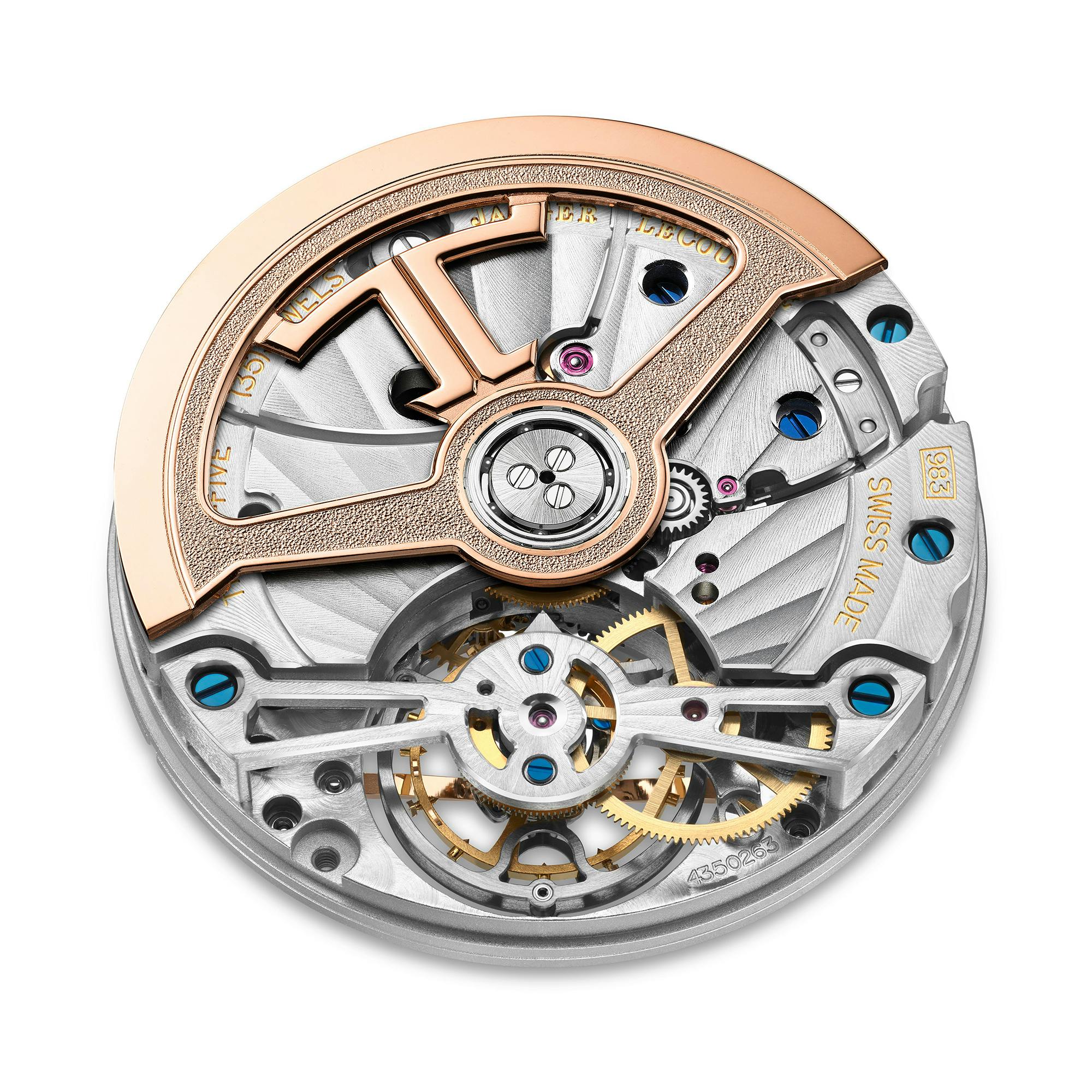 かなり古典的な形式の複雑なトゥールビヨンだ。ローズゴールドの丸いケースのサイズは41.5mm×12.1mmで、この10年ほどの間に登場した極端にフラットなトゥールビヨンムーブメントの数々(そしてもちろん、ブルガリ オクトフィニッシモ トゥールビヨン オートマティックを頂点とする)を考えると、これは特に薄いとは思えない。ケースはジャガー・ルクルト独自のグランド・ローズゴールド合金で、腐食や変色を防ぐために少量のパラジウムが添加されている。(2005年にロレックスがエバーローズを発表して以来、時計業界では白金族元素の金属を安定化させたローズゴールド合金の人気が高まっている)。