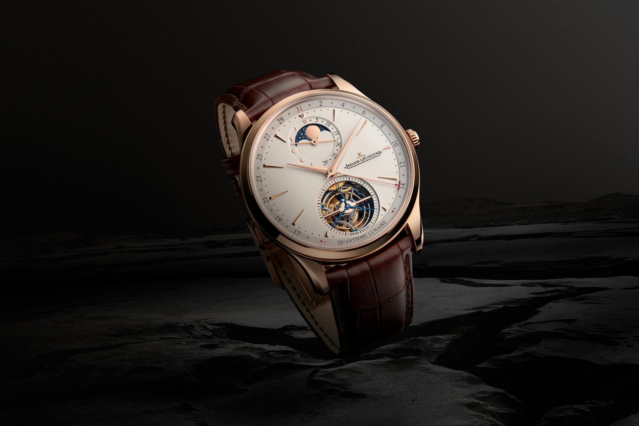 ジャガー・ルクルト マスター ・トゥールビヨン ・ムーン:ケースはジャガー・ルクルト製グランド・ローズゴールド、41.5mm×12.1mm、5気圧/50m防水。ムーブメントはジャガー・ルクルト製Cal.983AA、フライング・トゥールビヨン、北半球と南半球の月の満ち欠け表示、ジャンピングデイト表示( 15日から16日へ)。フルローター自動巻きムーブメント、パワーリザーブ45時間。価格は936万円(税抜)。発売中。詳細はジャガー・ルクルトの公式サイトをご覧ください。