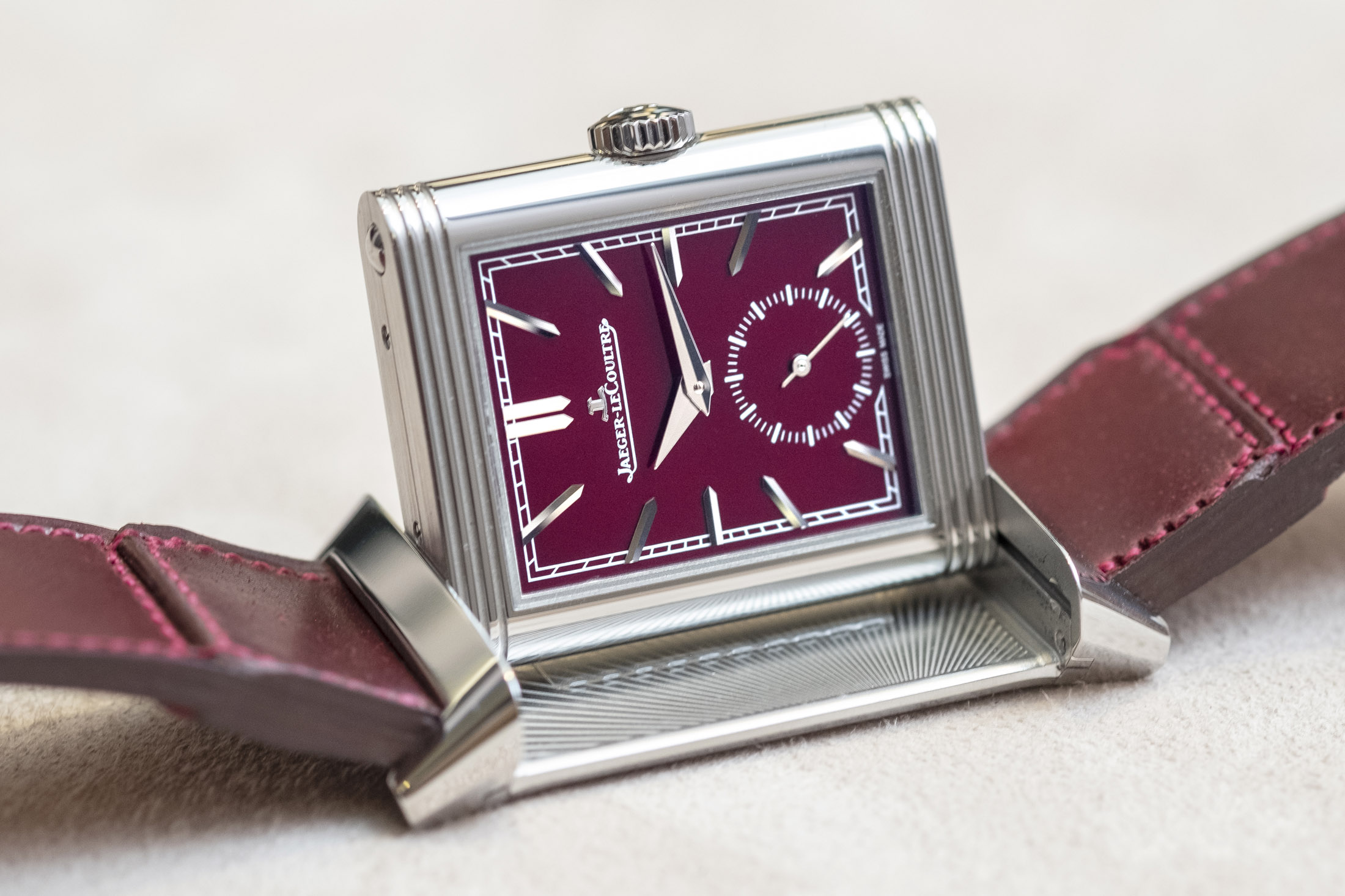 厳密にいうともう新作とはいえないが、今回紹介するこのレベルソは私のお気に入りである。なぜなら、文字盤とカーサ・ファリアーノ社製のストラップが醸し出すこのバーガンディ色を見れば自明だろう。カーサ・ファリアーノ製ストラップとダイヤルカラーとをマッチさせたモデルでブルーのバリエーションは昨年既に発売されているが、今私の目に留まるのはこのバーガンディモデルだけだ。