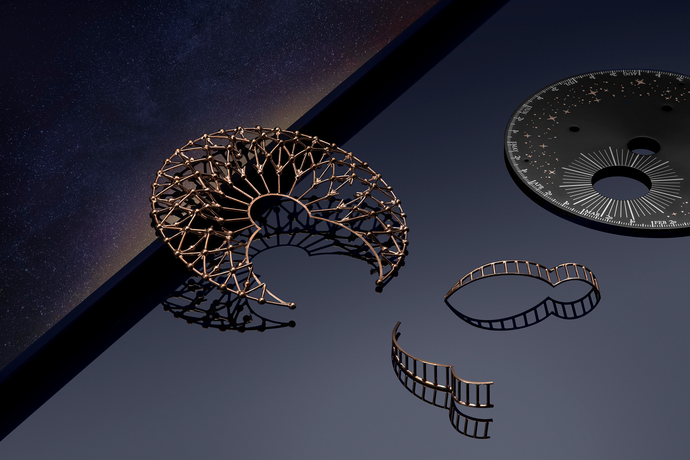 マスター・グランド・トラディション・グランド・コンプリケーションは、狭義のグランドコンプリケーションではないが、実際の時計を見れば、それはほとんど問題ではないように思える。基本的には、ミニッツリピーターとオービタル・フライングトゥールビヨン、そしてプラネタリウム星図を組み合わせたもので、1日に1回(反時計回りに)、いや、恒星日に1回転する。太陽日は、太陽が2回連続して天頂を通過するまでに経過する時間で決まり、平均すると24時間になる。一方、恒星日は、黄道面が天体の赤道と交差する点である、春分点として知られる空の基準点の通過に基づいている。この点は、基本的には、基準点として恒星を使用するのと同等である。そのため1日をマークするために使用する場合は、24時間よりもやや短くなる―恒星日は約23時間56分4.0905秒の長さである。恒星日は空の星の位置を直接反映しているため、天文学者に好まれる基準時間だ。