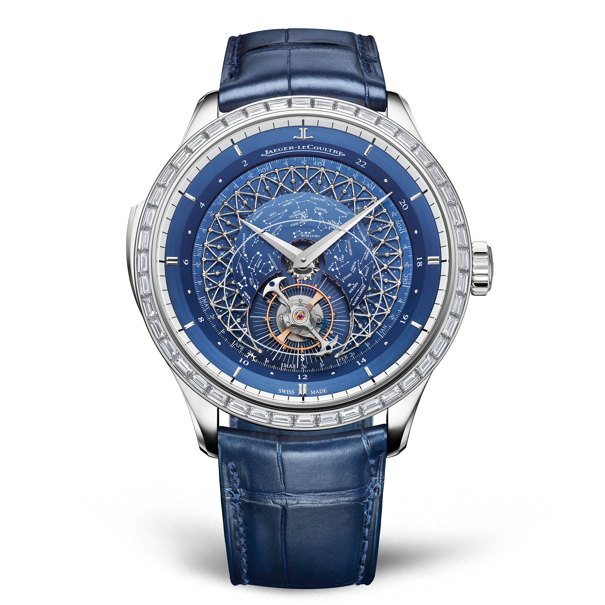 ジャガー・ルクルト マスター・グランド・トラディション・グランド・コンプリケーション: ケース、ホワイトゴールド(バゲットダイヤモンドベゼル付き)またはローズゴールド; 防水性 5気圧。直径45mm x 厚さ16.05mm、表と裏にサファイアクリスタル。ムーブメント: 自社製Cal.945(総部品数570)、50石、40時間パワーリザーブ。オービタル・フライングトゥールビヨン(1恒星日で回転)、ジャガー・ルクルト本社の緯度である北緯46°から見た北半球の夜空の星図。常用時。各世界限定8本。価格: ローズゴールド 税抜4000万円、ホワイトゴールド 4960万円(時価: 2週間ごとに為替によって価格が変動)。詳細は、ジャガー・ルクルト公式サイトへ。