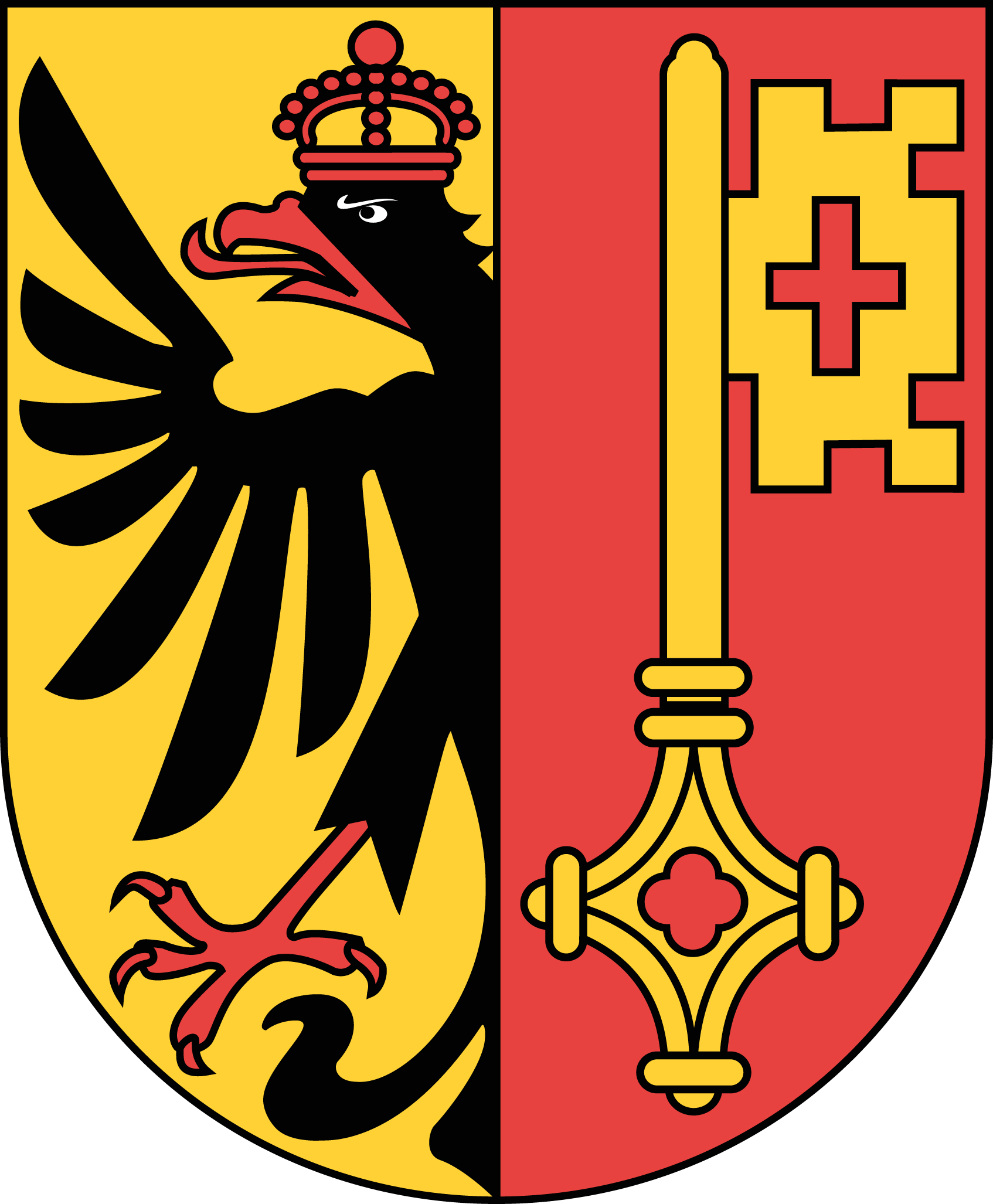 "Per pale or and gules, dexter: a dimidiated eagle displayed issuant from the partition sable, crowned langued beaked, membered and armed of the second; sinister: a key in pale upward contourné gold."