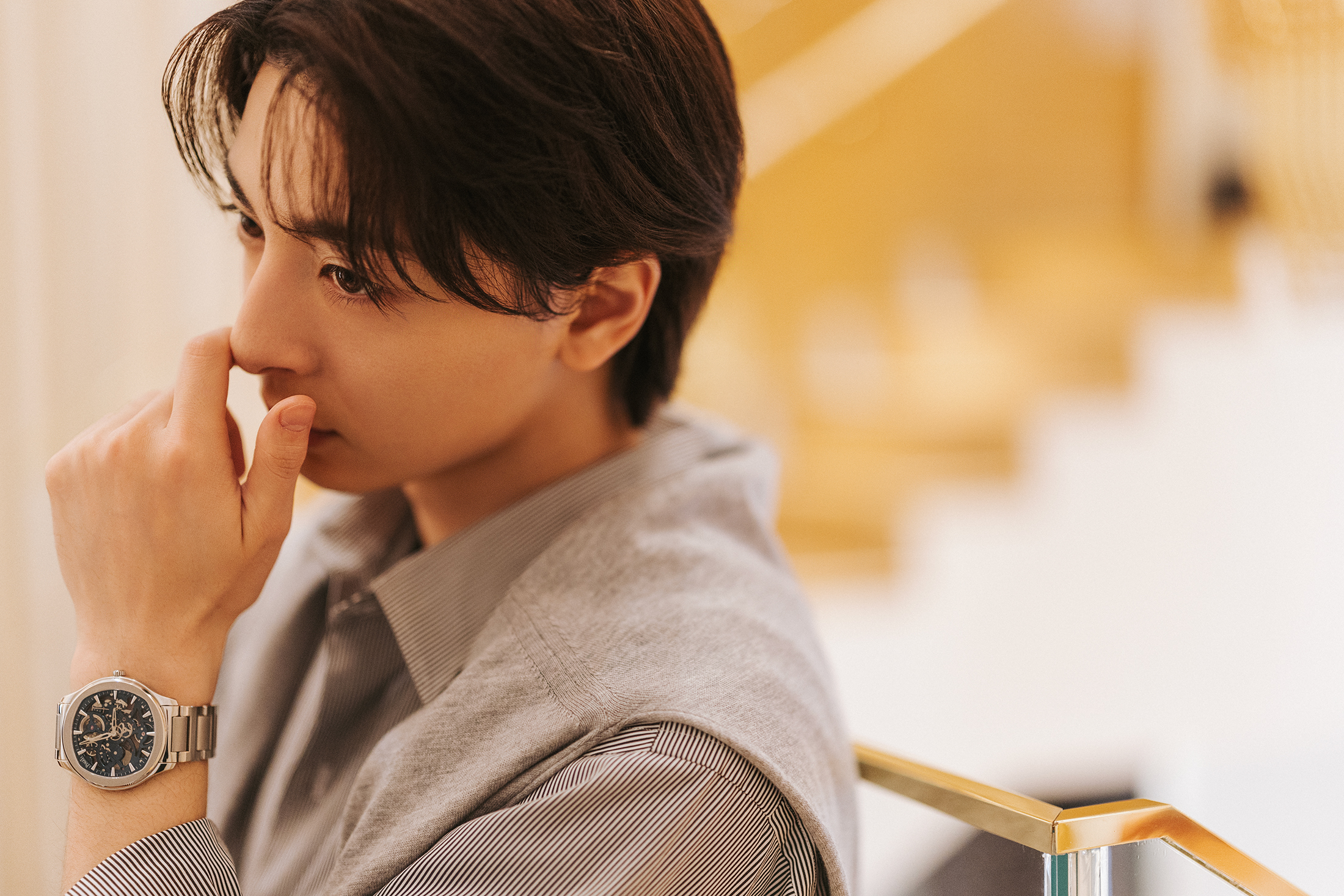 ピアジェにとっていかなる技術革新も実用性を前提にする。とくに普段使いのラグジュアリースポーツウォッチを標榜するピアジェ ポロ スケルトンでは、セラミックをメゾンで初採用した。軽量かつ耐傷性に優れた先進素材に加え、防水性も従来の3気圧から5気圧に向上し、よりモダンなスタイルと実用機能を併せ持つ。「全然印象が変わりますね。このなかでも一番男っぽい。それでいてすごく軽い。僕にとってのピアジェのイメージも大きく変わりました」と高まるメゾンへの関心を語った。