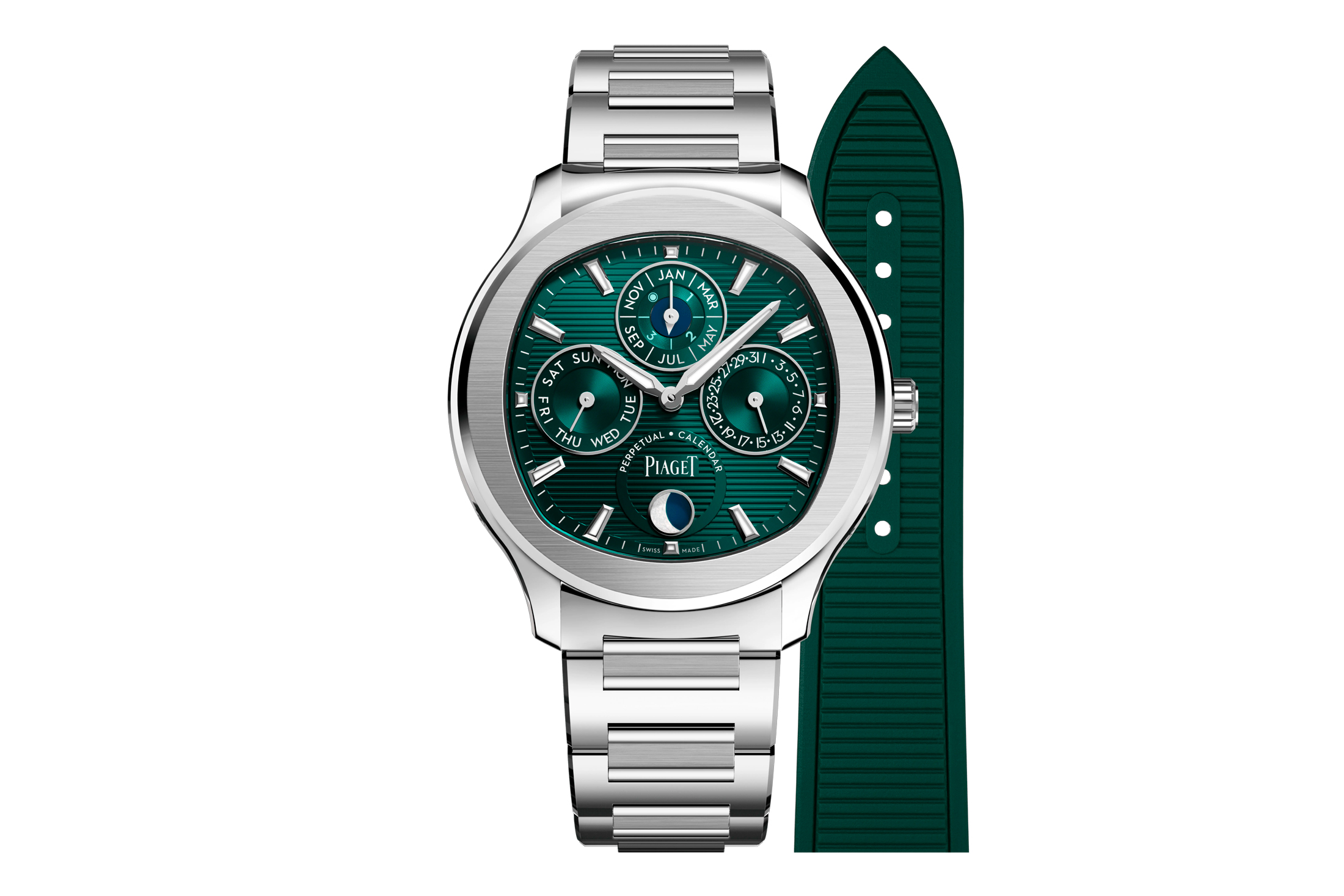 優れた装着感にはショートラグなどジュエラーで培ってきたノウハウが生かされている。さらに注目したのが着脱式ブレスレットだ。ストラップとも容易に交換でき、用途や気分に合わせて異なるスタイルが楽しめる。これも永久カレンダーという複雑機構を気負うことなく日常的に使い、醍醐味を十分に味わうための仕様だ。