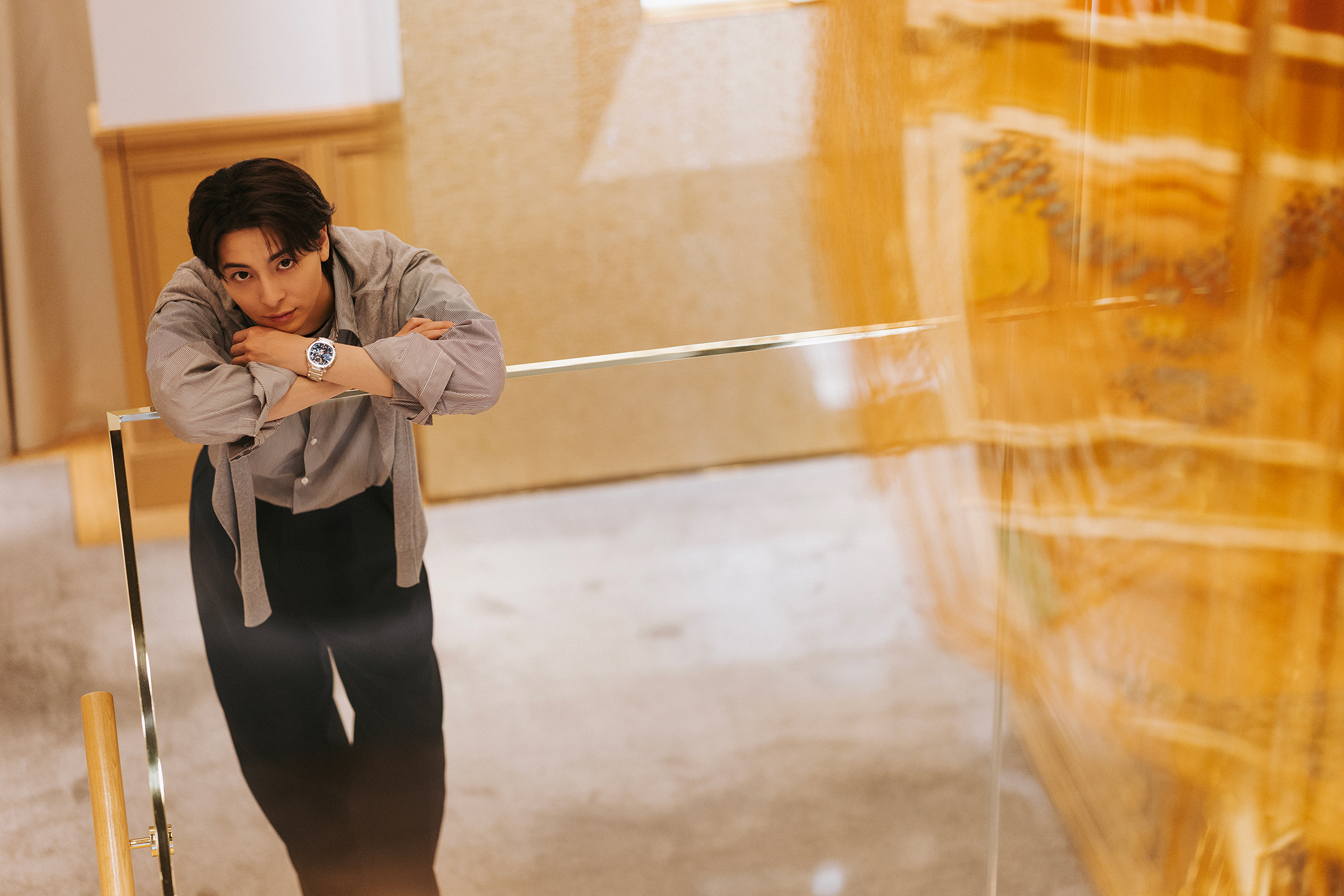 ピアジェ 銀座本店を訪れた高杉真宙さんは、優美なメゾンの世界観に目を輝かせた。そして店内に展示された歴代アーカイブや壁面の広告ポスターを熱心に見つめて言う。「ピアジェには、どちらかというとジュエリーのイメージが強かったのですが、こうして見ると時計が先だったのですね。これは発見です。それでもジュエリーと時計が乖離するのではなく、間にある繊細さが伝わります」と語る。その腕に着けられているのはピアジェ ポロ スケルトンだ。「本当にピタッとはまっているような感じで、着けている感覚がないというか。多分、薄さもありますし、軽さが理由なのでしょうね。自分との一体感を着けた瞬間にすぐ感じられ、いい時計だなと実感します」