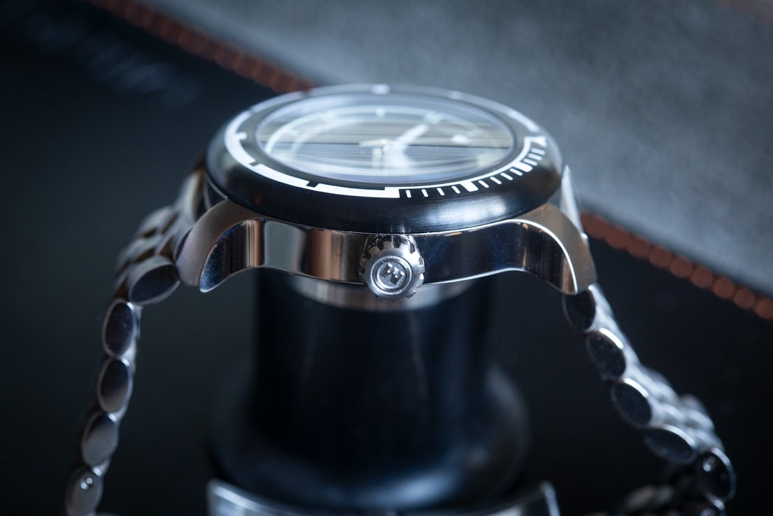 ベゼルのもう一つの用途は、ゼロ位置の逆三角形を分針の位置に最も近い5分のマーカーへと回すことによって、時間の設定に役立つということだ。搭載されるムーブメント ETA 2824は5姿勢で調整されているが、ダイヤル上のミニッツマーカーなしで正確な"分"に時計を設定するにはある程度推測が必要だ。視覚的な参照としてベゼルを使用すれば、分針の実際の位置を明確にするのに役立つだろう。