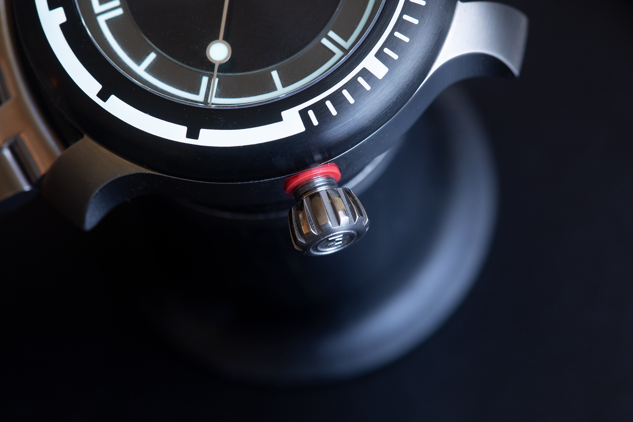 この時計がもつ多くのイカした点の一つは、視覚的なインジケーターだ。リューズが締められていないと現れる、リューズチューブの周りにセットされた真っ赤なガスケットは、実用的なだけでなく(リューズがゆるんだ時計でダイビングをすると、ケースに浸水してしまう可能性がある)、見ていて楽しいし、不意に深さ3000フィートの水中へと瞬時に潜りそうな印象すら与える。