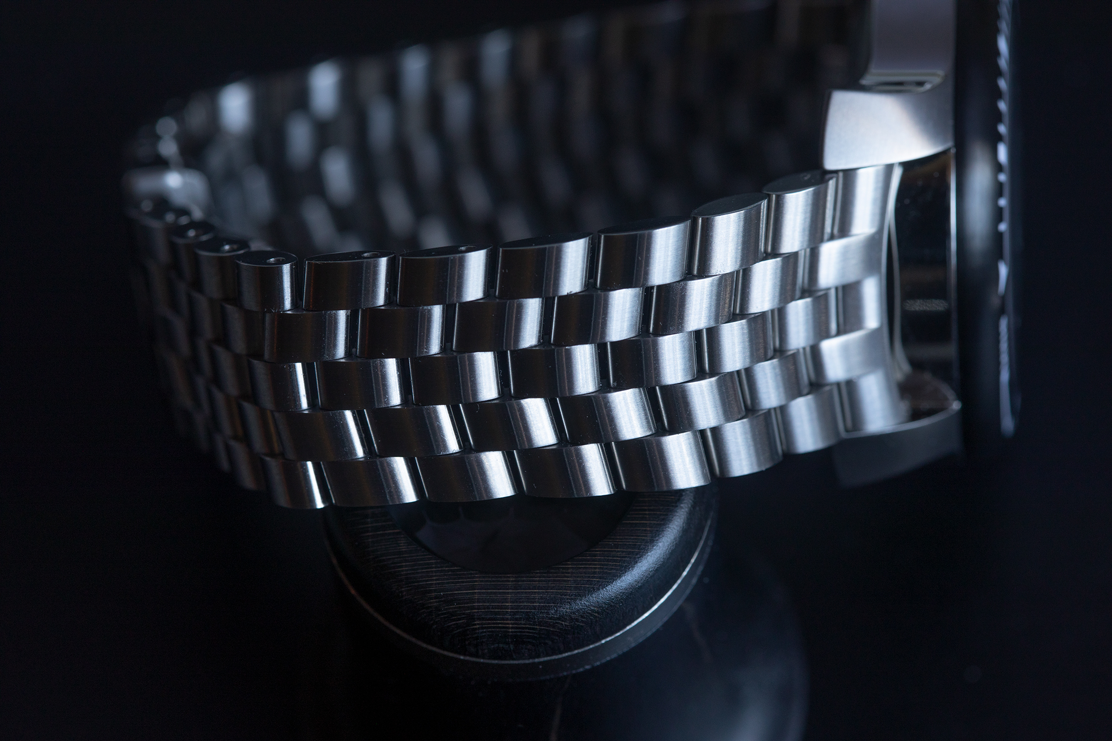 ブレスレットにはグレード5のチタンを使用し、ベゼルとケースバックには表面を少し荒くした加工が施されたことで、ベゼルの回転を容易にし、濡れた腕やウェットスーツの袖でも時計が滑らないようにしている。私はダイバーではないが、もしそうだったら、おそらく微調整できるクラスプが欲しかったと思うだろうが、それがなくても良い点を言うと、非常にエレガントでシームレスなブレスレットであることが挙げられる。