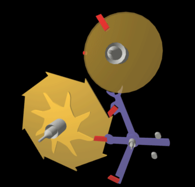 コーアクシャルエスケープメントの動きは、最初は非常に難解に見えるかもしれない。ただ、アニメーションでも分かりにくいと感じたら、それはあなただけではないと信じていただきたい。エスケープメントには2つのガンギ車(斜線状の歯が、小さめのものと大きめのもの)がある。両方とも同じ軸上にあるので、コーアクシャル(英語で同軸という意味)と呼ばれている。テンプ(下のアニメーションでは右上にある)が時計回りに回転すると、テンプローラーの上に乗った小さめの石がガンギ車のロックを解除し、同時に、大きい方の歯が、大きい方のテンプのインパルスジュエルピン(小さなルビー製のピン)を介してテンプに推進力を直接与える。