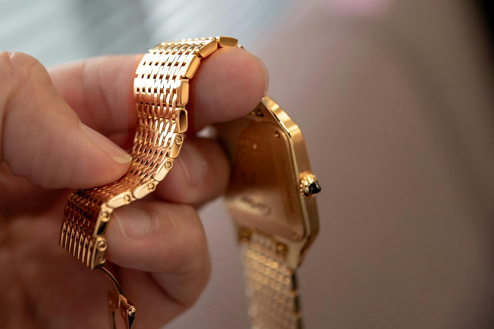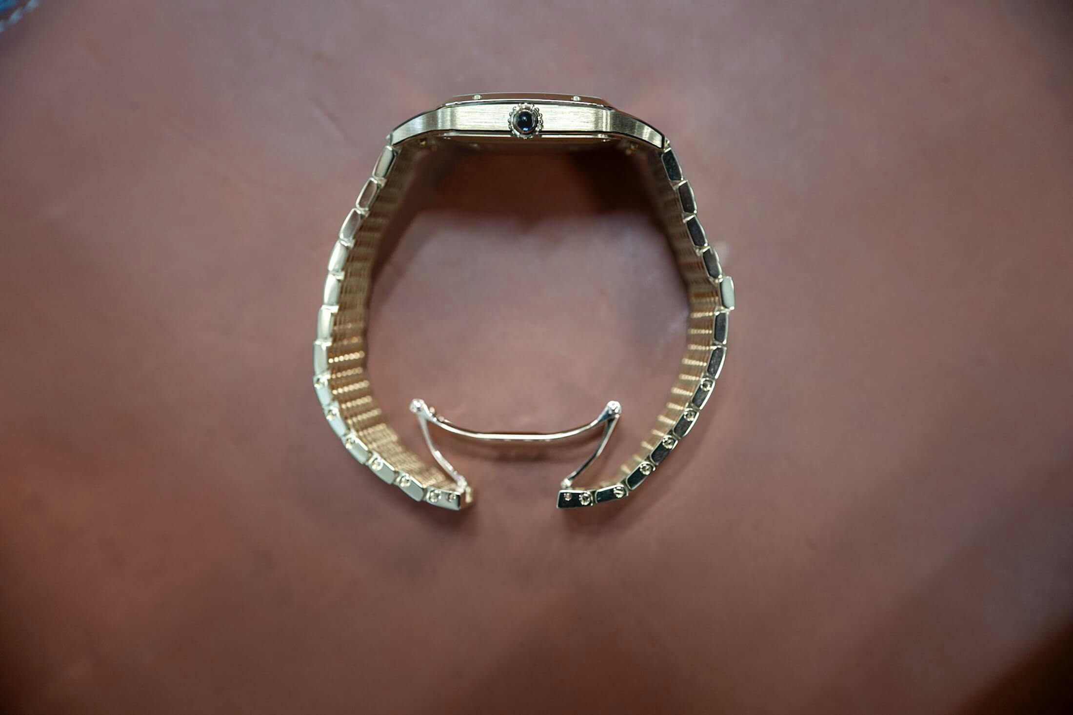 近年、パテック フィリップはゴールデン・エリプス、ロレックスは1908、ジャガー・ルクルトはレベルソで、それぞれ名門たちがしなやかかつ独創的なゴールドブレスレットを次々と発表してきた。今年、カルティエがサントス デュモンに与えた解答は、ジュエラーとしての誇りとウォッチメーカーとしての実用主義が完璧なバランスで共存するブレスレットウォッチである。今回のアップデートの核心は、1920年代に特別なオーダーで制作されていた初期のメタルブレスレットに着想を得た、極めてしなやかな構造にある。それは単なる装飾ではなく、腕時計の原点である実用性を追求したクリエイティブなアプローチとなっている。