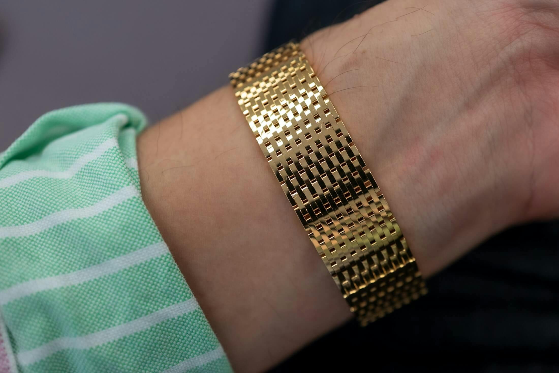 緻密なメッシュ構造リンク1つの厚さはわずか1.15mm 。これを15列にわたってメッシュ状に編み上げることで、金属でありながら布のようなしなやかさが与えられた。実に、合計394個ものリンクが組み合わされており、そのすべてに精密なポリッシュ仕上げが施されカルティエのマニュファクチュールにて組み上げられている。
