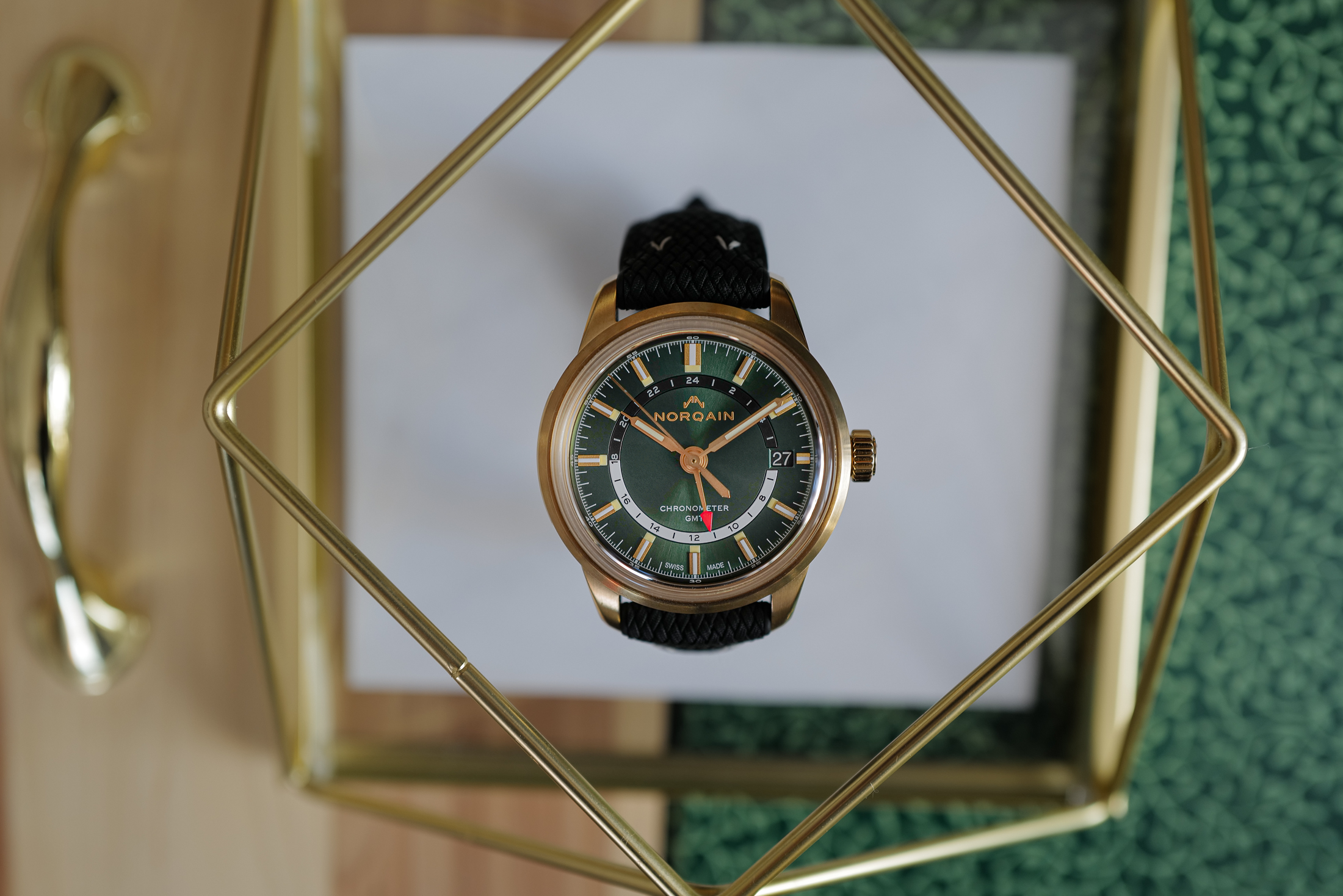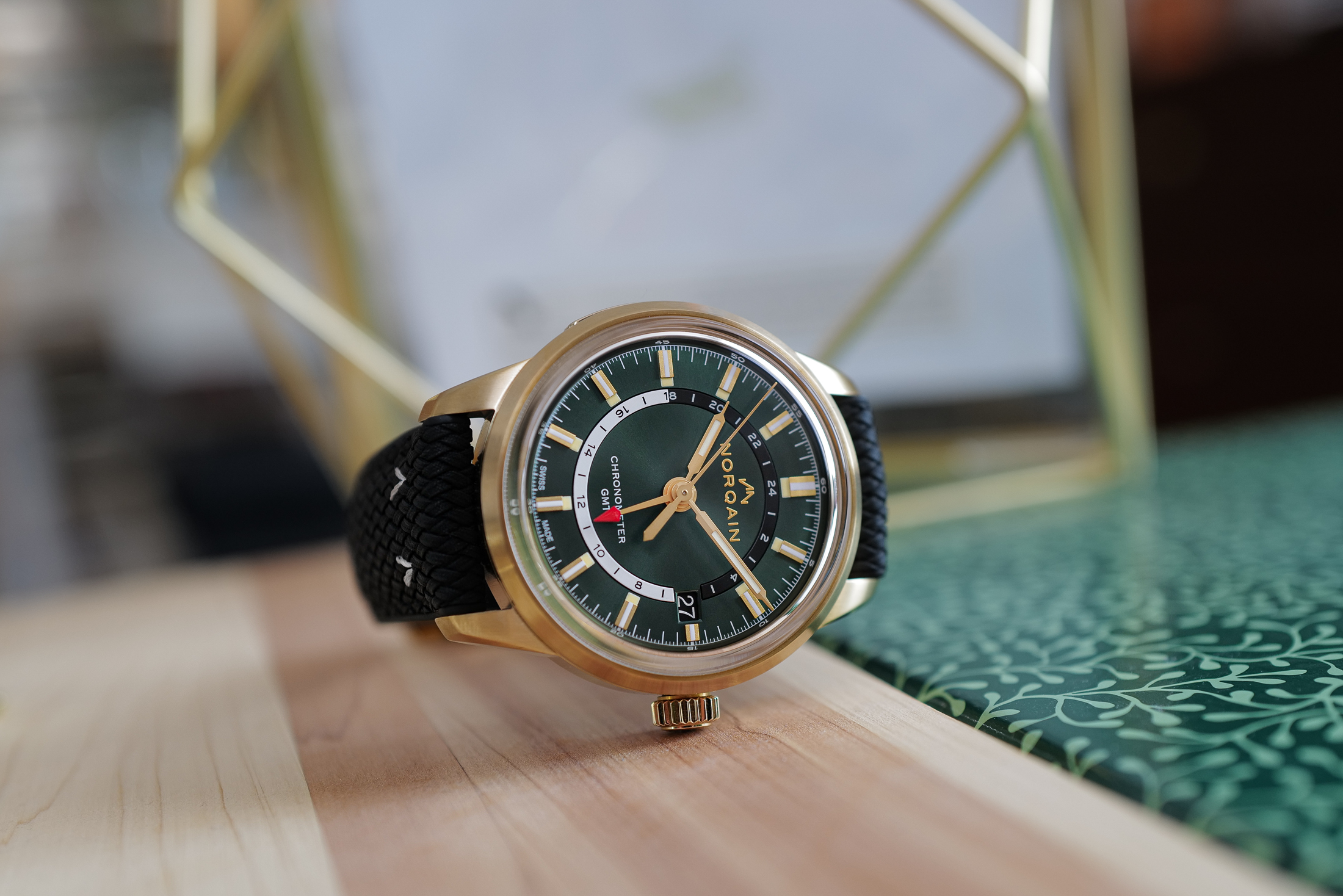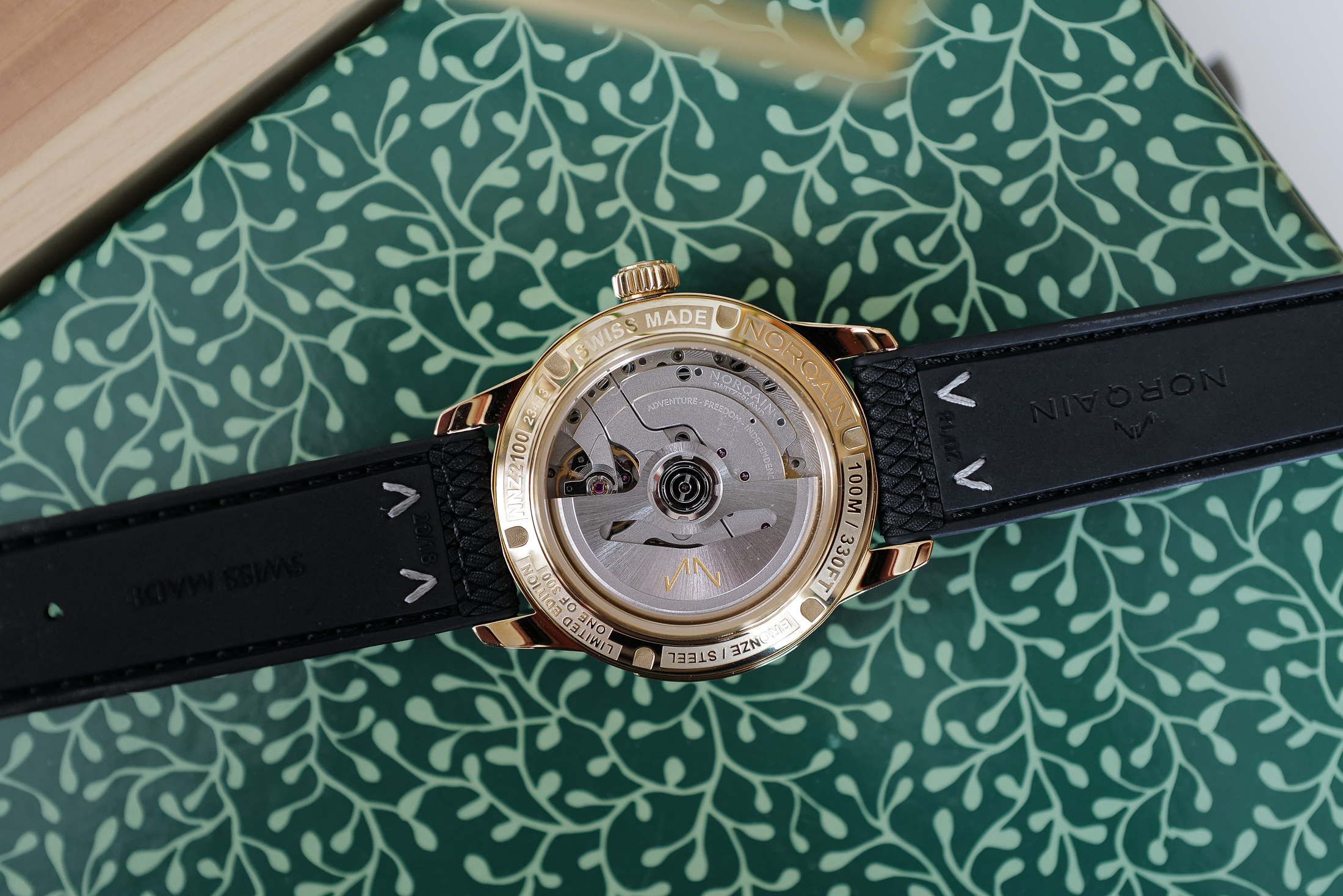 このモデルでは、オールドラジウム夜光が、ブロンズのマーカー、針、ケースと調和している。アルミニウムシリコンブロンズ合金で作られたこのケースは、はっきりとした金色または黄色の外観である。ノルケインによると、時間の経過とともに酸化して暗くなるそうだ。グリーン文字盤のサンレイ効果は、光の加減で変化する。屋外ではエメラルド色に近い明るい色に輝き、屋内では暗い森のような落ち着いた色になる(GPSなしでは一人で行動したくないような場所だ)。
