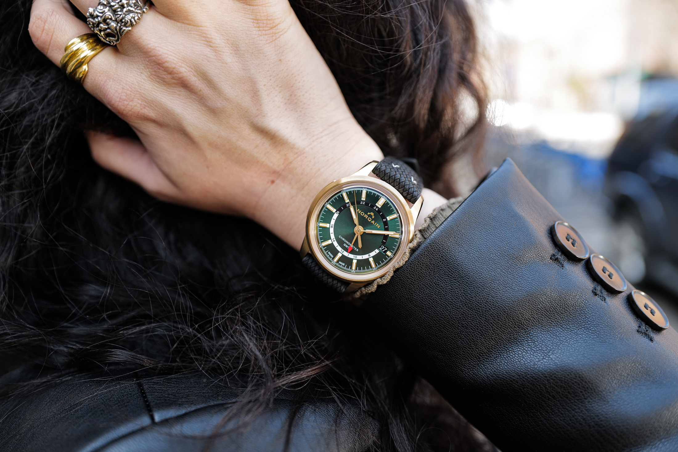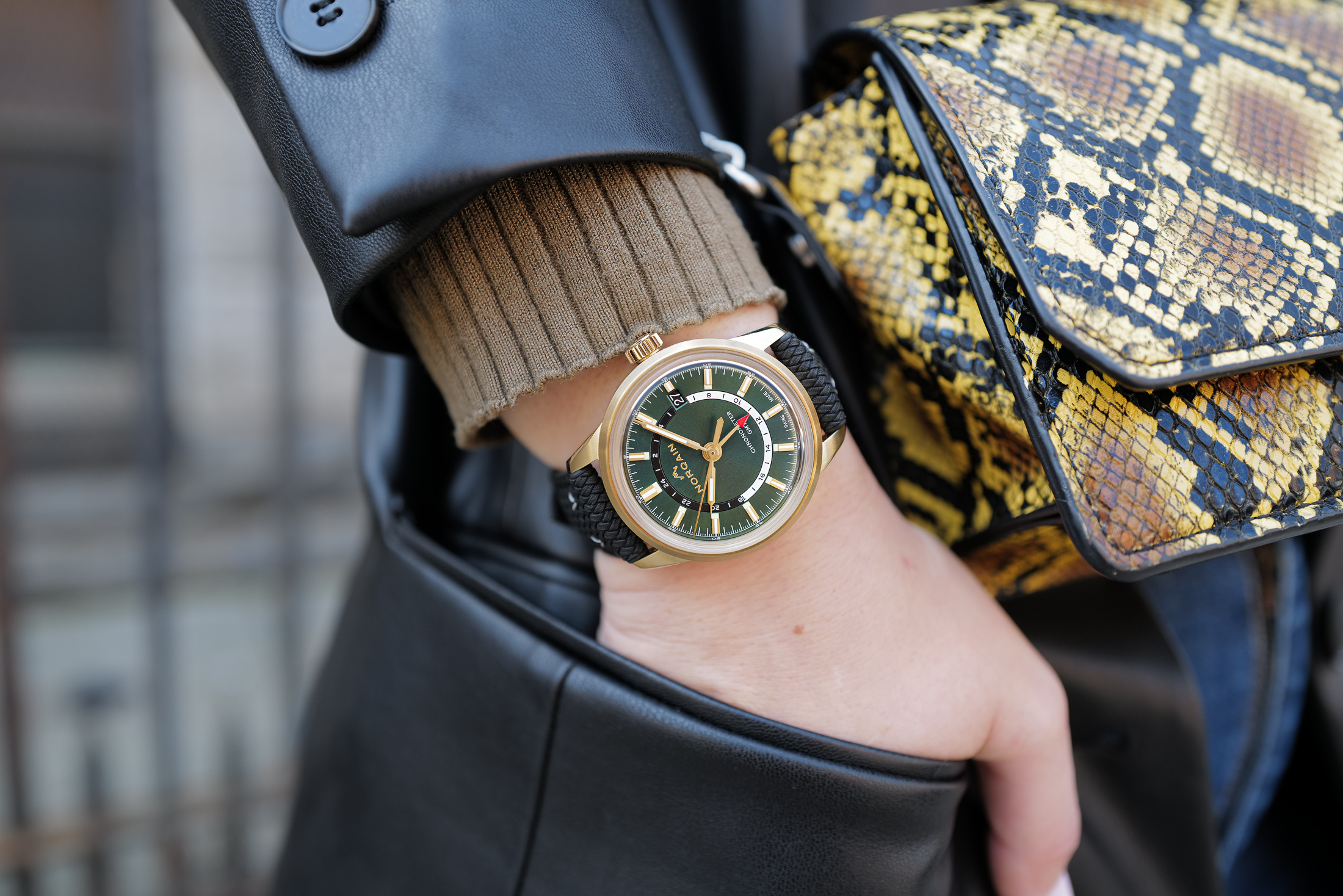 24時間表示にはオパーリンの赤と青の代わりに、ノルケインは漆黒と白の2色構成を採用。どちらの色もグリーンの文字盤に映え、視認性も損なわれていない。GMTの針い赤が非常に映える。