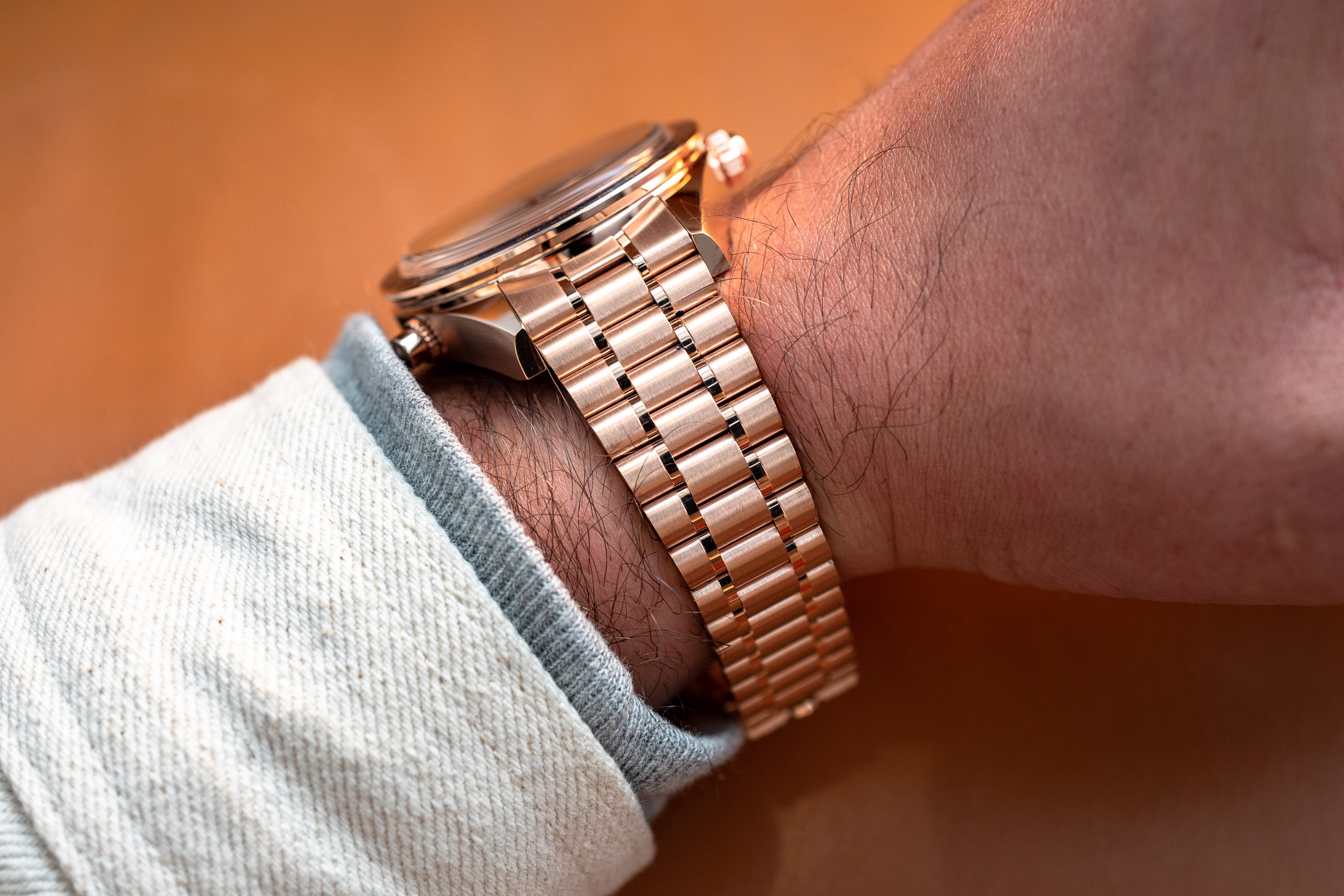 手にしてみると、どちらの時計も大きく、重く、とても特別な感じがする。アベンチュリン文字盤とギヨシェ仕上げのインダイヤル(これはとても素敵だと思う)の組み合わせが美しいからだ。確かに幅が広く、かなり厚みがあるが、どちらのモデルでも僕の腕に最もインパクトを残したのはこの重さだった。大型の時計を気にしないのであれば、テーパリング・ブレスレットのサイズを適切に調整し、フルゴールドの生の重さを完全にアジャストすれば、スピードマスター クロノ チャイムは簡単につけられることがわかるだろう。繰り返しになるが、これはムーブメントだけでも45g以上のゴールドを使用してるのだ。