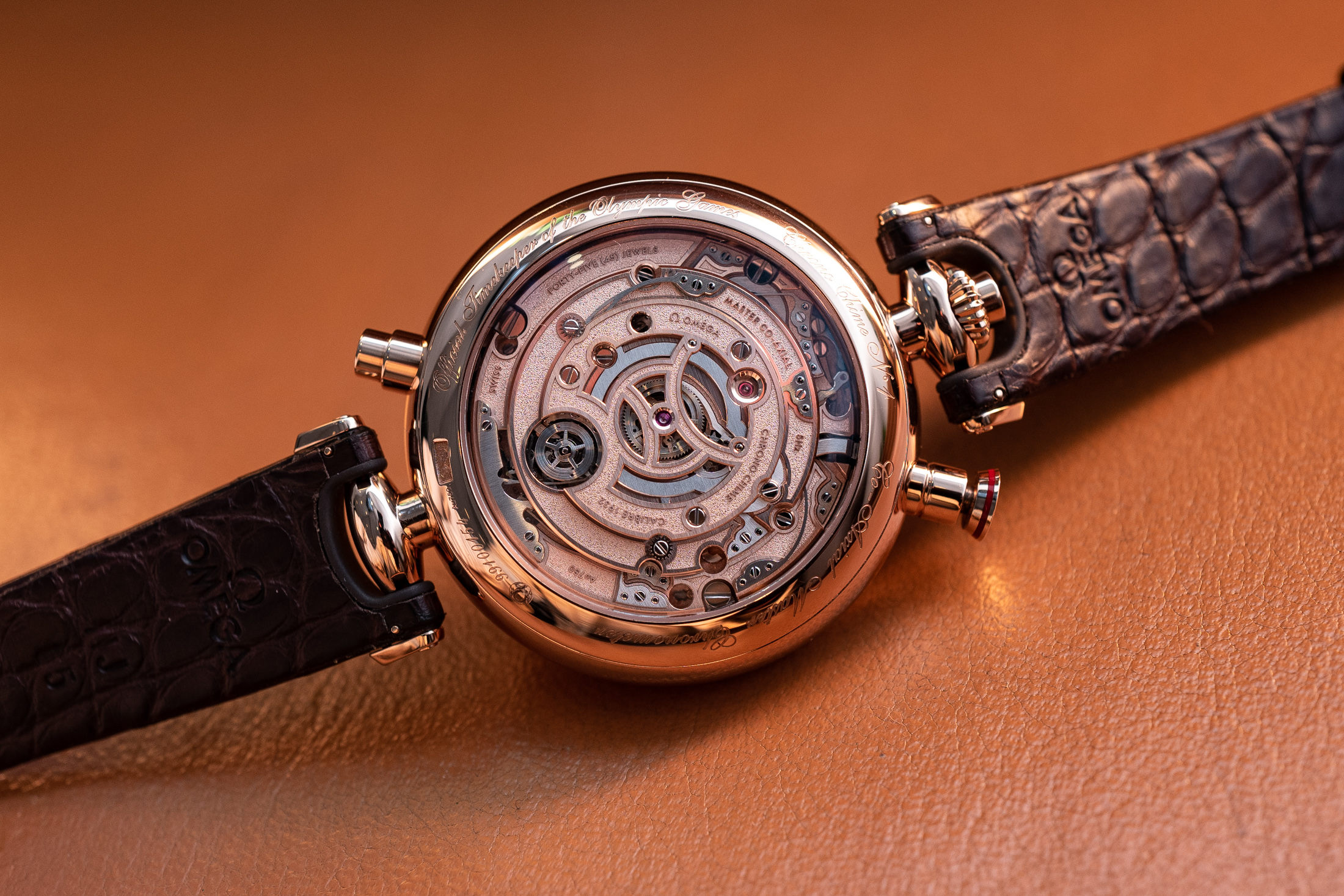 ハイビートの進化に加え、1932は60時間パワーリザーブ(この複雑機構を考えると非常に立派な数値だ)、モノプッシャークロノグラフコントロール、クロノグラフチャイム作動用にそれぞれプッシュボタン(3つのチャイムカムを使用)、さらに垂直クラッチを備え、46g強のセドナゴールドが使用されている。さらに、50以上の部品が非鉄金属で作られているため、1万5000ガウスの耐磁性を備えたマスター クロノメーターでもあるのだ。