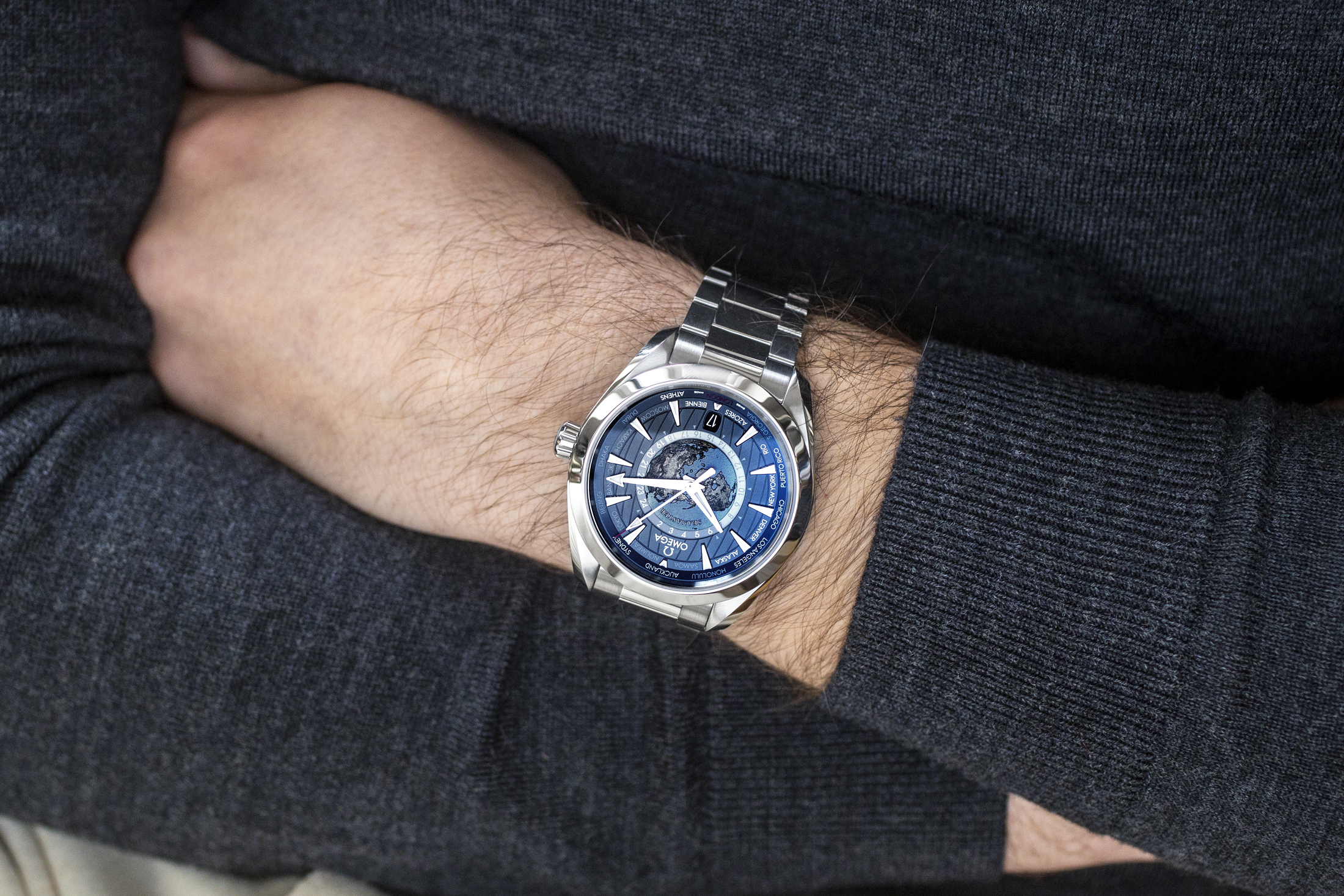 私がレビューのためにこの腕時計をオメガから受け取ったとき、印象的な海のブルーと世界大陸の立体地図の次に気づいたのは、中央ヨーロッパ標準時を表示するために選ばれた都市だった。ビエンヌ(ドイツ語圏の人々にとってはビール)は、オメガ本社とその親会社であるスウォッチ・グループが位置する都市である。この自治体はビール・ビエンヌとしても知られており、住民がフランス語系とドイツ語系に分かれていることでも有名だ。パリ、ジュネーブ、ベルリン、チューリッヒというもっと遥かに大きな都市を差し置いて、スイスの比較的小さな自治体であるビエンヌを文字盤に記すことを選択したのは、オメガのファンにとっては重要な意味を持つはずである。