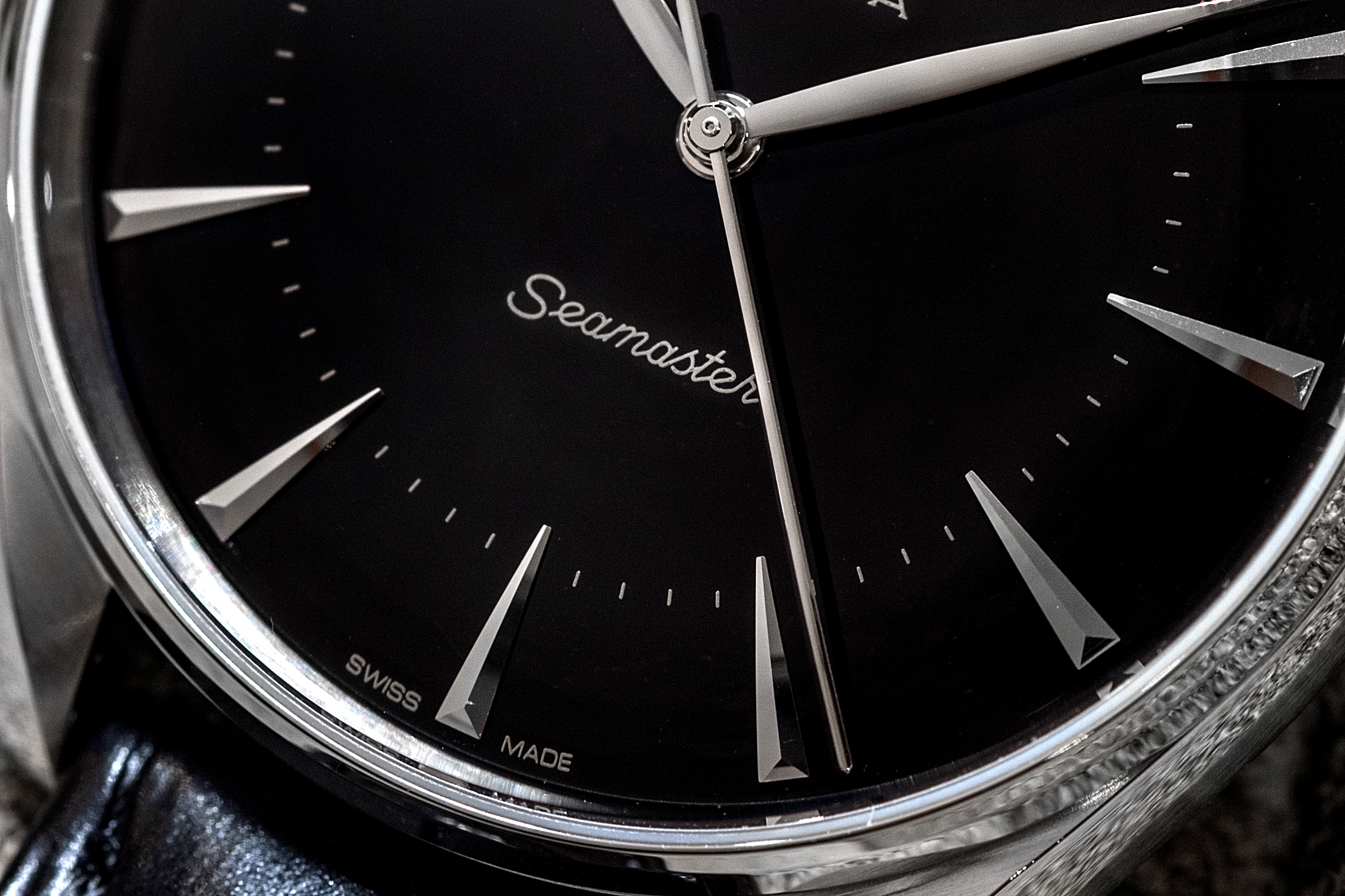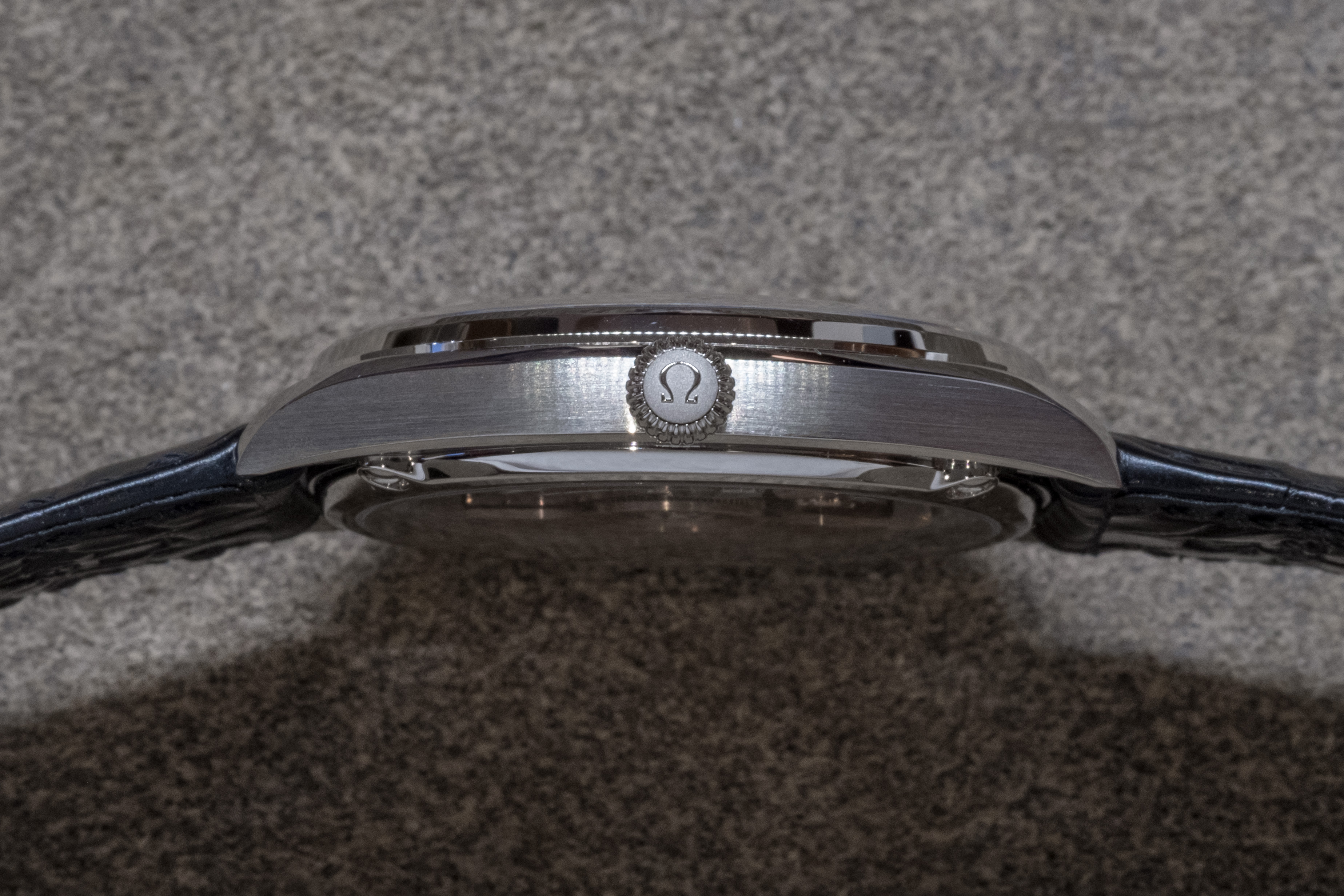 余談:12時位置のオメガロゴの上にあるヴィンテージスタイルの「Ω」も、実はプラチナで作られておりダイヤルに転写印刷されています。これは全く必要のない贅沢なディテールで、またこの時計全体を表わすのに最高の提喩でもあります。