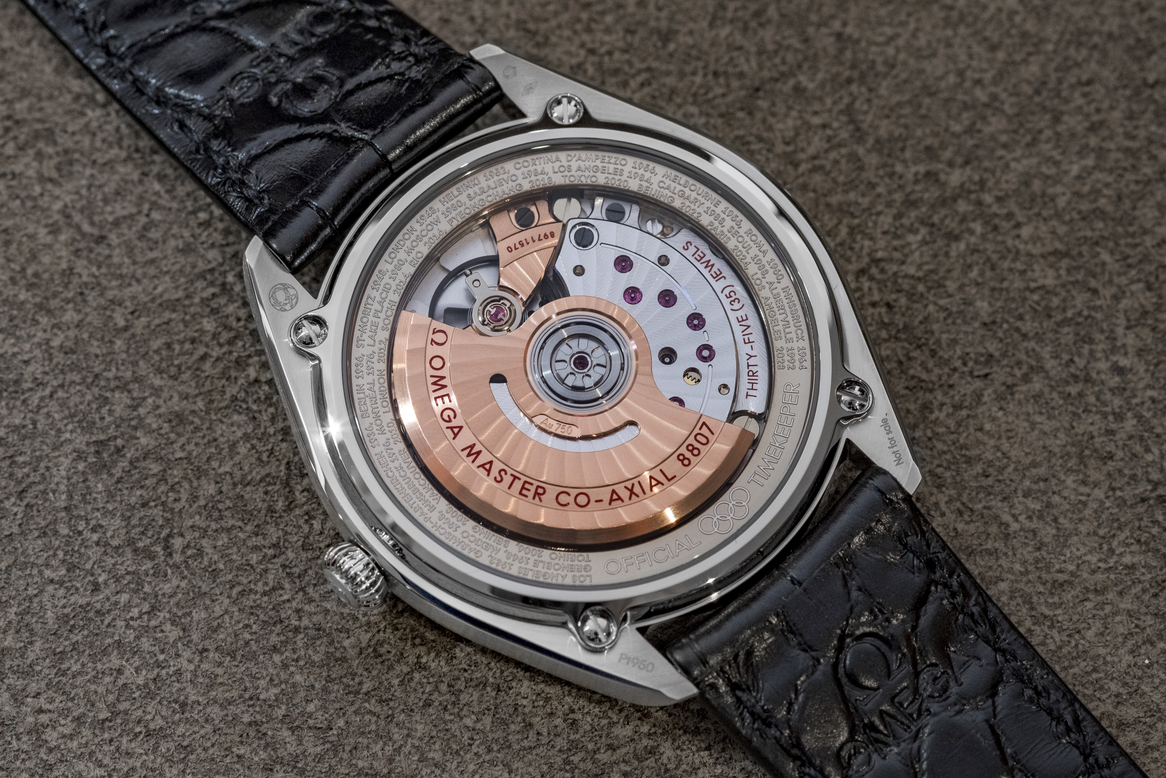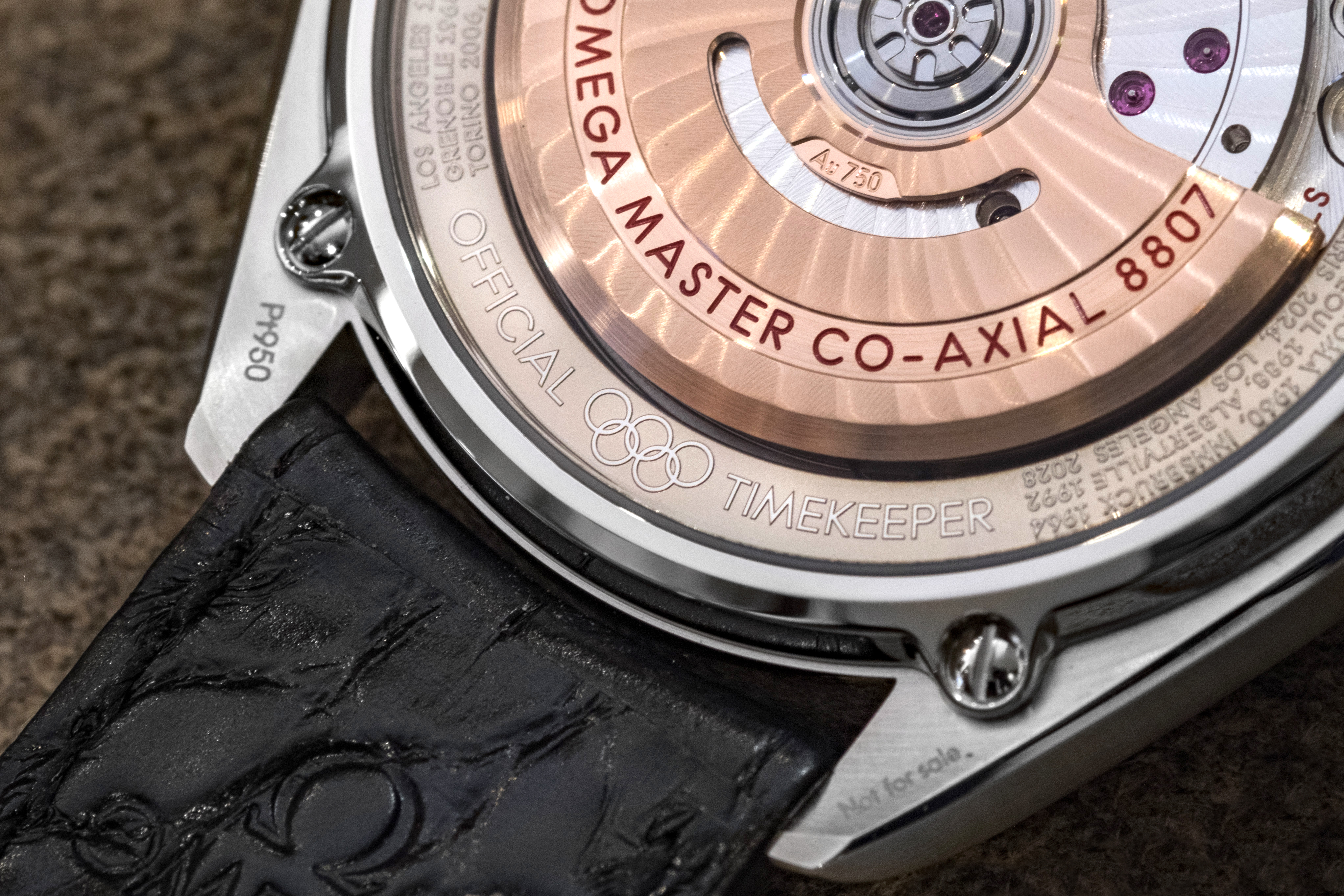 僕は普段は、「ムーブメントをケースに合わせる」という陣営に強く味方する人間なのですが、ここでは例外を設けたいと思います。サファイアのケースバックが時計の背面を占め、ムーブメントとケースの縁の間のスペースには、「オフィシャル タイムキーパー」とオメガがこの役割を務めたすべての五輪開催都市の名前が刻まれているのに気づくでしょう。もちろん、それもプラチナで作られており、このような時計には当然と言えるでしょう。忘れないで欲しいのですが、つまるところ五輪の時計なのです。
