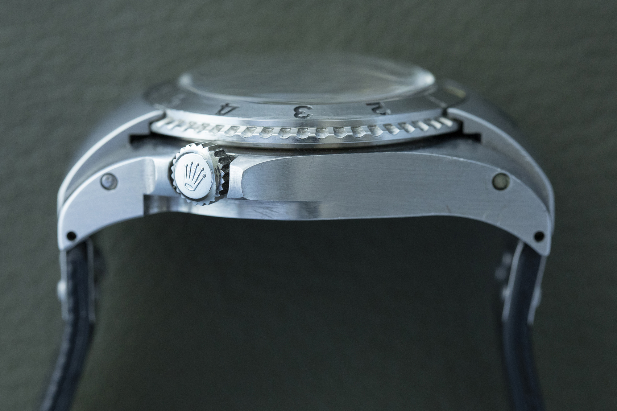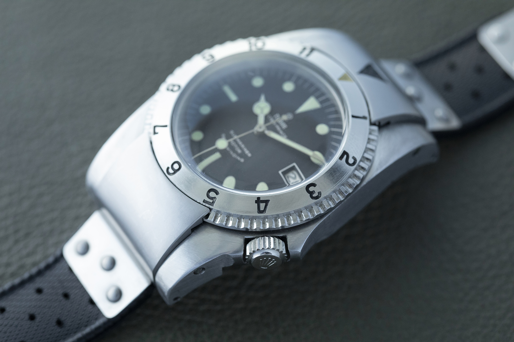 ケースとダイヤルの比率を見ると、ベゼルにロック機構を取り入れたためにケースが相当大きくなっている印象だ。この時代のケースは、今日の防水技術がなかったため元来大きくなりがちだった。メタルケースという観点でいうと、このコマンドープロトタイプのケースはオメガ プロプロフのようなロック機構付きベゼルの一体鋳造ケースと同じ種類であり、コンテンポラリーなロレックス サブマリーナーのケースとは異質のものである。
