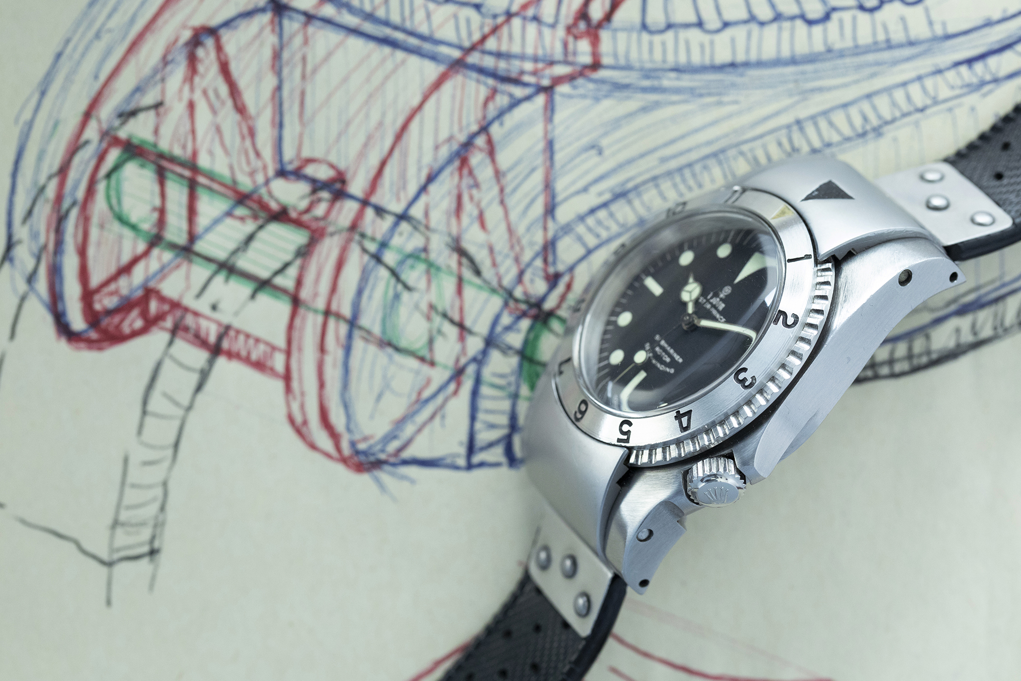 私たちは、最近チューダーのジュネーブ本社でこの時計の元になったオリジナル・プロトタイプを手に取る機会に恵まれた。それは、60年代に米国海軍からの時計受注を目指して始まったチューダーの“コマンドー”プロトタイプ開発計画から生まれたものであったが、その時計は量産されることはなかった。その理由は、ベゼルのロック機構があまりにも複雑すぎて手間が掛かるからだと私は推測する。軍からの契約は、コストパフォーマンスを考えてシンプルで頑丈な物を提案するメーカーが受注する傾向が高い。P01がそうでなかったと言っているわけではなく、このプロトタイプ開発のフェーズではそれ以上話が進まなかったのだ。