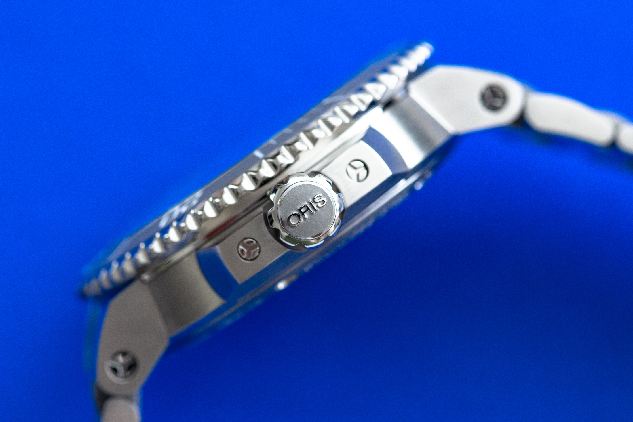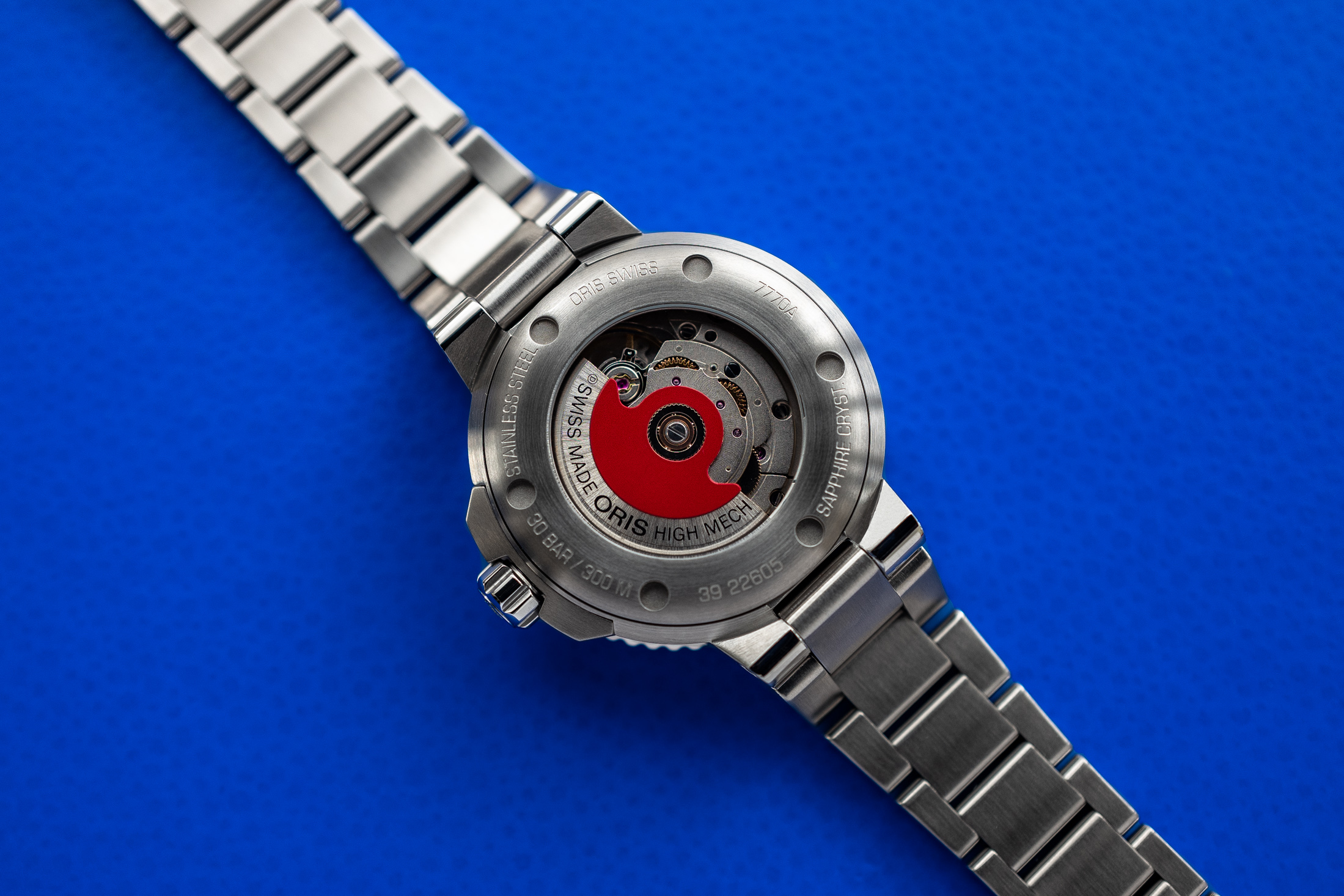 防水性能は300m、フロントにサファイアクリスタル、ケースバックにミネラルガラスディスプレイを採用し、両サイズともにオリスの自動巻きムーブメント733を搭載。セリタ社のSW200-1をベースにしてオリスの装飾が施されたこのムーブメントは、4Hzで駆動し、約38時間のパワーリザーブを備えている。ケースバックには、オリスが通常使用している赤のアクセントとサイン入りの巻上げローターが確認できる。