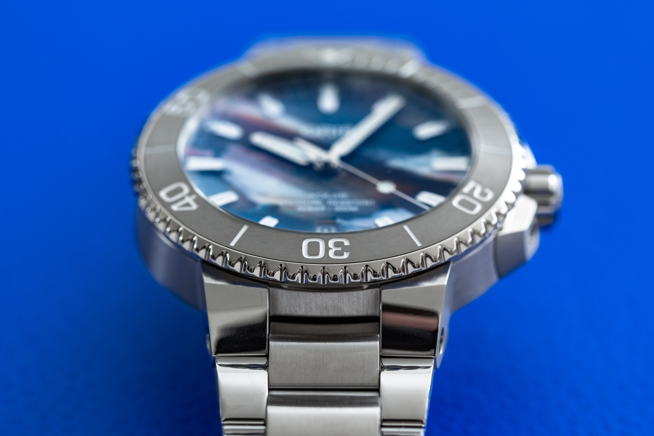 オリス アクイス デイト アップサイクルは限定ではなく、どちらのサイズも27万5000円(税込)で販売され、今回のレビューで紹介したフルスティールブレスレットも含まれている。