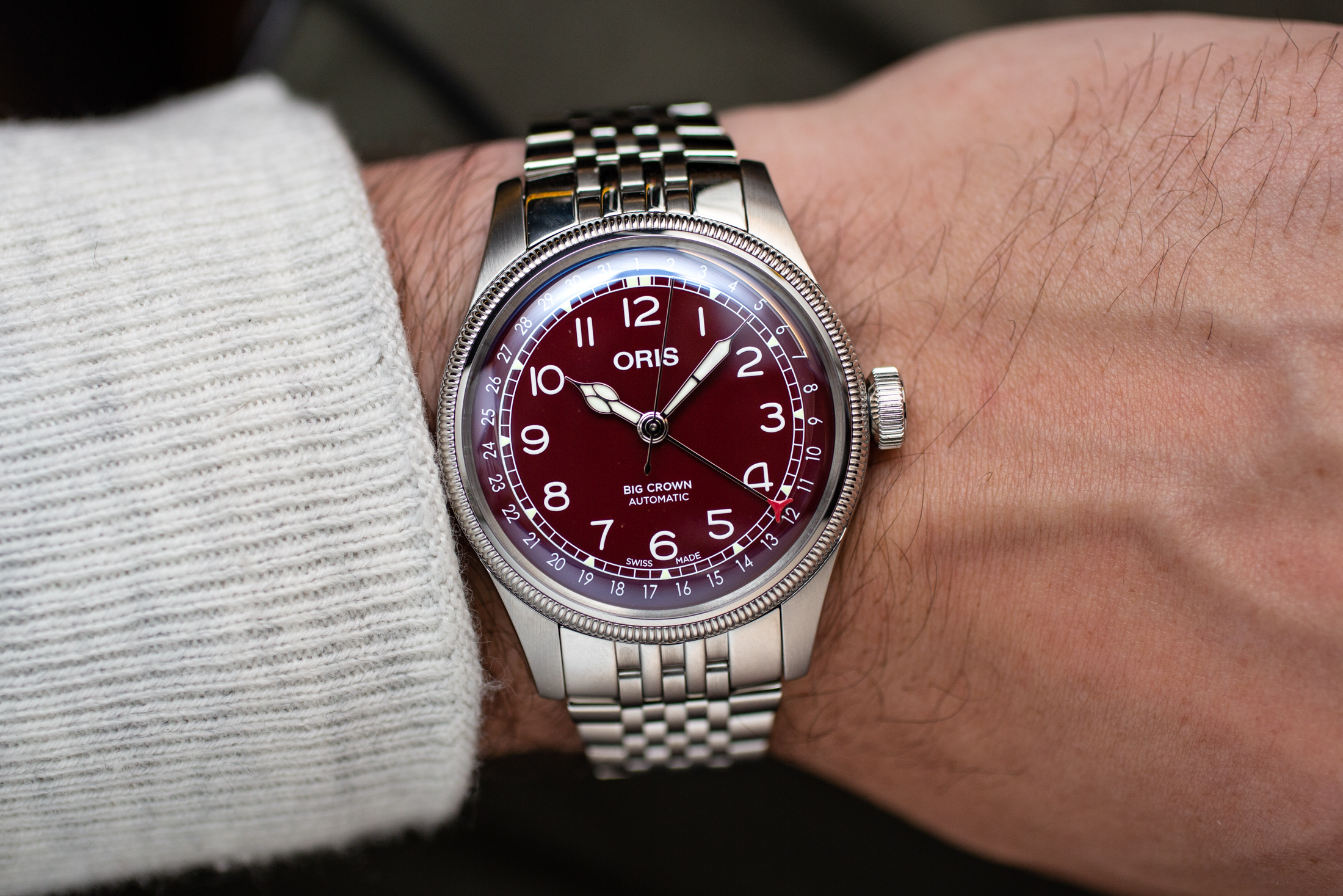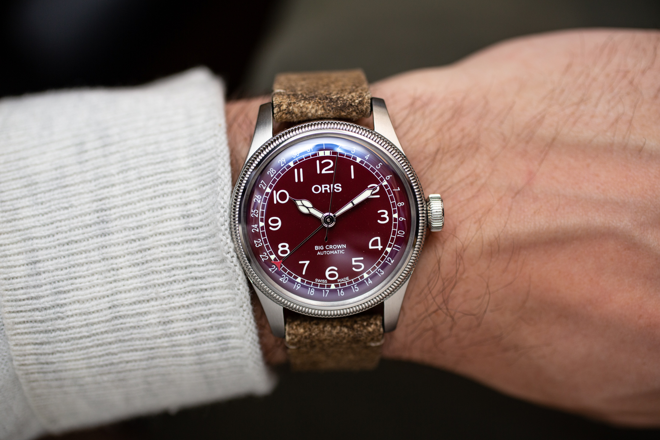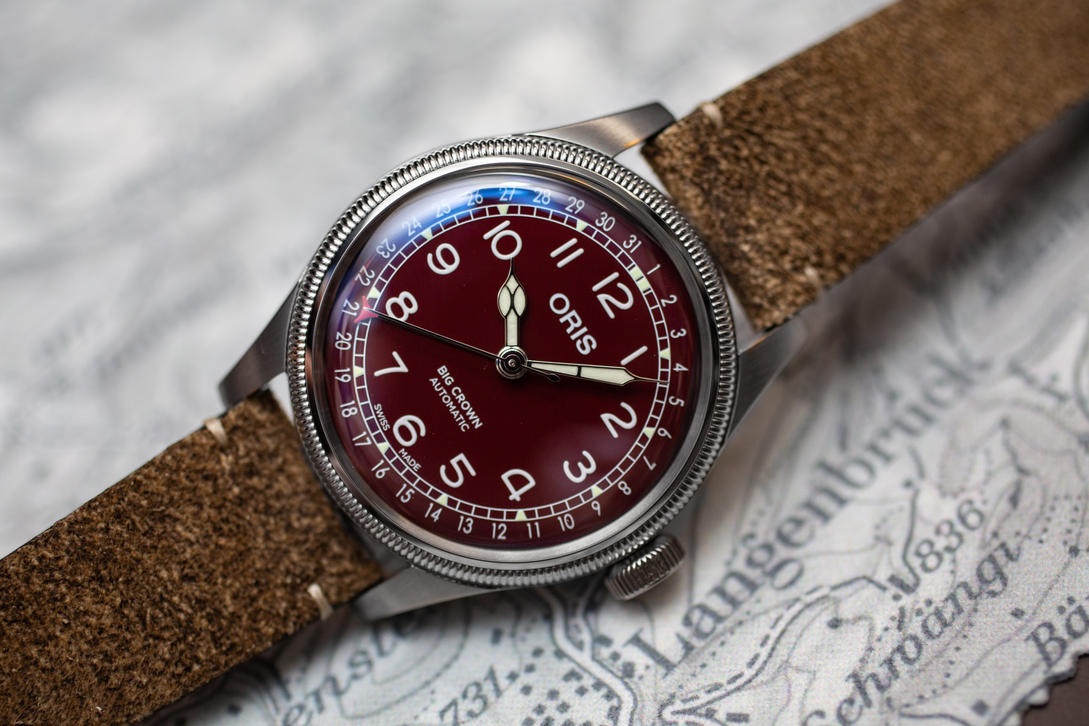全体的なデザインはクラシカルで、コブラ針を用いた中3針だ。ポインターデイト針の先端部分には赤いアクセントが施されている。このようなロマンティックなデザインと機構は、個人的には大胆なカラーリングと良く合うと思う。初期からグリーンダイヤルのトレンドを取り入れていたオリスにとって、明るさを抑えたボルドー色が持つ迫力はこのラインナップの中でも唯一無二の存在である。