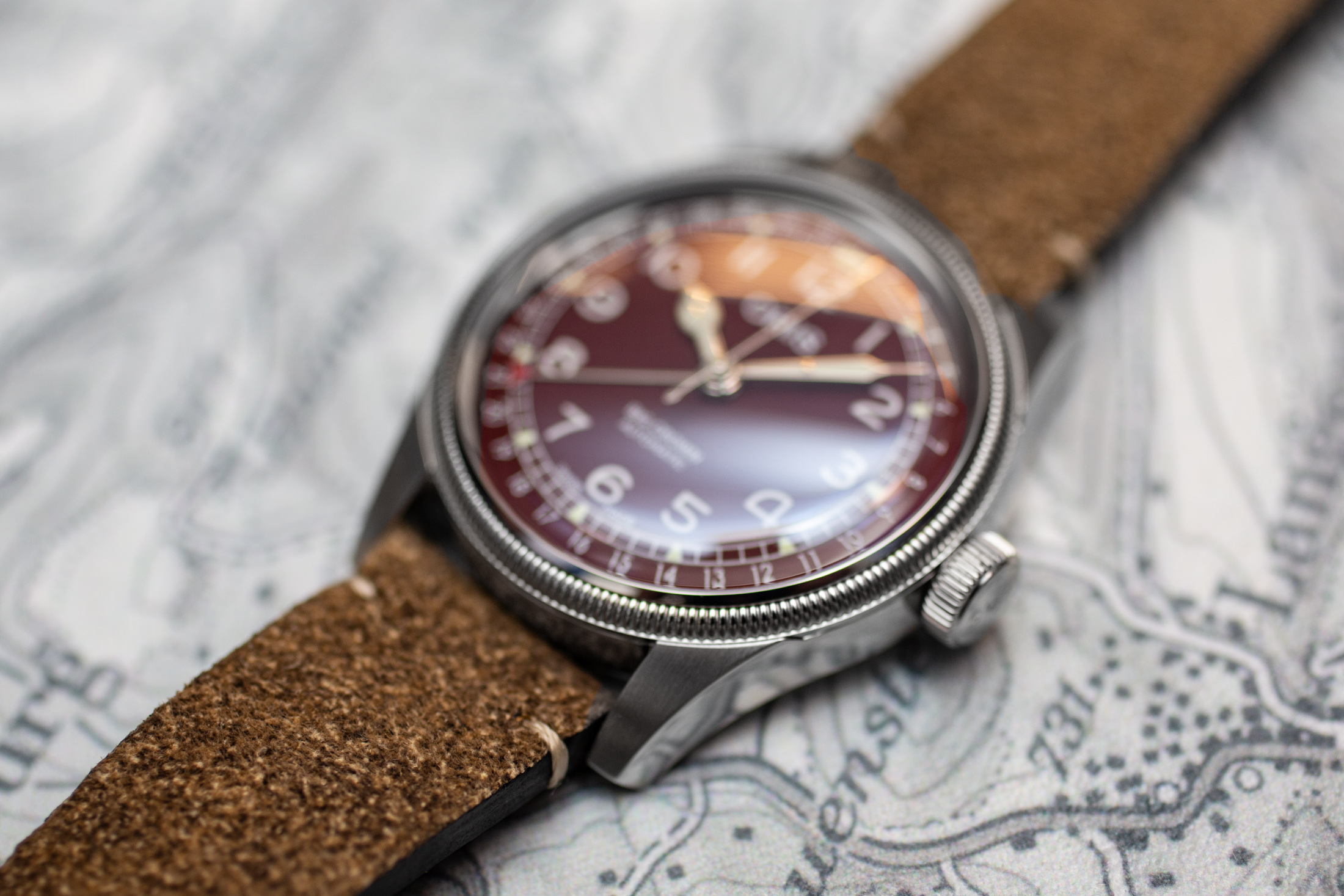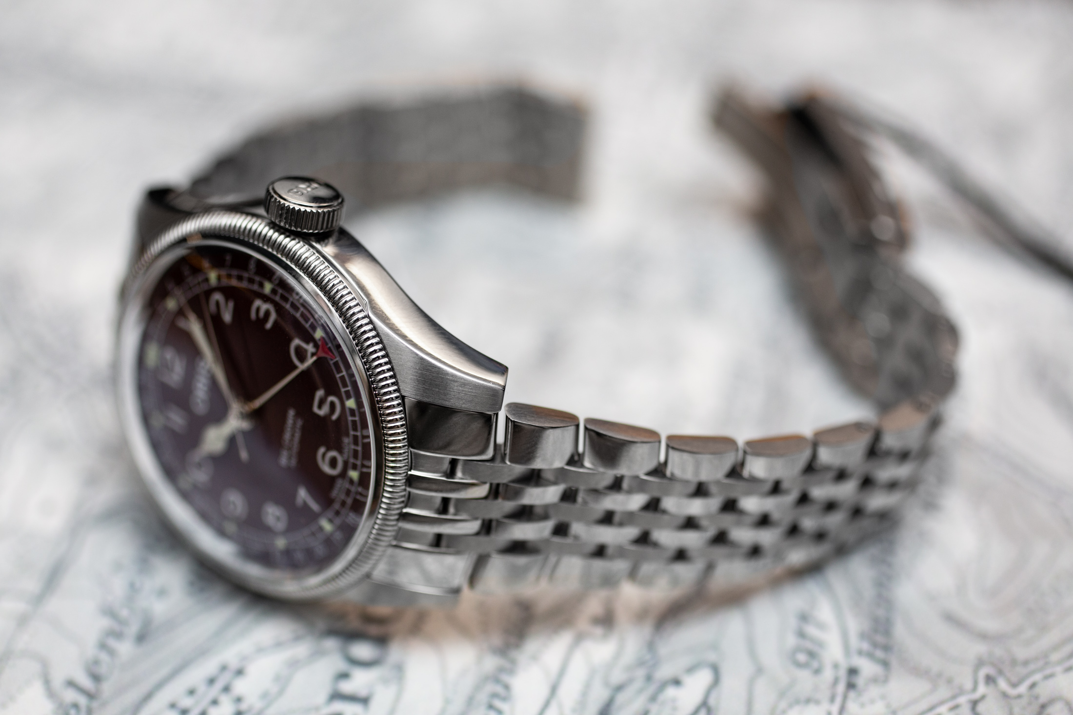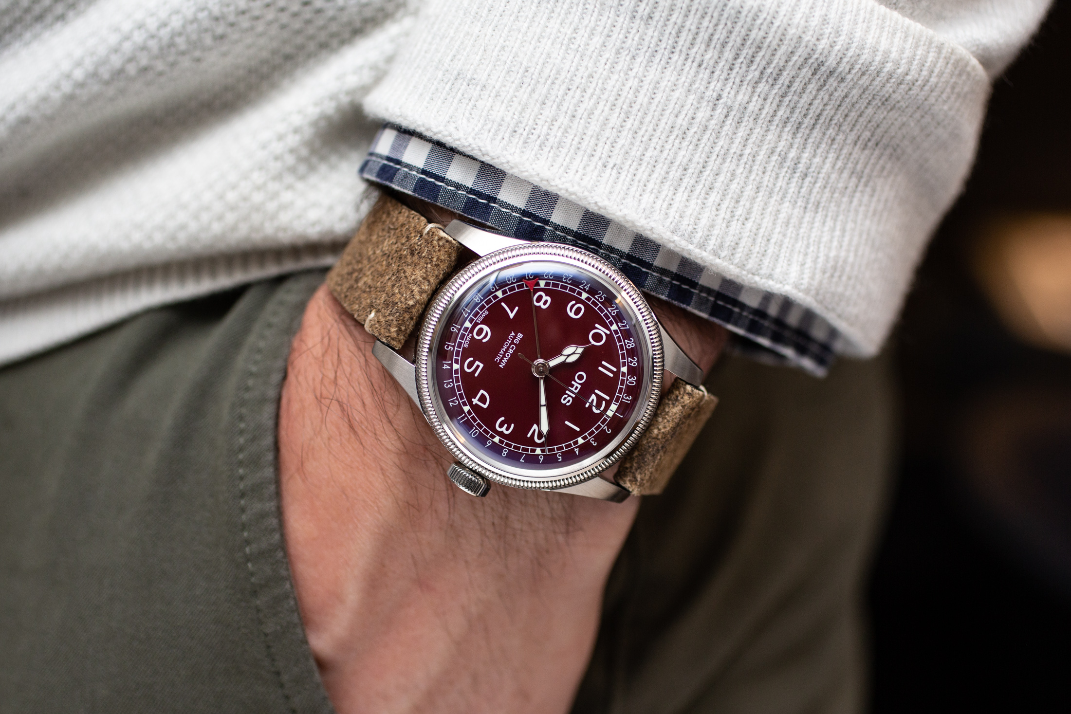 全体的なデザインはクラシカルで、コブラ針を用いた中3針だ。ポインターデイト針の先端部分には赤いアクセントが施されている。このようなロマンティックなデザインと機構は、個人的には大胆なカラーリングと良く合うと思う。初期からグリーンダイヤルのトレンドを取り入れていたオリスにとって、明るさを抑えたボルドー色が持つ迫力はこのラインナップの中でも唯一無二の存在である。
