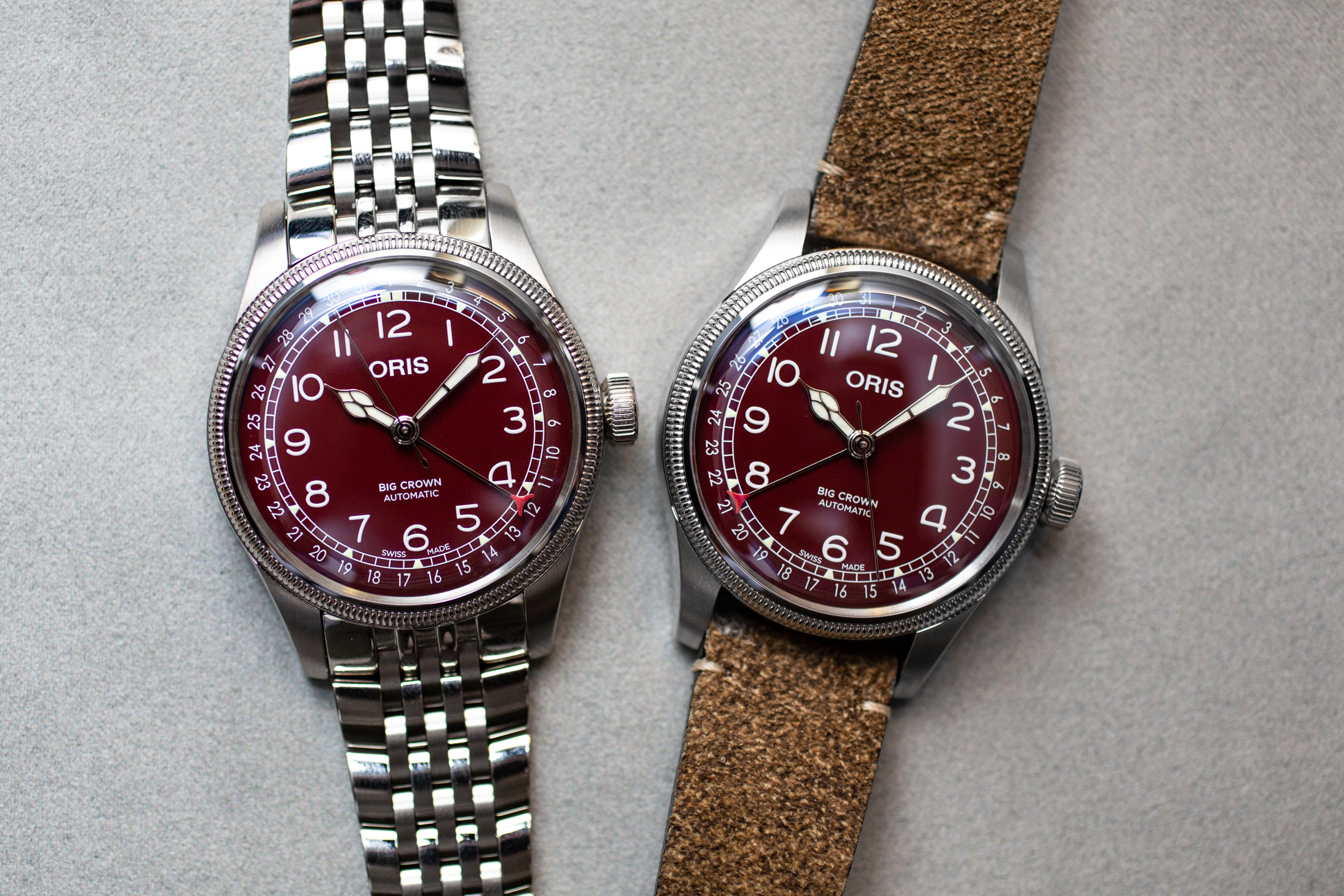 鹿革製レザーストラップモデルは17万5000円(税抜)、SSブレスレットモデルは19万5000円(税抜)。オリス ビッグクラウン ポインターデイトは、レッドダイヤルが新トレンド化する試金石になるかもしれない。
