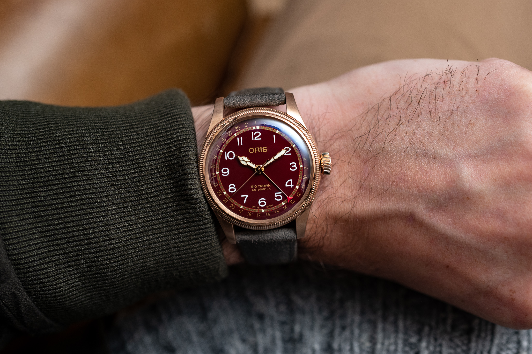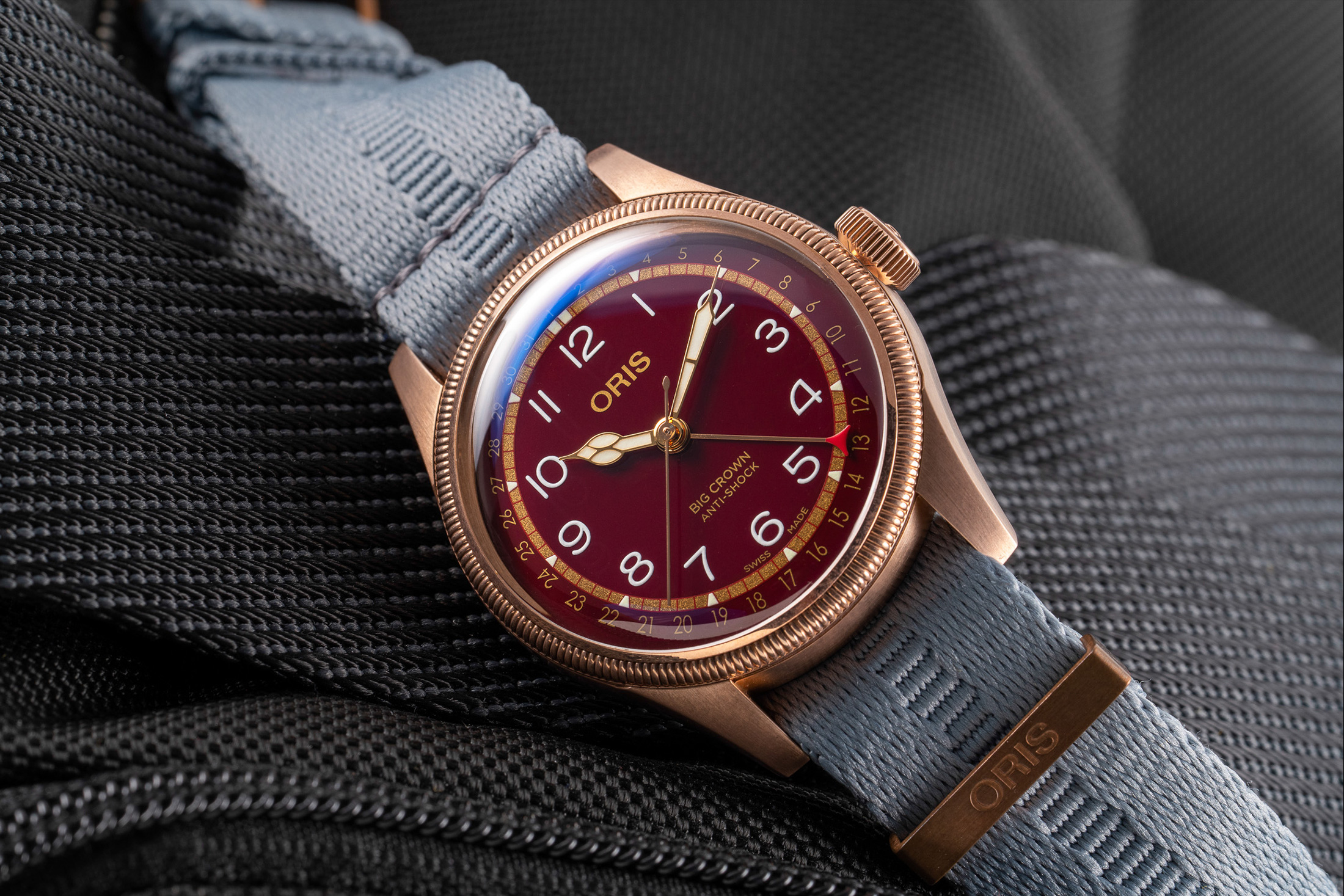僕にとって、ビッグクラウン ポインターデイトは、大胆でカラフルなダイヤルのものが一番だ。再度の低いブルーから80周年記念モデルのゴージャスなフラットグリーン、そしてもちろんバーゼルワールド2019で取り上げたオックスブラッドレッドまで、ポインターデイトの少し古風なフォーマットとスタイルは、色使いがモダンで若々しく、そして何よりも楽しさを感じさせる。そこにある種の静かな自信があるようだ。 フラテッロも同様に感じたに違いない。オリスとの最新のコラボレーションでは、ブロンズケース(以前にも見たことがある)を使用し、それを特別な進化を遂げた深みのあるレッドダイヤルと組み合わせた。