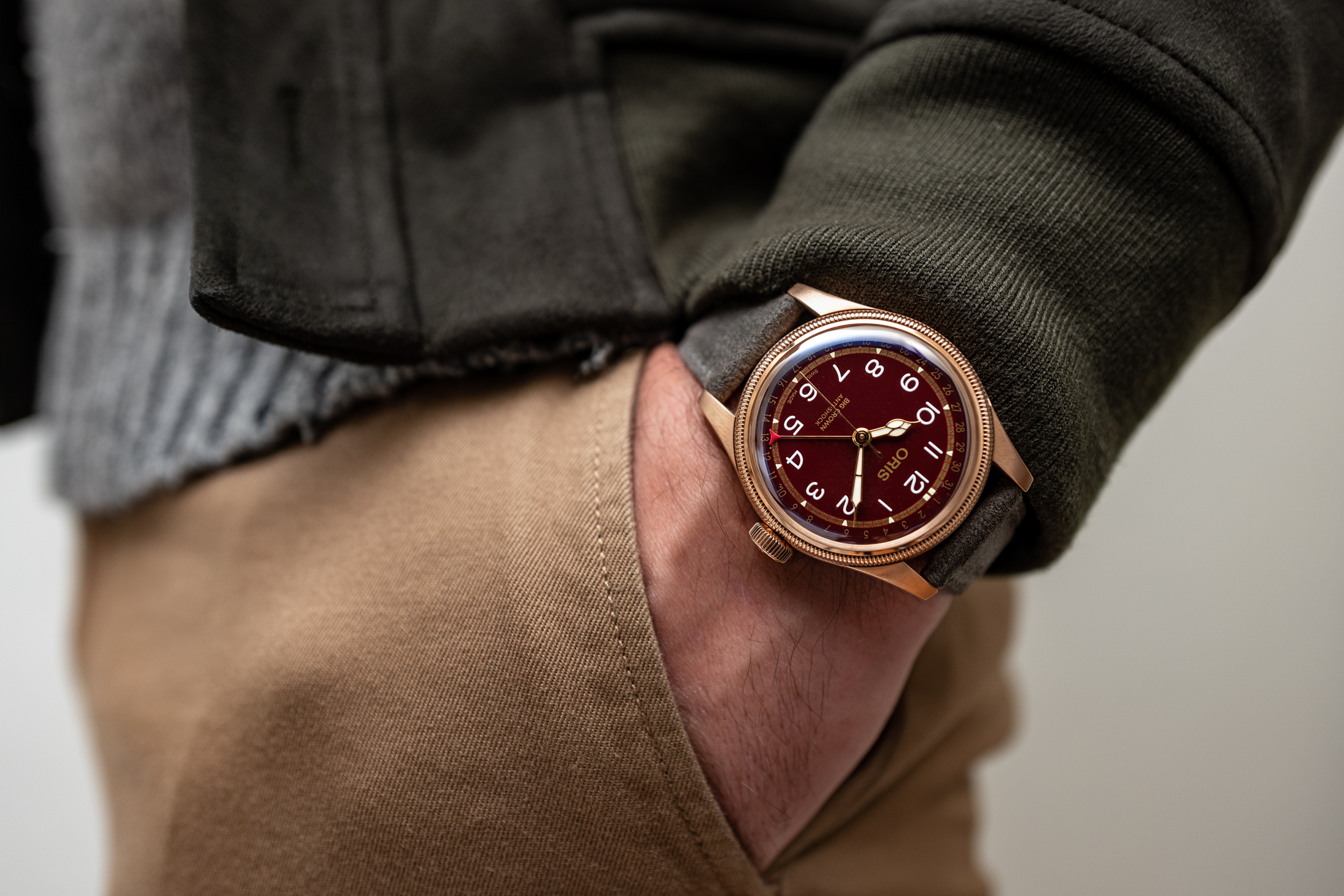 オリスが得意とすることは数多くあるが、そのモダンなラインアップの中で、ブロンズの継続的な使用と、豊かで個性的な色の魅力に勝るものはない。オリスと、僕らもよく知っているフラテッロ・ウォッチズとの最新のコラボレーションでは、この2つの要素を組み合わせた特別なビッグクラウン ポインターデイトの限定モデルが登場する。ブロンズケースと深みのあるレッドダイヤルが特徴だ。手首でのユニークな存在感と豊かな個性を兼ね備えた、このポインターデイトは300本限定で、フラテッロとオリスの双方のブティックで販売される。