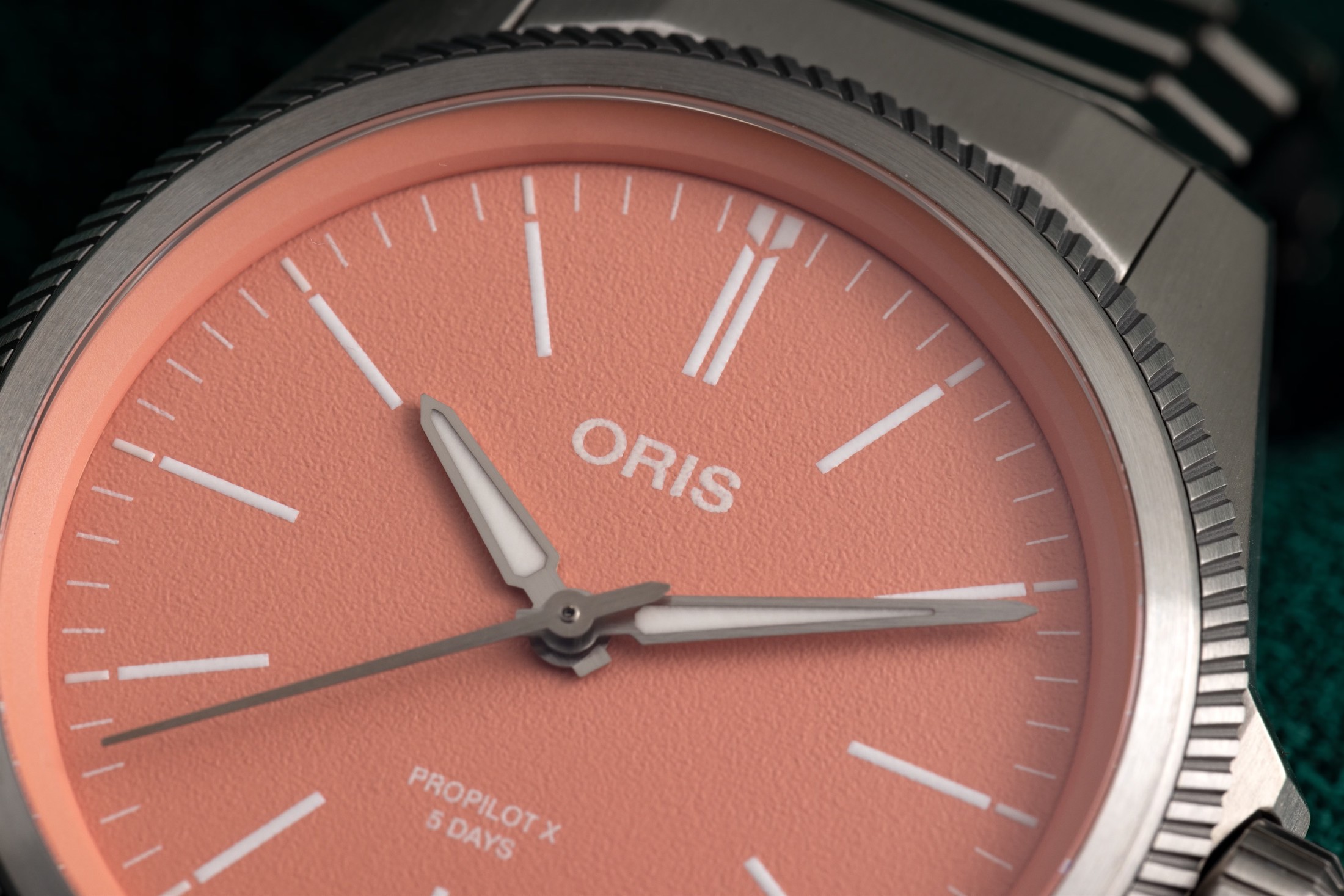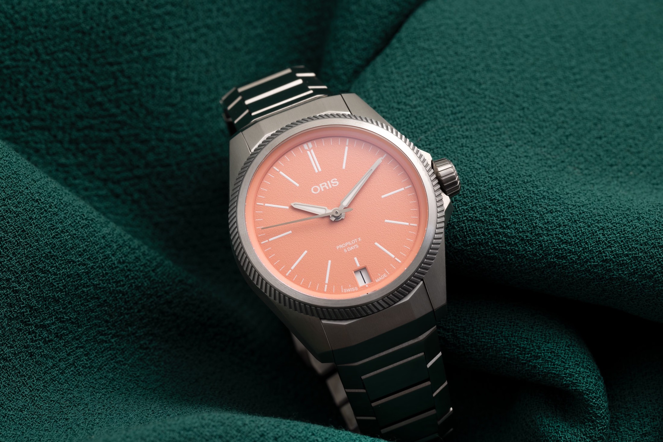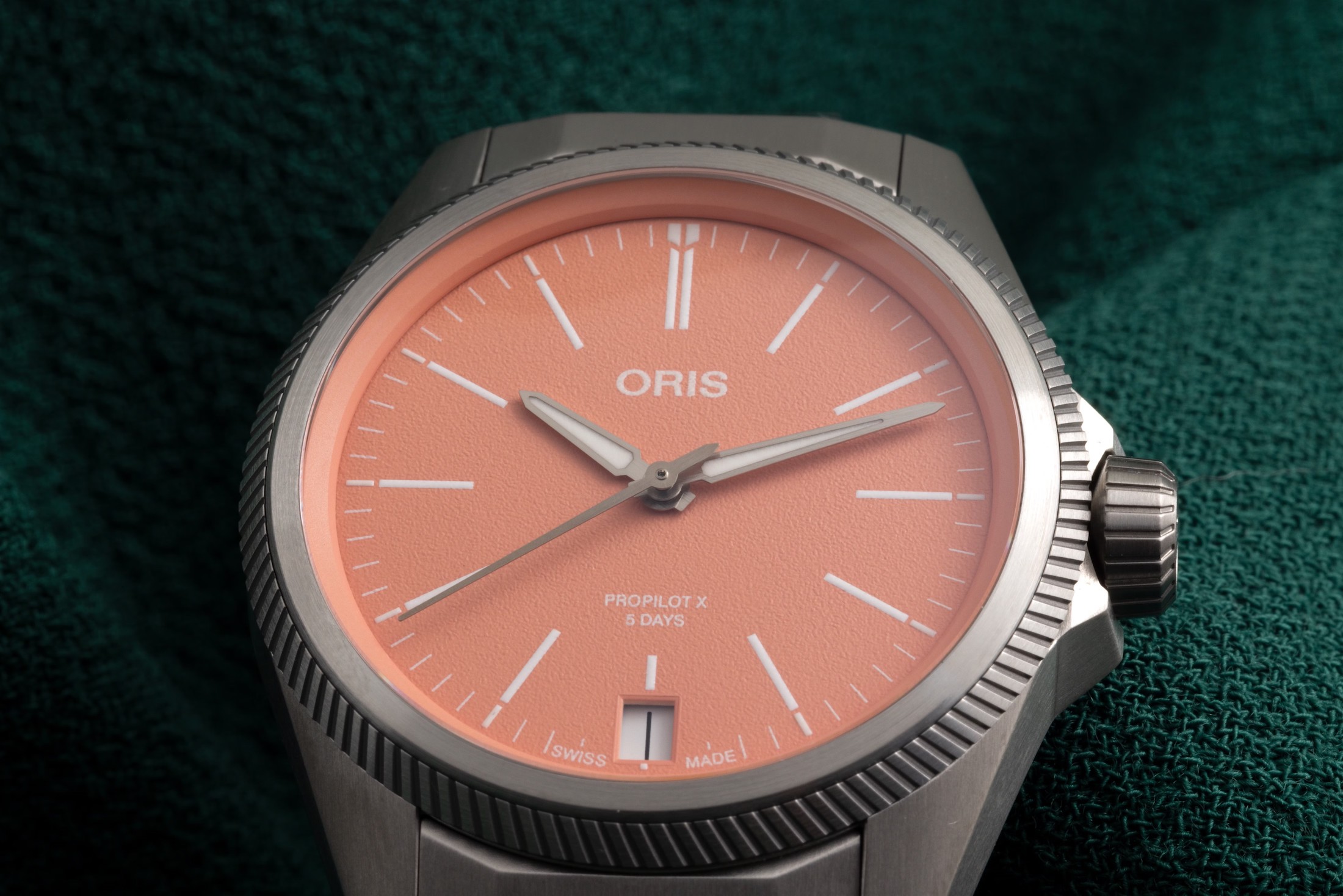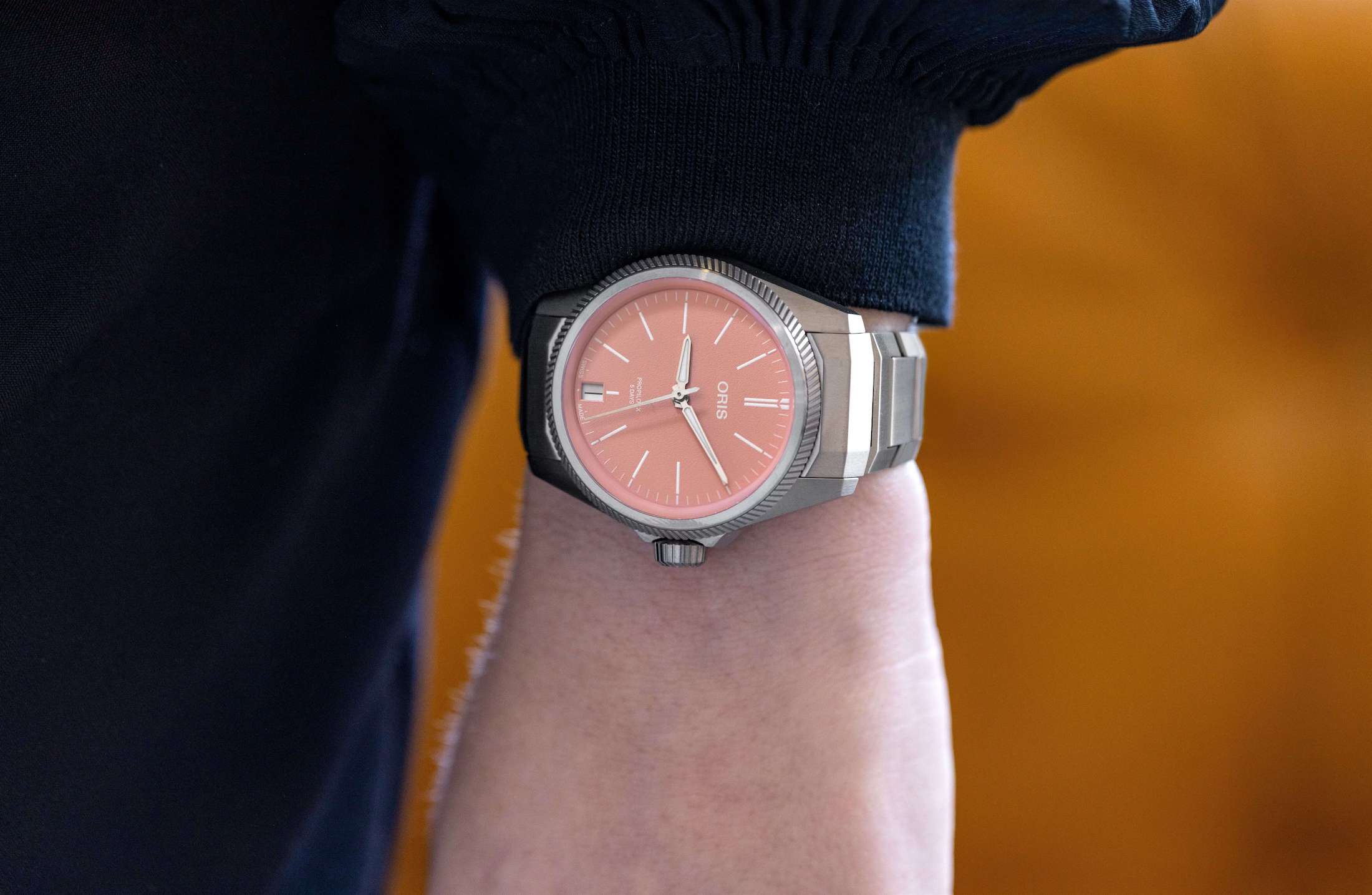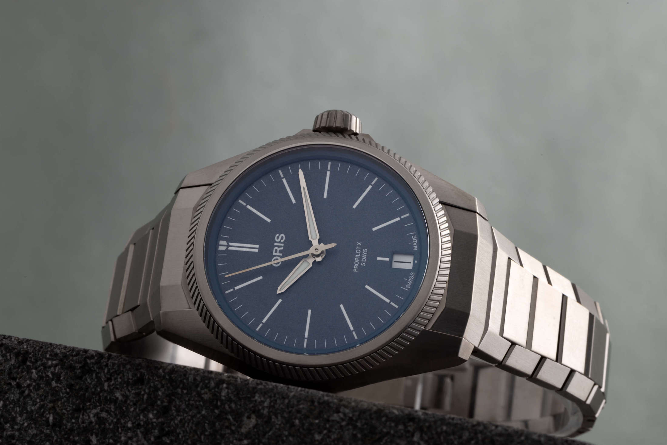 新しいオリス プロパイロットX キャリバー400を紹介しよう。チタン製で、グレー、ブルー、サーモンの3色のダイヤルがある。そして内部にはオリス Cal.400を搭載されている。