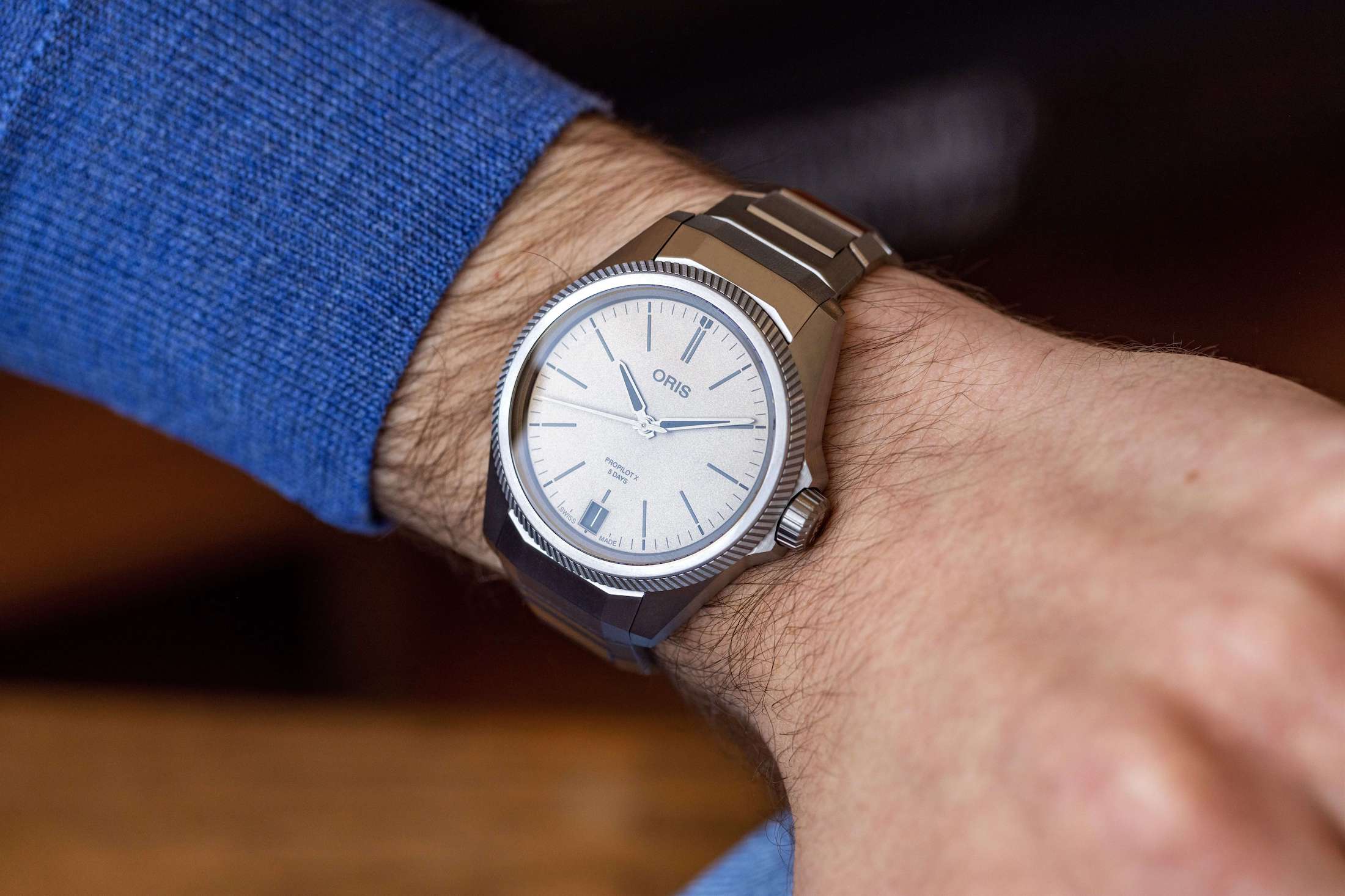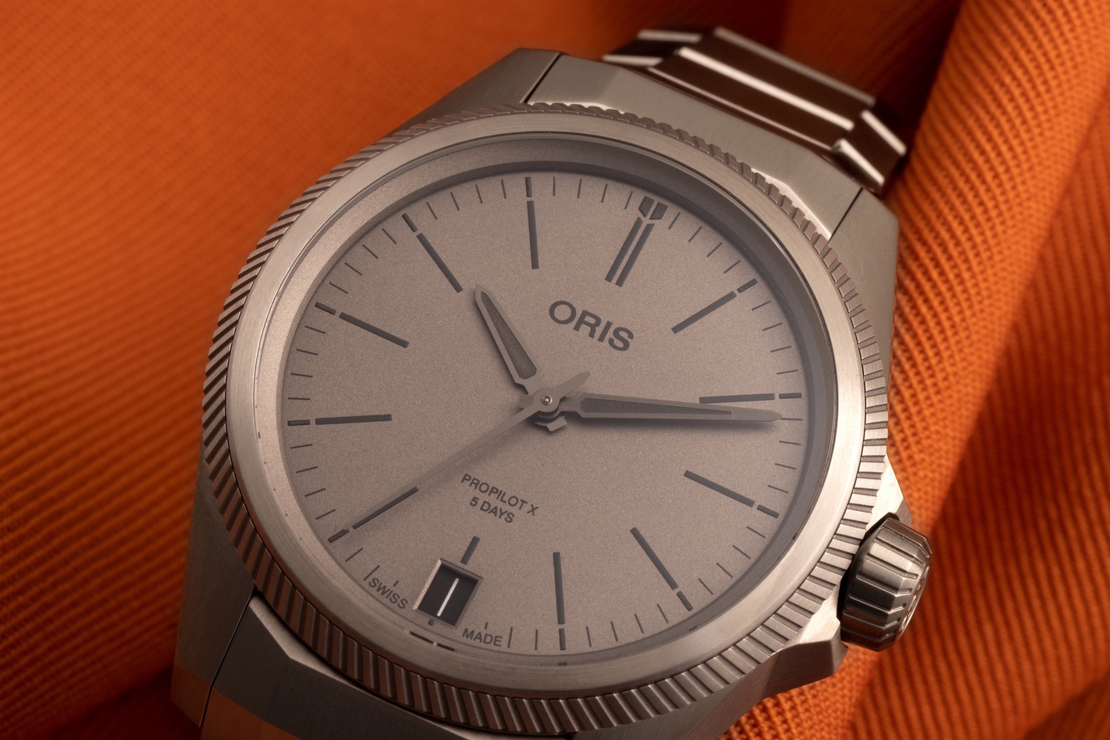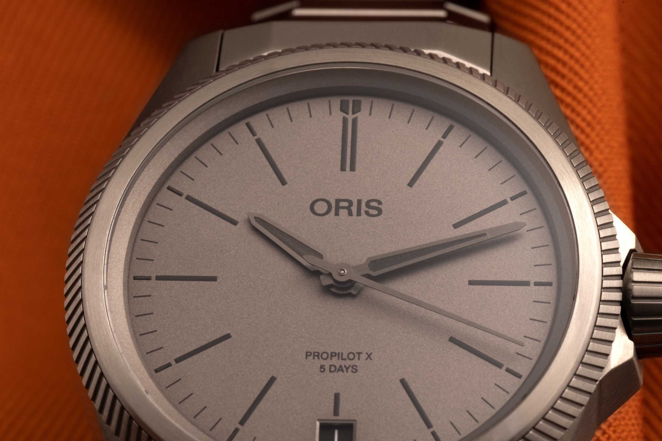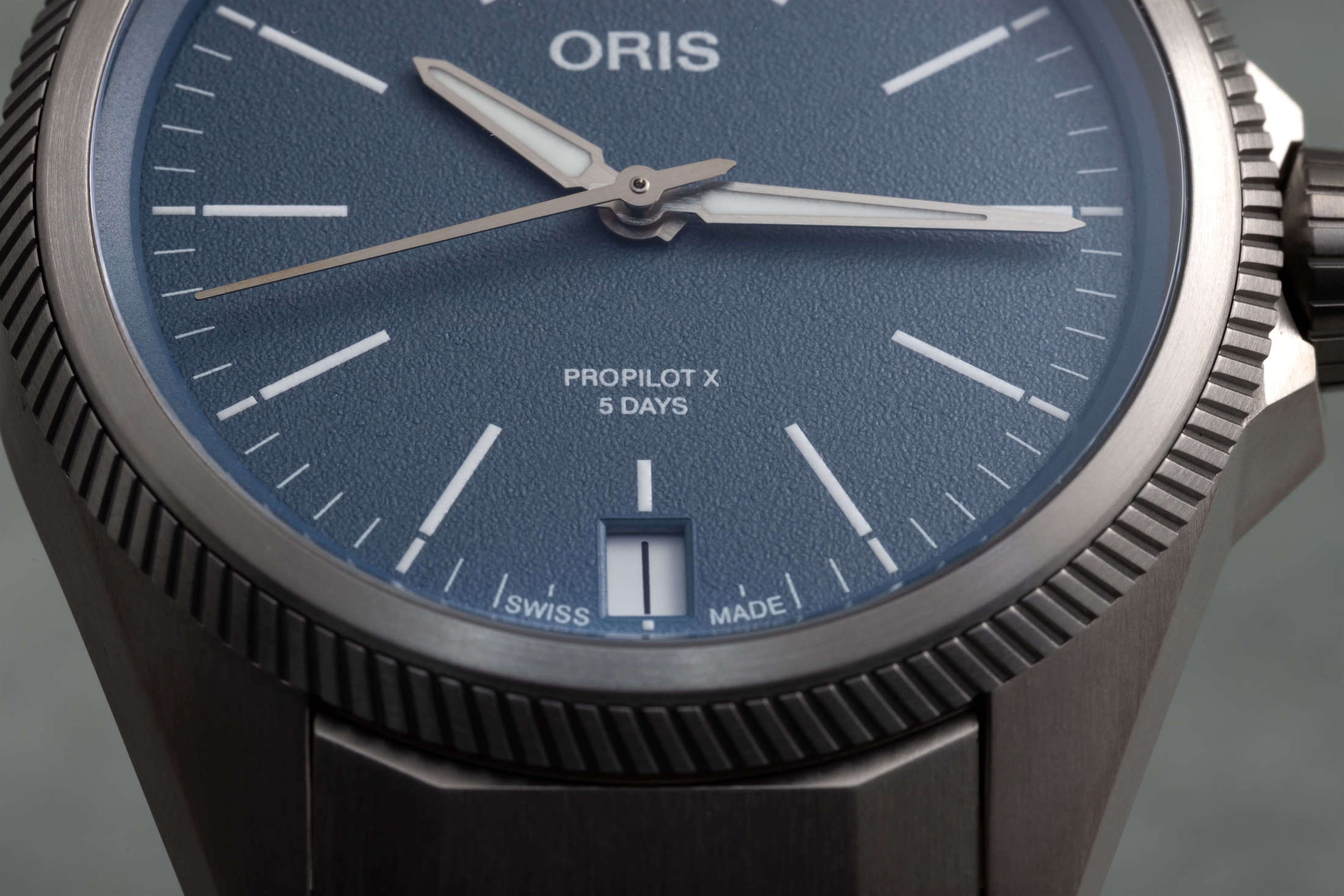 では、プロパイロットX キャリバー400はどこに位置するのだろうか。ちょうどその中間、スイートスポットに位置している。サンドブラストとサテン仕上げが施されたハイテクチタンを採用し、ミニマルなダイヤルデザインは控えめで堂々としており、シンプルなエレガンスを醸し出している。オリスがCal.400を新しいラインに展開するのは時間の問題だった。これまでにアクイスライン、ダイバー65、ビッグクラウン ポインターデイトに搭載されてきた。