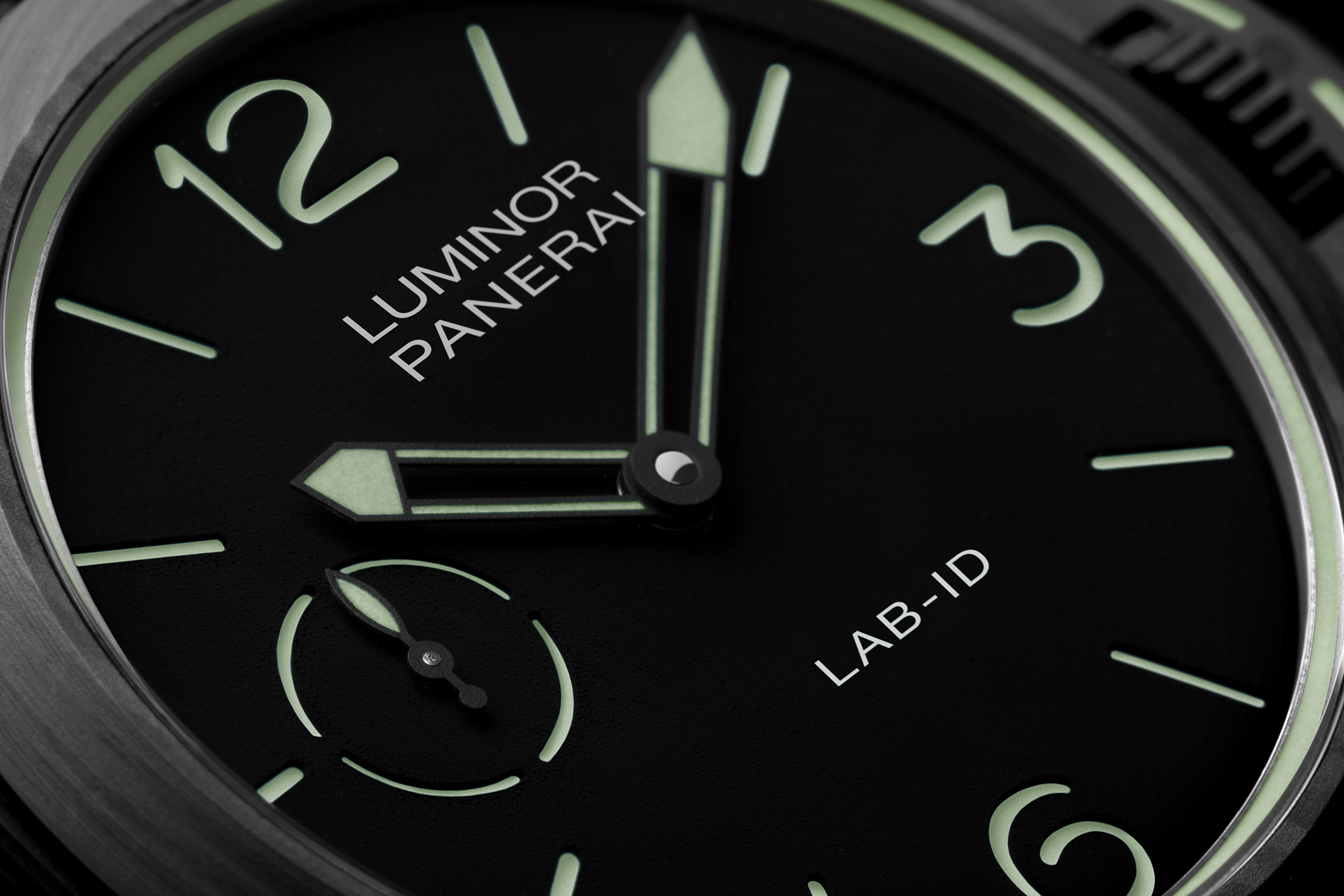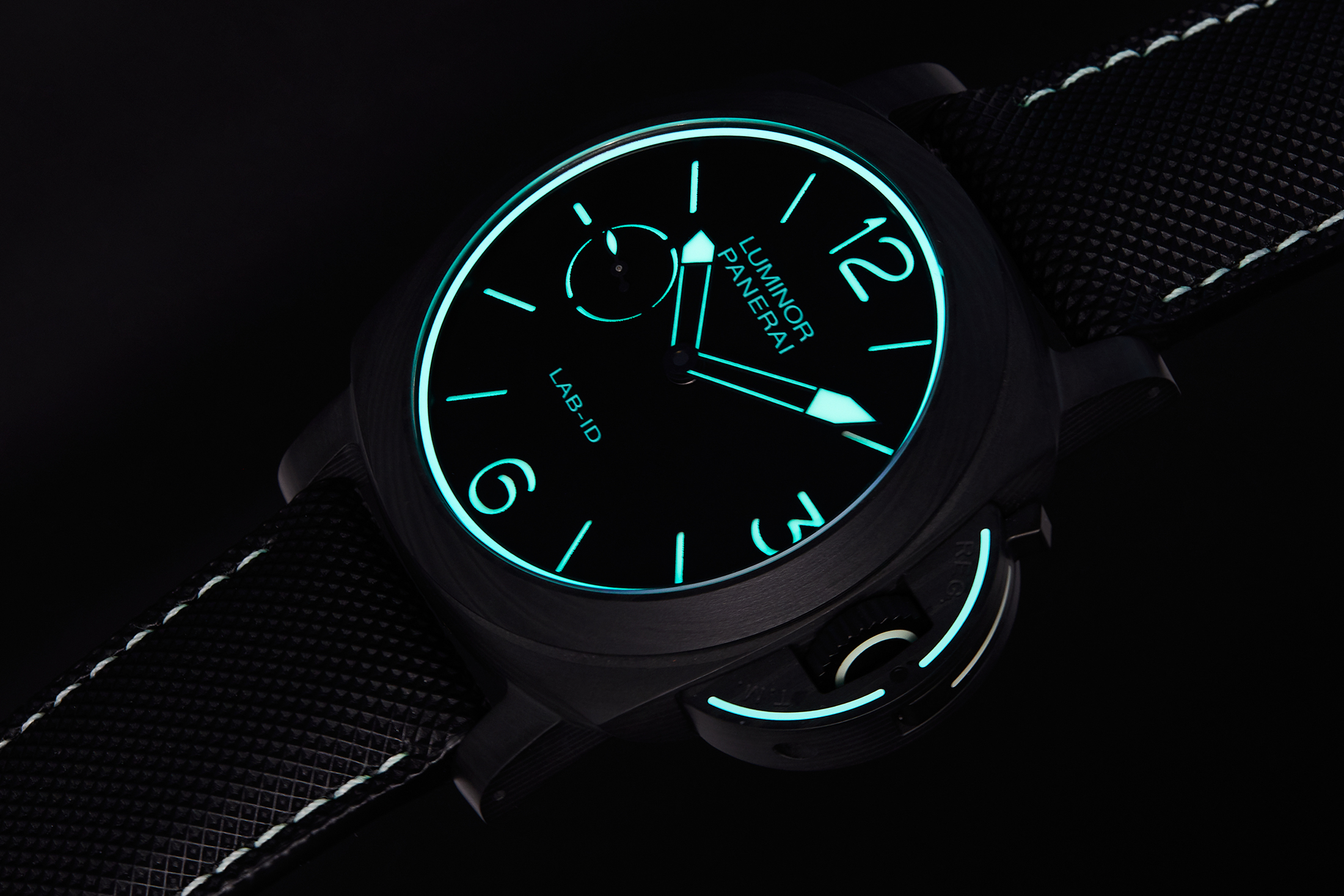 非常に特殊な、ヴィンテージの美しさに大きく依存することが多いブランドにとって、これは完全に現代的な試みといえる。この時計は、標準的なスティールケースの代わりに、カーボテック™素材のケースを採用している。パネライによると、カーボテック™は高反発のカーボンファイバーをベースにした素材で、モータースポーツや航空・バイオメディカル産業で使用されているそうだ。チタンより14%軽く、SSよりも36%軽いといわれている。その外観は、つまり、ケースはマットブラック仕上げである。ダイヤルもブラックで、カーボンナノチューブで覆われており、6時位置にはLAB-ID™の文字があしらわれている。