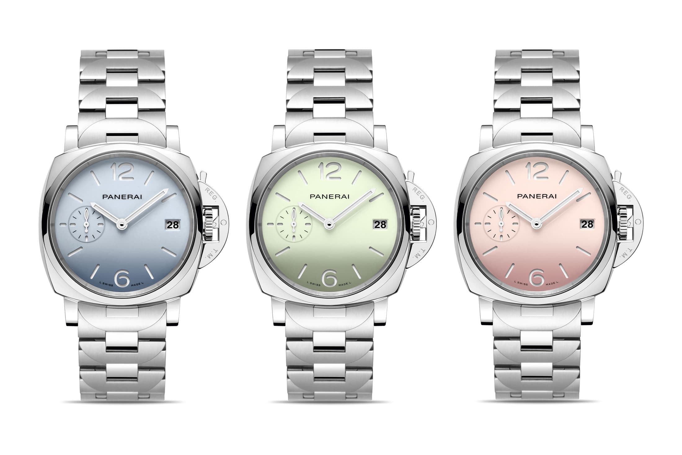 今回ルミノール ドゥエ 38mmにパステルライトブルー(PAM01309)、パステルグリーン (PAM01311)、パウダーピンク (PAM01319)という淡い中間色の文字盤を備えた3モデルが加わりました。同社が‘パステロ’と呼ぶ本作のダイヤルはいずれも12時位置から6時位置にかけてだんだんと濃くなるグラデーションカラーを採用し、パネライがパステルカラーを用いるのはこれがはじめて。