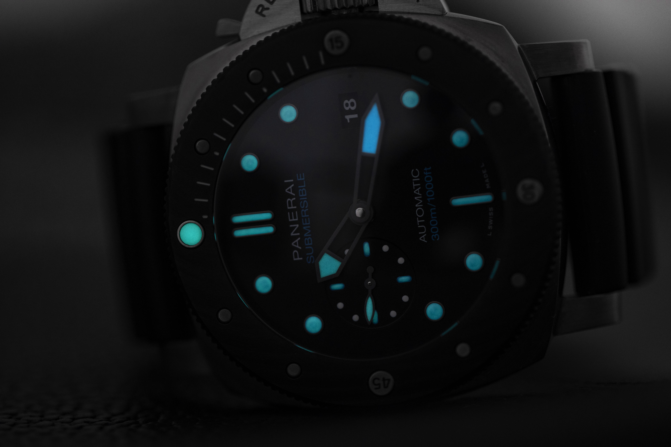 手首に着けた感じは、BMG-TECHケースはSSに最も近いと思うが、手首に座りの良い重さや、着けたときの手首と金属との間の熱の伝わり方という点で、わずかに軽くなっていると思う。まあ、それは仕方がない。何せ私好みの47mmもある大きな時計なのだから。ただし、ルミノール ドゥエコレクションに最近導入された少数のモデルを除き、従来、パネライに小型または超薄型の時計を求める人はまずいない。このような47mmの時計は、深海での極端な防水性能や視認性を必要とする、ダイバー向けツールメーカーとしてのパネライの歴史を最もよく物語っているのではないだろうか。この時計は、300mの防水性能と、大きな夜光インデックスと針を備えている。ベゼルの発光性のピップは明るいグリーンに光り、時間マーカーと時針も同様である。分針は、サイズとブルーの輝きの両方で簡単に区別できる。