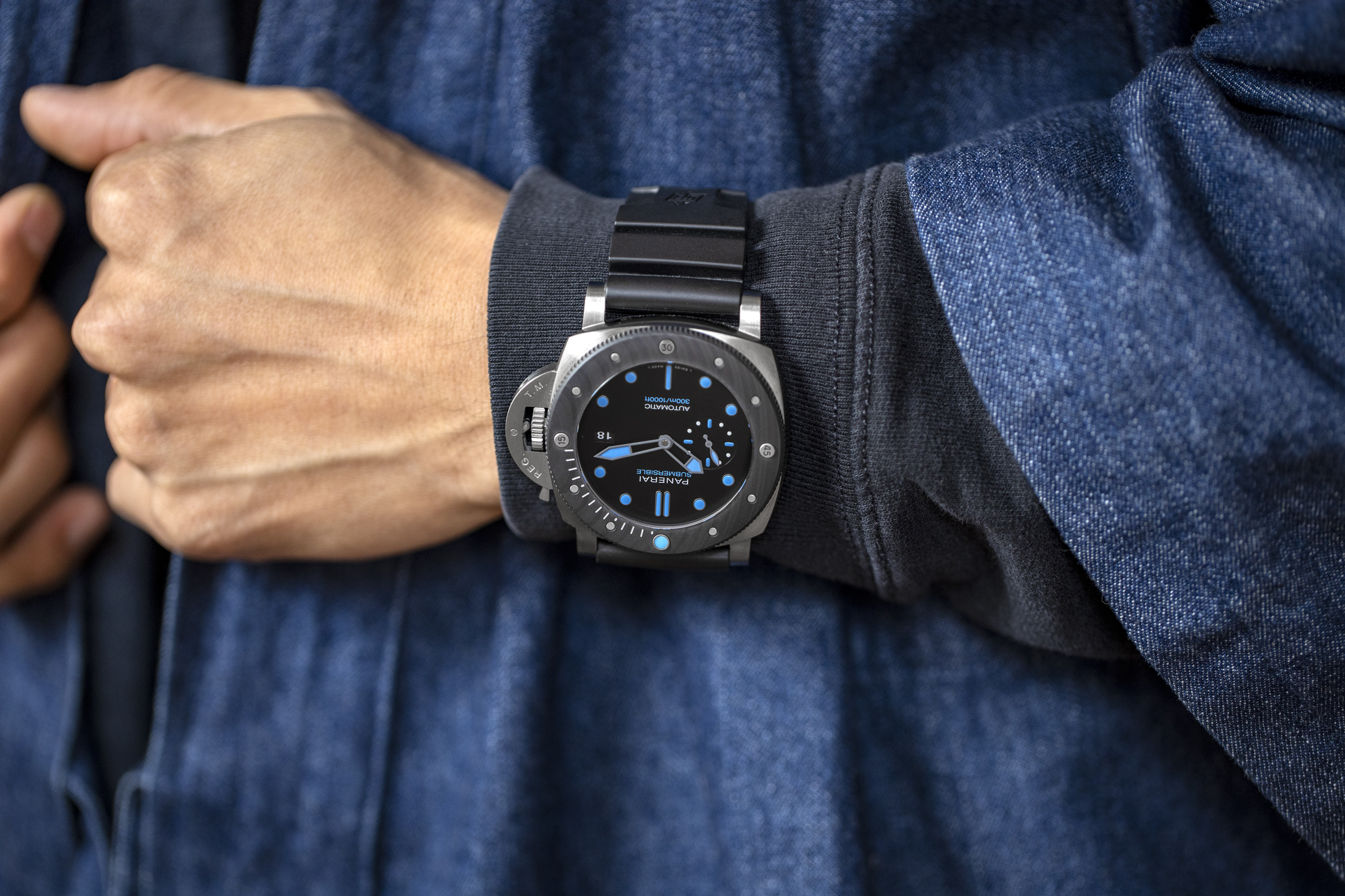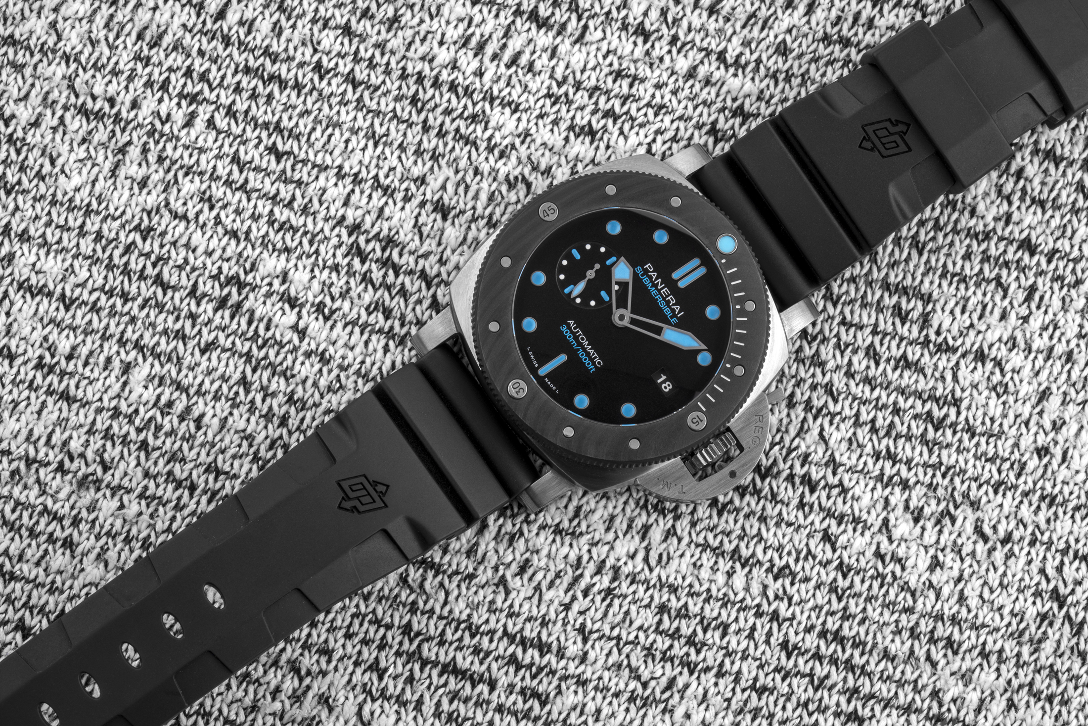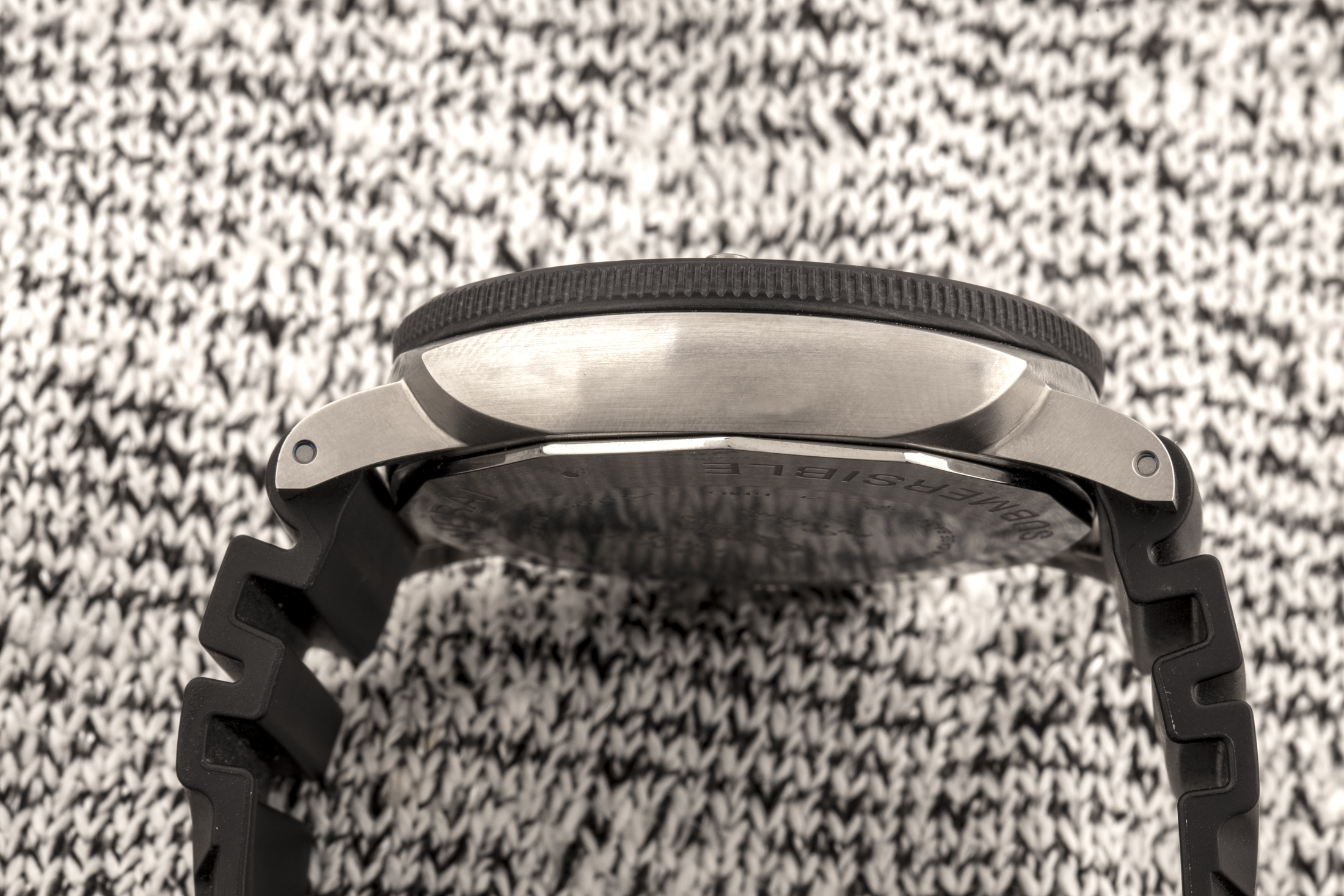 BMG-TECHは、バルク金属ガラスの略称であるが、SSなど従来の時計製造材料の外観と感触を持つように調合された物質で、軽量かつ耐傷性が極めて高く優れたパフォーマンスを発揮する。あなたがそれを見て、そのケースがよくあるSS製だとか、あるいはカーボンベゼルが付いたチタンで作られていると思ったのだとしたら、それは狙い通り、まさに思うつぼだと思う。BMG-TECHを採用することにより、パネライはごく普通の時計に見えるものを作り上げているのだ。従来のサブマーシブルは、結局のところ、ファンに訴えるだけでなく、部屋の向こう側からでも気付いてもらえるようなデザインである。
