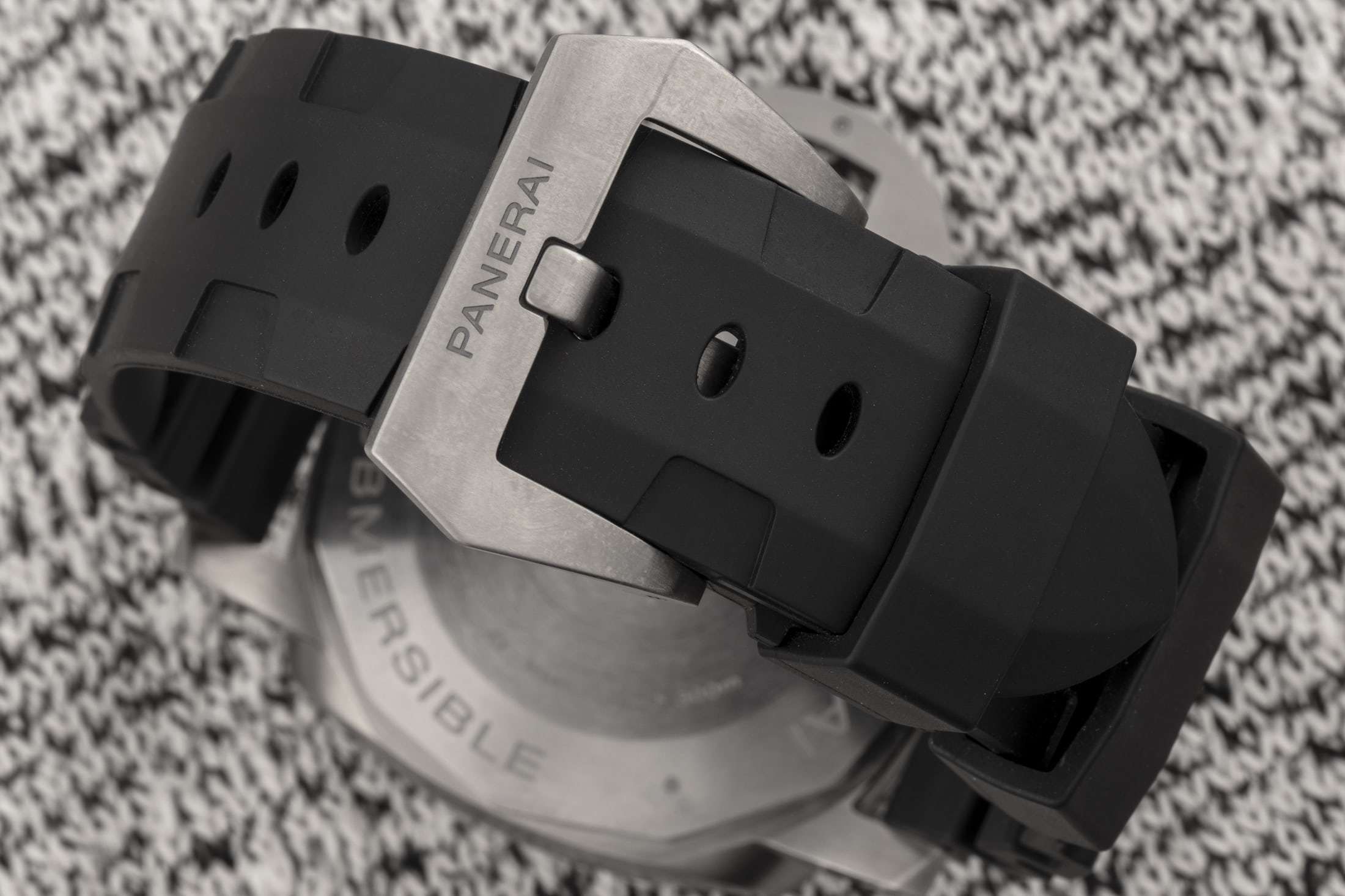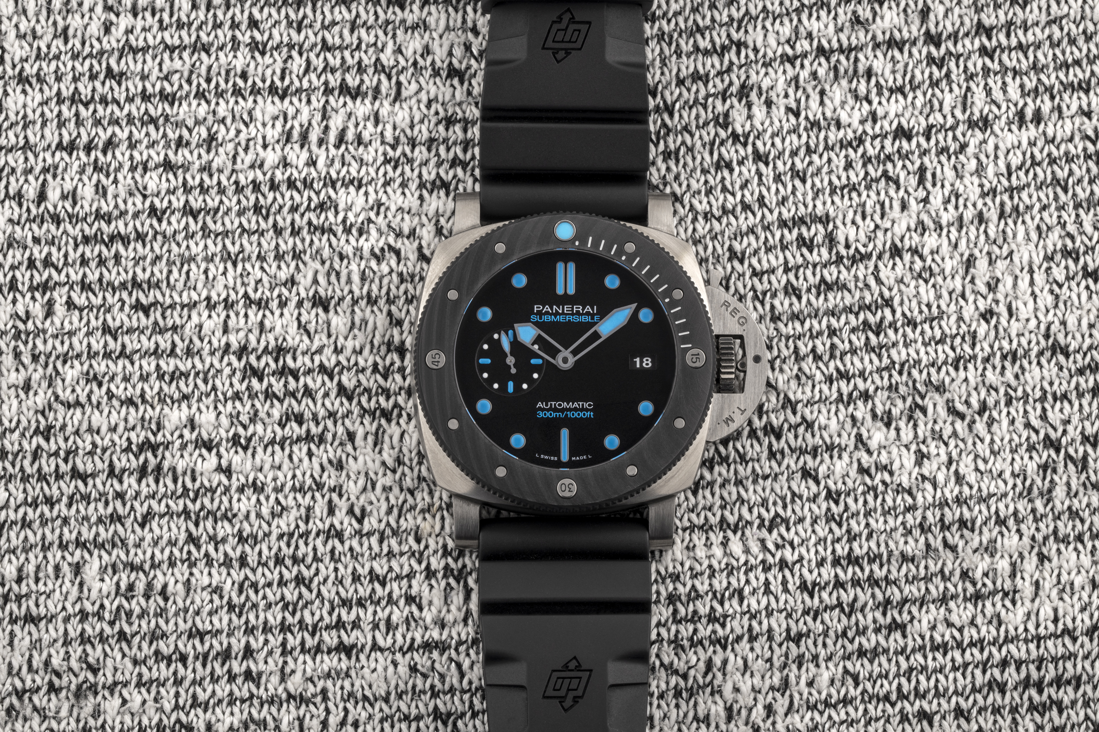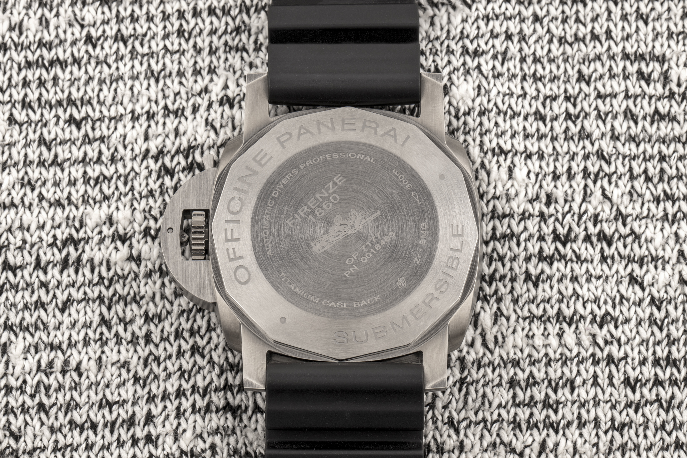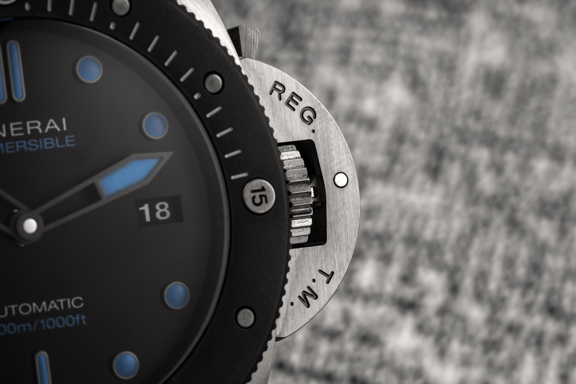 BMG-TECHは、バルク金属ガラスの略称であるが、SSなど従来の時計製造材料の外観と感触を持つように調合された物質で、軽量かつ耐傷性が極めて高く優れたパフォーマンスを発揮する。あなたがそれを見て、そのケースがよくあるSS製だとか、あるいはカーボンベゼルが付いたチタンで作られていると思ったのだとしたら、それは狙い通り、まさに思うつぼだと思う。BMG-TECHを採用することにより、パネライはごく普通の時計に見えるものを作り上げているのだ。従来のサブマーシブルは、結局のところ、ファンに訴えるだけでなく、部屋の向こう側からでも気付いてもらえるようなデザインである。