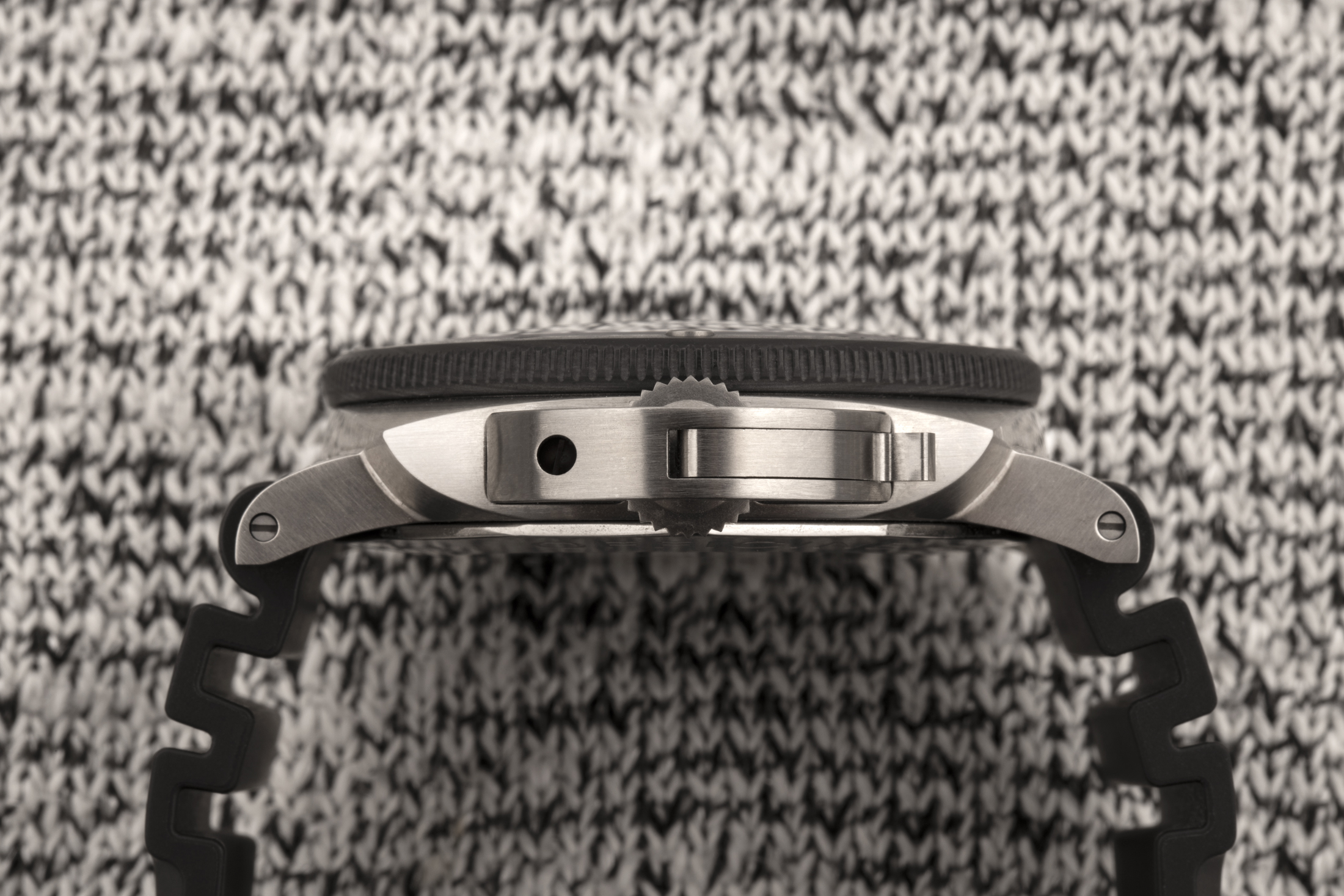 ベゼルは、パネライがカーボテックと呼ぶ別の独自の素材で作られている。カーボンファイバーをベースにした複合材料であるカーボテックは、不均一なマットブラックの見た目とカット方法によって個々に異なる質感を持ち、それぞれのベゼル、ケース、その他のコンポーネントに微妙に異なる外観を与えている。個々のカーボテック製のコンポーネント(本機の場合はベゼルだが、パネライはカーボテック製のケースも製造している)は、カーボンファイバーの薄いシートからプレートを作成することで形成されるが、このプレートはPEEK(ポリエーテルエーテルケトン)として知られるポリマーと共に圧縮される。