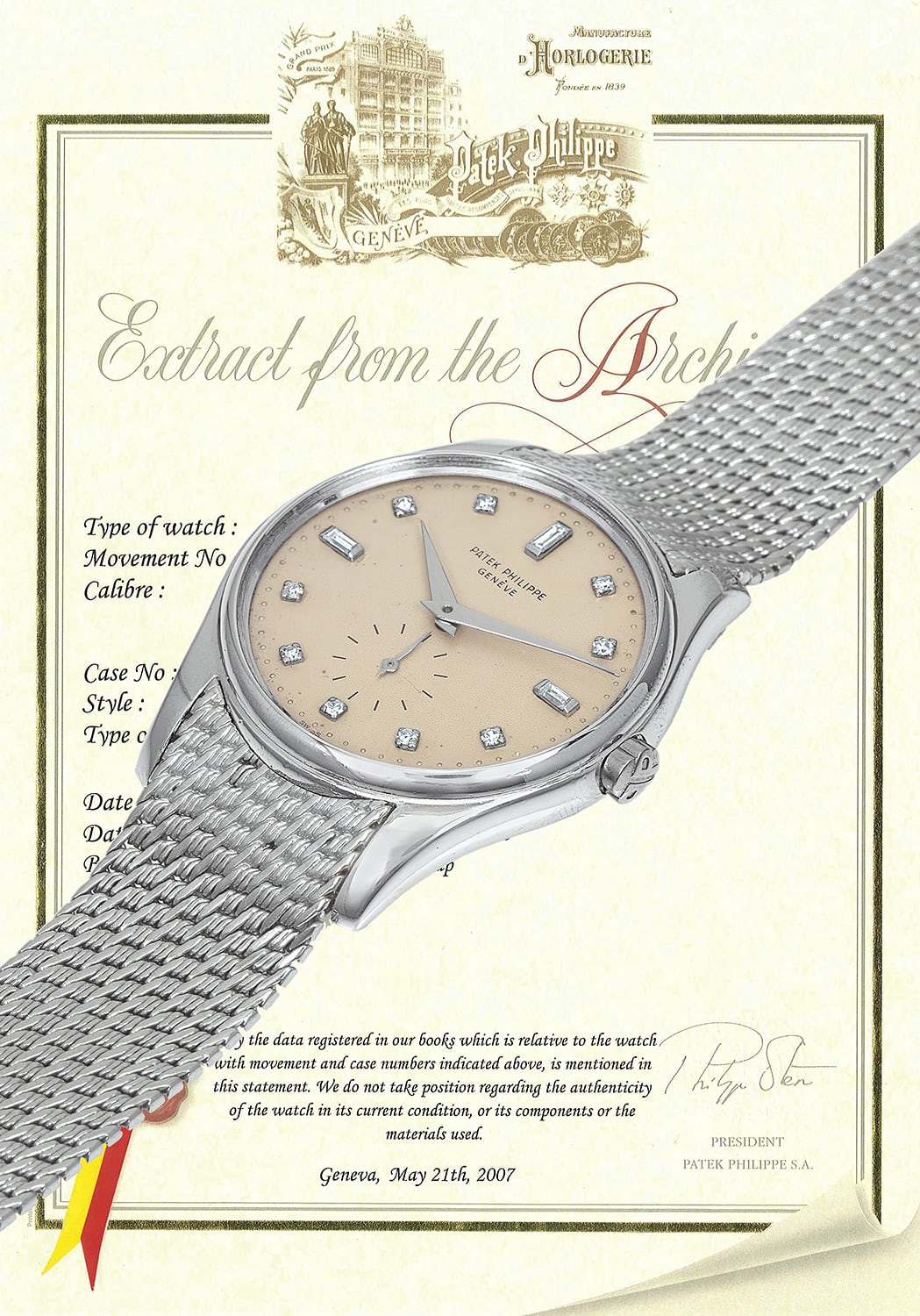 1950年代半ばのRef.2526の小売価格は、レザーストラップのイエローゴールドモデルが2000スイスフラン強、ダイヤモンドマーカー付きのプラチナモデルが5500スイスフランという驚異的な価格だった。その間には、ローズゴールド、イエローゴールド、ホワイトゴールドのエナメルダイヤル、ブレスレットの有無などバリエーションが派生したが、ゴールド(プラチナではない)製ブレスレット付きの標準的なRef.2526が3400スイスフラン程度だったと仮定すると、イメージが掴めるのではないだろうか。なぜそれが驚くべき価格なのか? それは、当時世界で唯一存在していた永久カレンダー クロノグラフであるRef.2499が、約3800スイスフランで販売されていたからである。つまり、ブレスレット付きのRef.2526は、新品価格においてRef.2499に比肩したのだ。信じられない話だが、ここでもまた、Ref.2526はパテックがそれを世に送り出して以来、常に何か特別なものであり続けてきたという私の主張を繰り返すことになる。